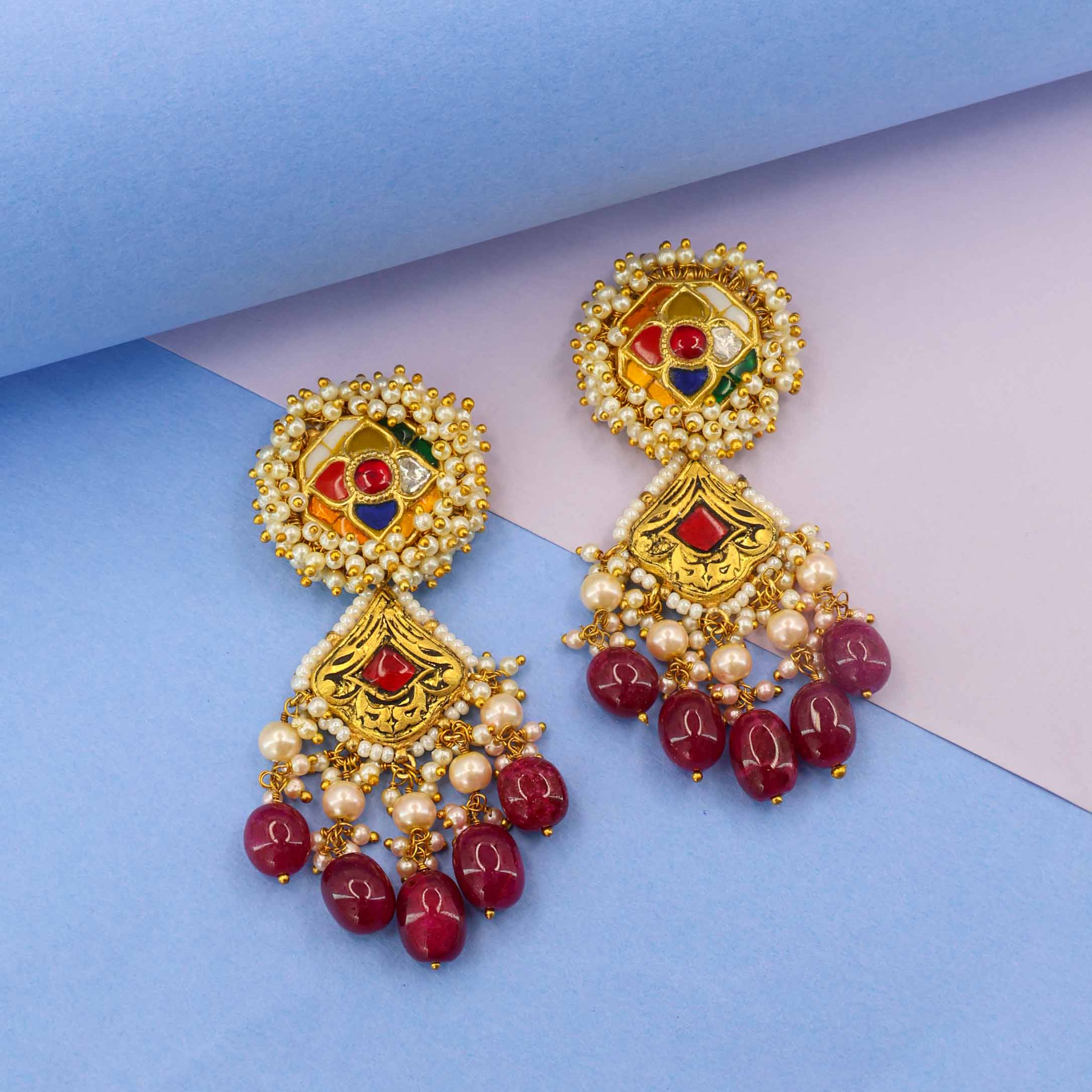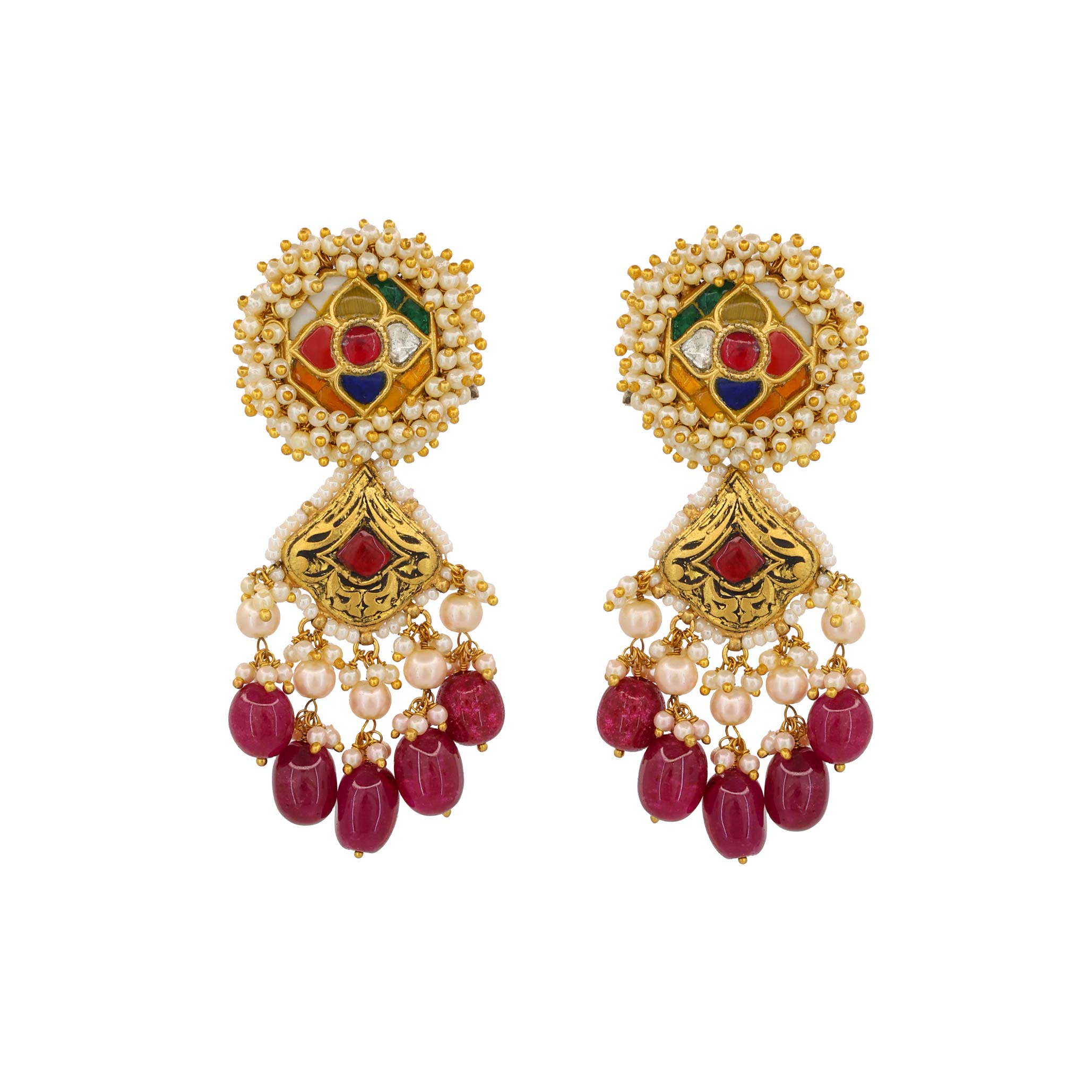 These stunning earrings feature a central **Navratna** (nine gems) design, with vibrant glass-filled stones in a traditional setting. The intricate gold and enamel work is complemented by dangling strands of lustrous pearls and deep red **ruby** beads, creating a beautiful and classic look.