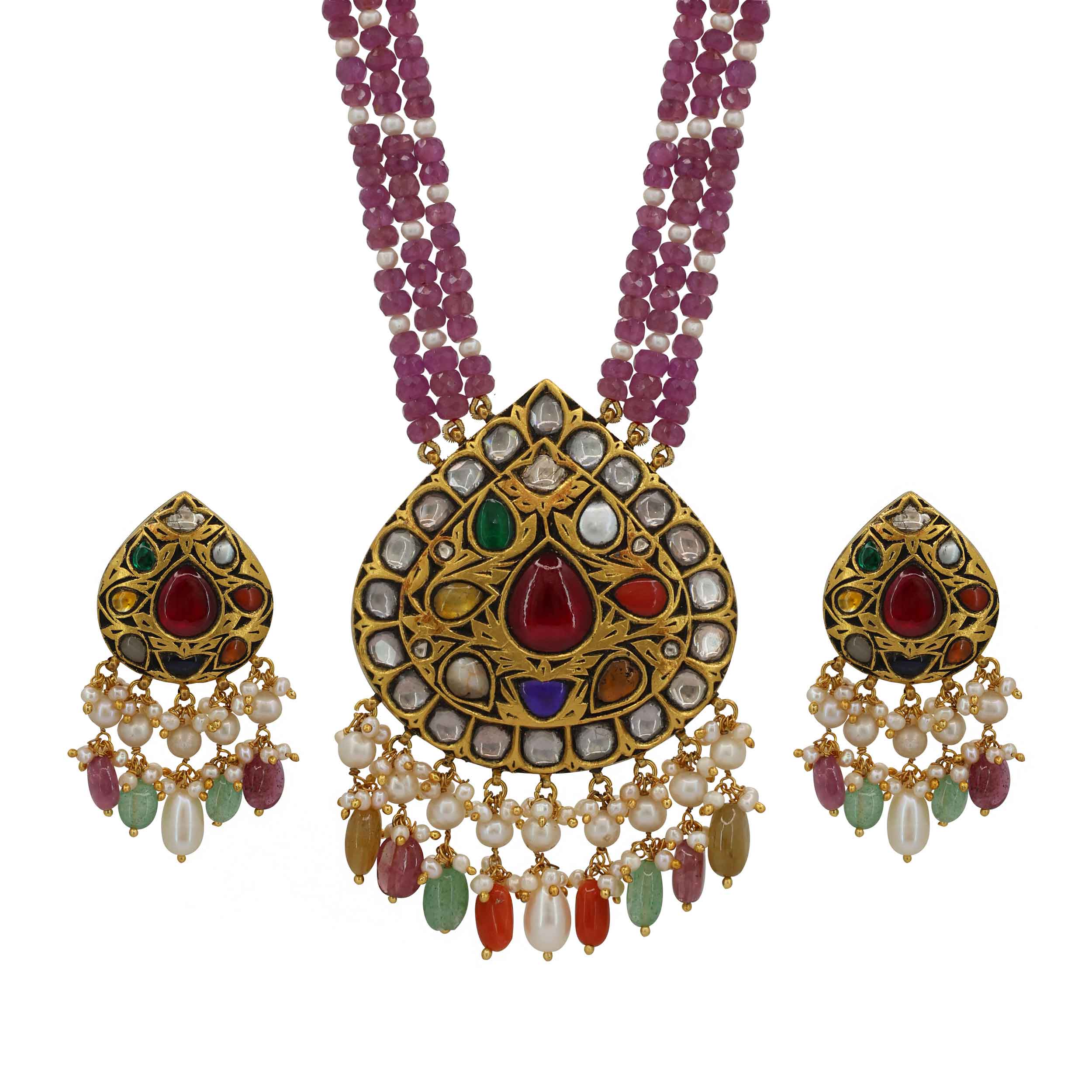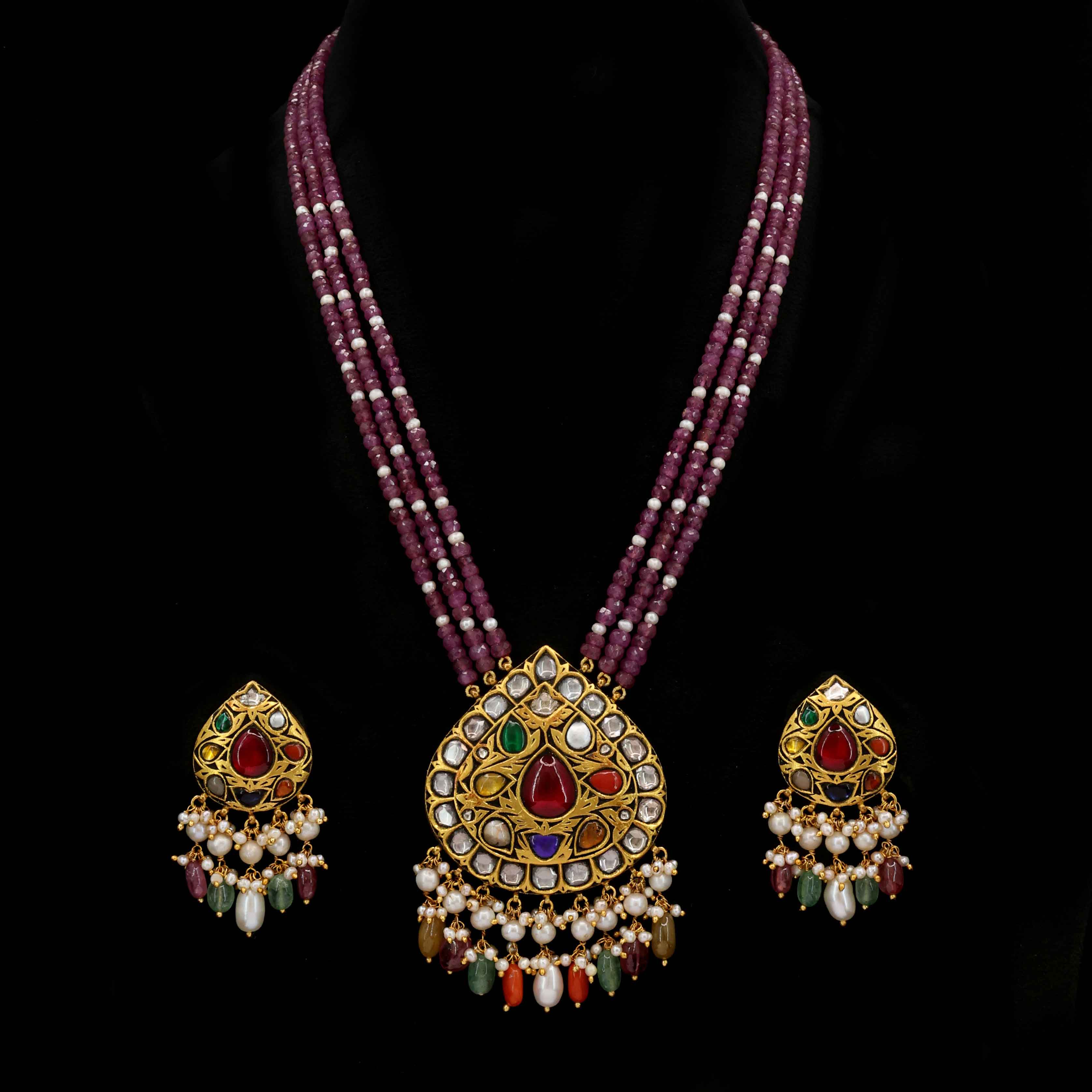 This exquisite Gold Moissanite and Navratna set features a vibrant pendant and matching earrings adorned with nine auspicious gemstones. Handcrafted with precision, it is elegantly stringed with glass ruby beads and pearls, blending traditional Indian heritage with timeless sophistication for a regal, festive look.