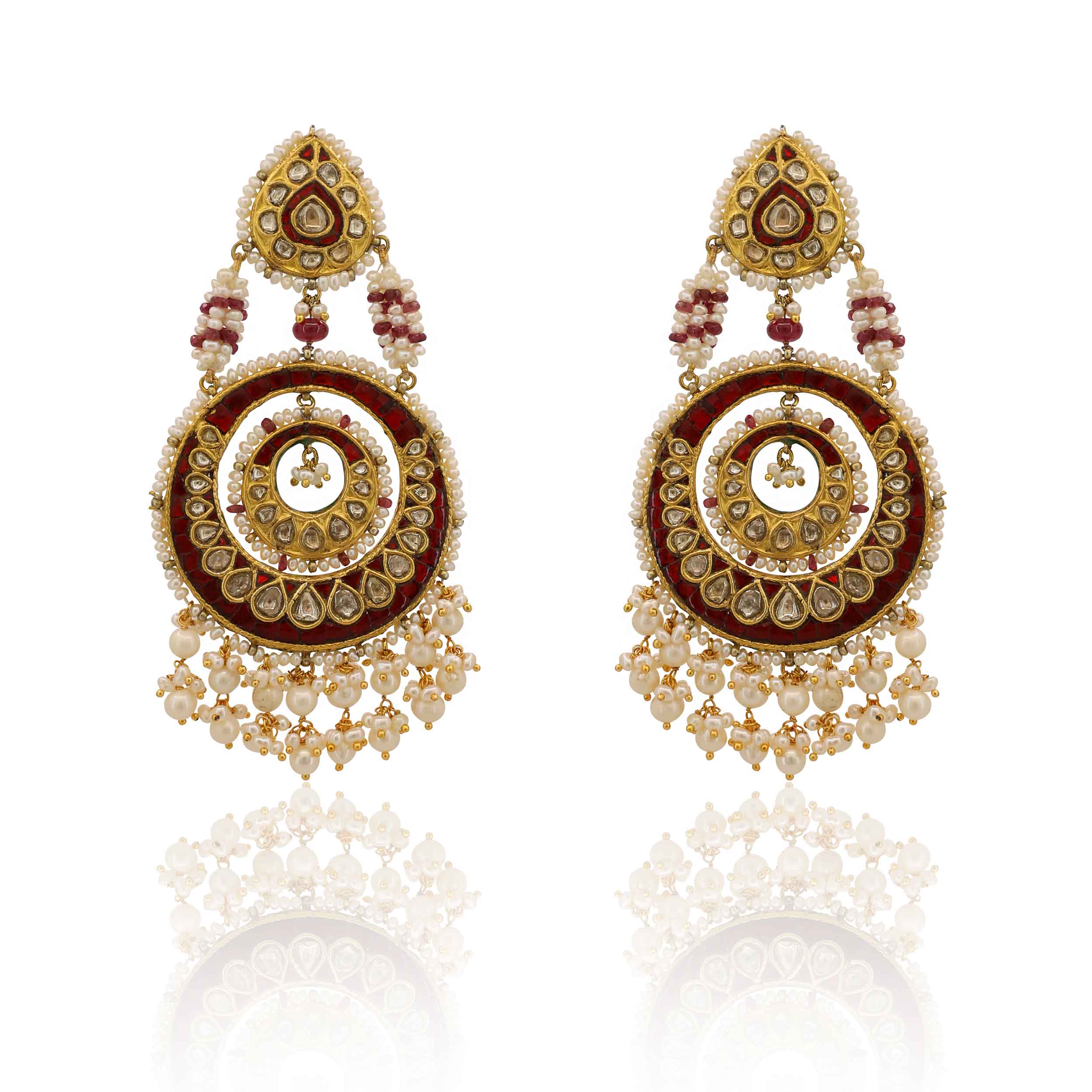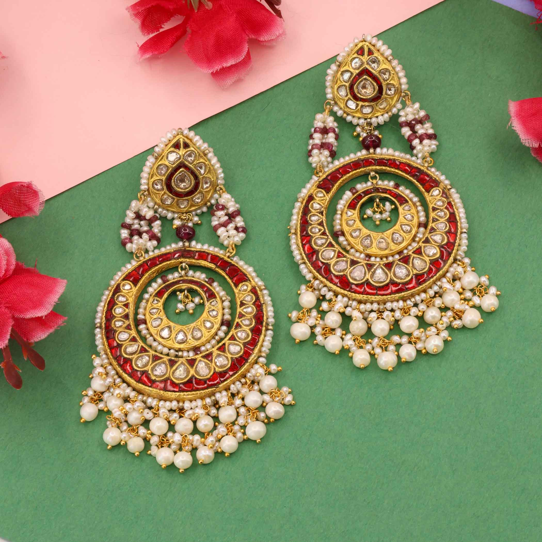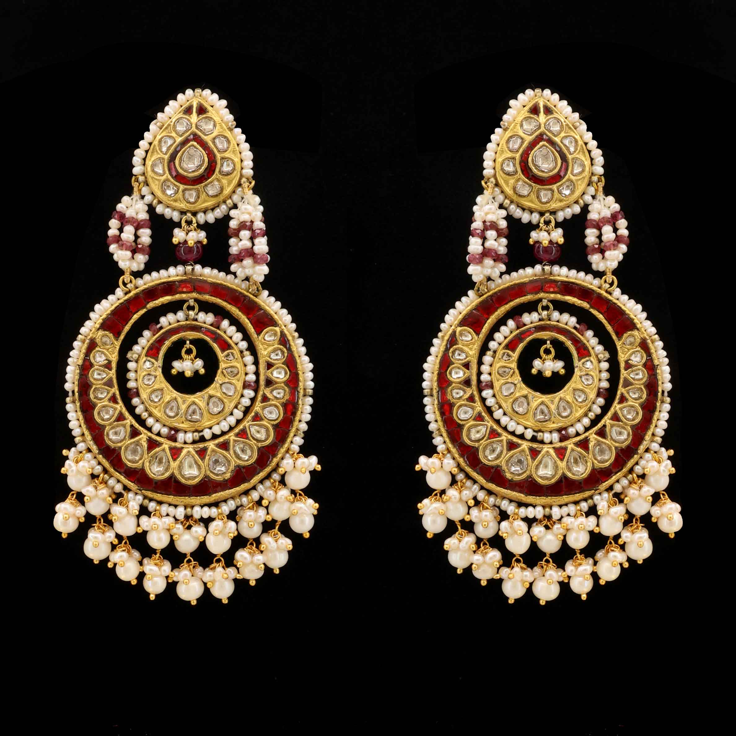 Dramatically regal, these large concentric Chandbali earrings feature Syndicate Polki diamonds set in gold. The prominent circles are adorned with vibrant red glass filling (Ruby), creating a Meenakari effect. Cascading pearl drops complete the look, making these a truly stunning statement piece for any grand occasion.