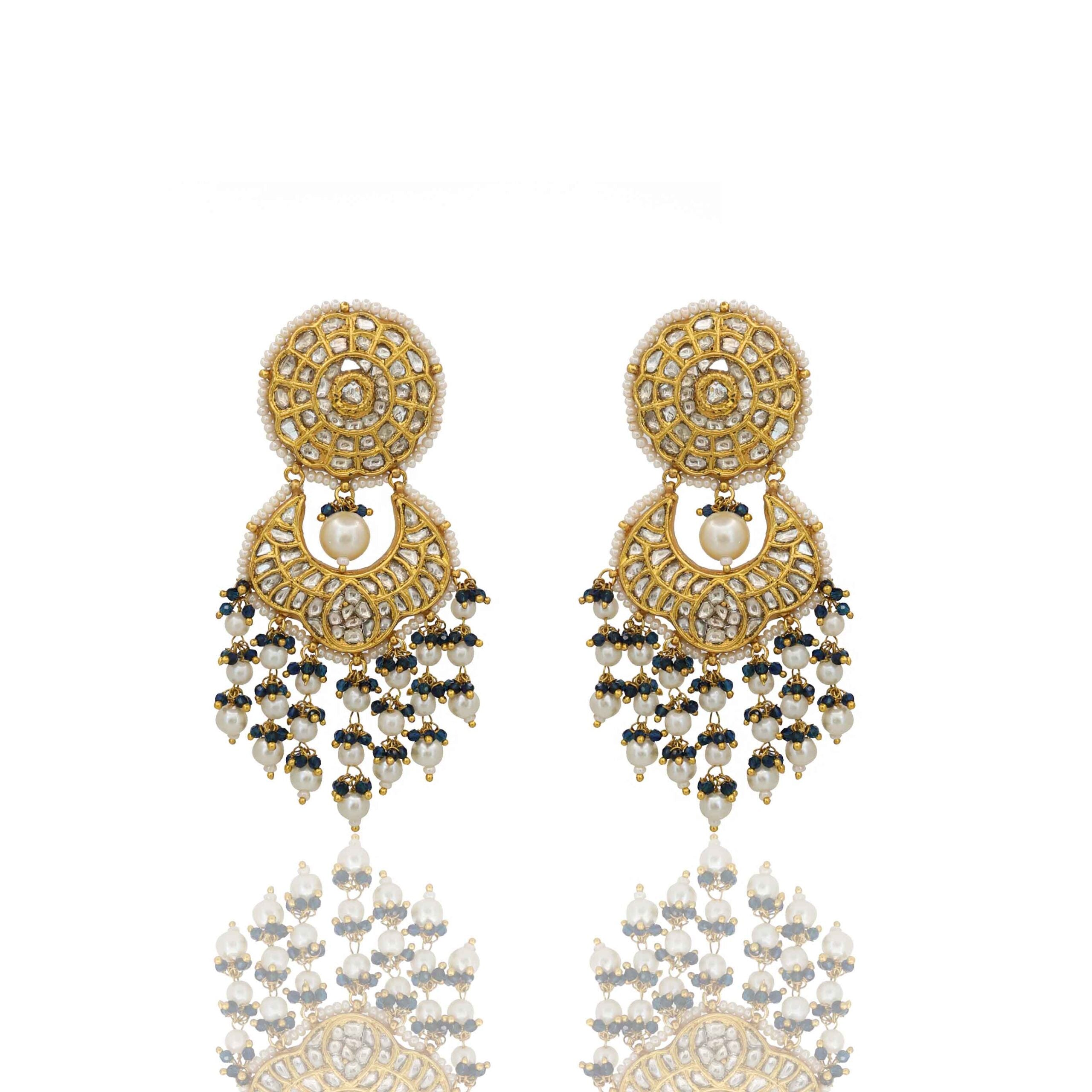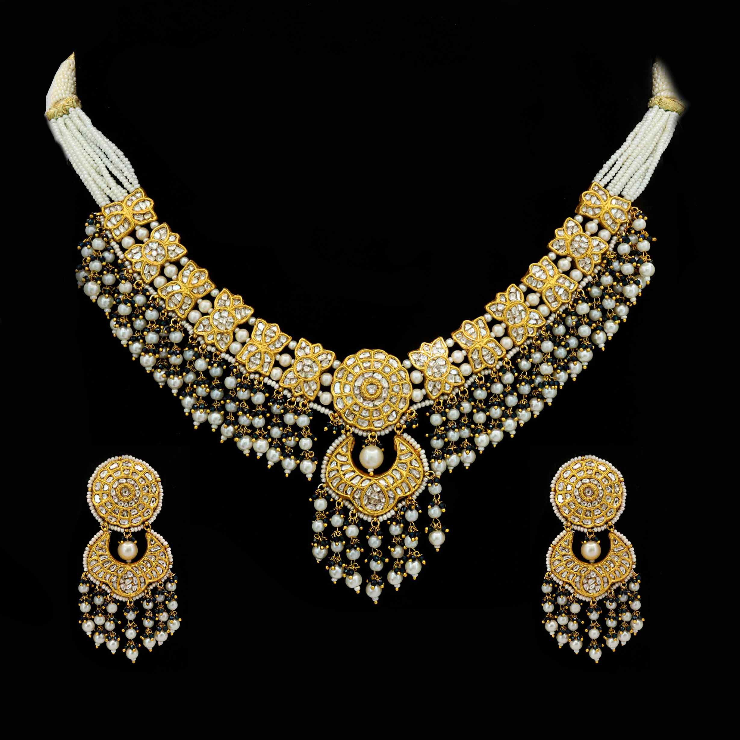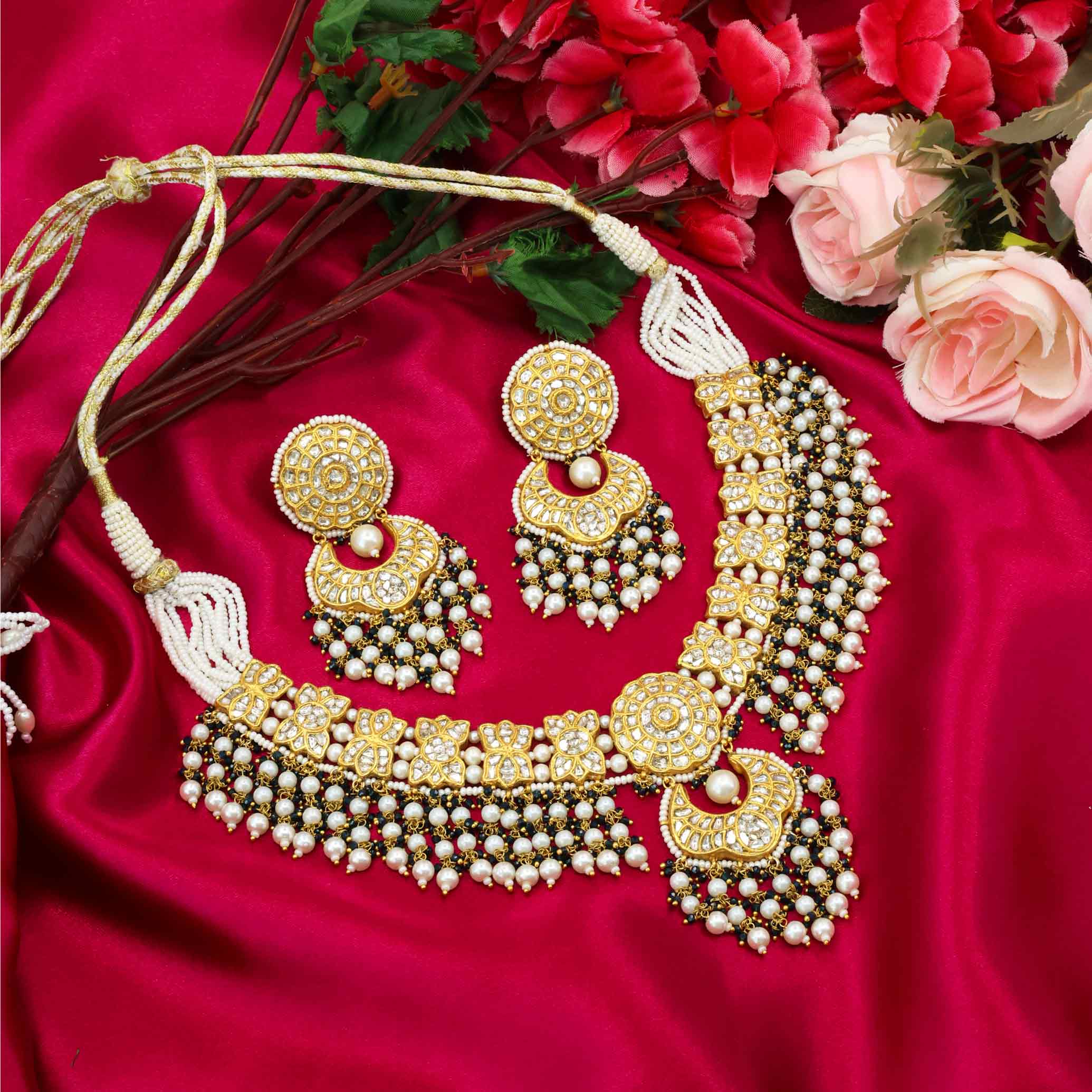 This captivating gold necklace set, crafted in Jaipur, features natural polki diamonds in an intricate design. It’s elegantly strung with lustrous freshwater pearls and delicate black glass-filling beads, culminating in a timeless and sophisticated ensemble perfect for any grand occasion.