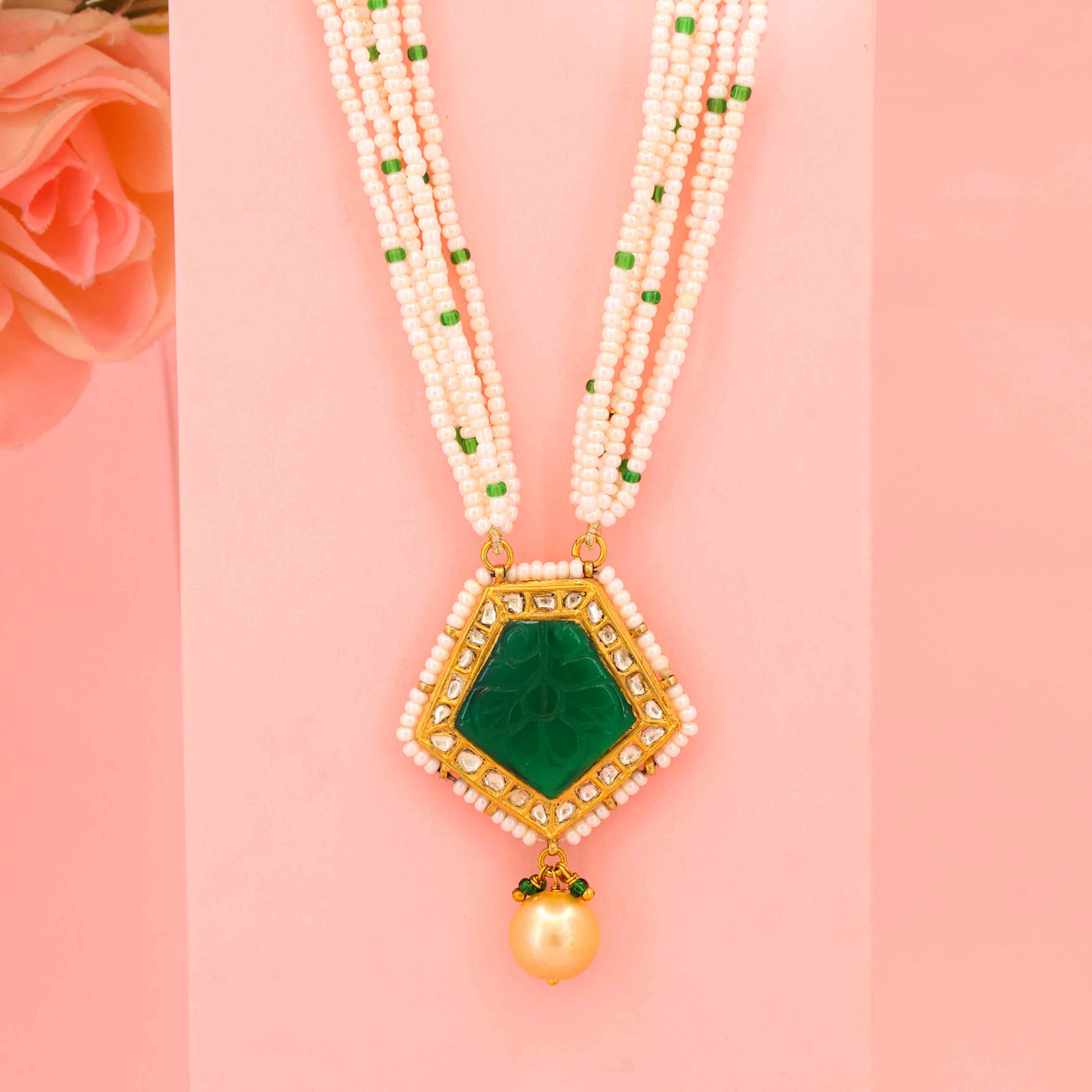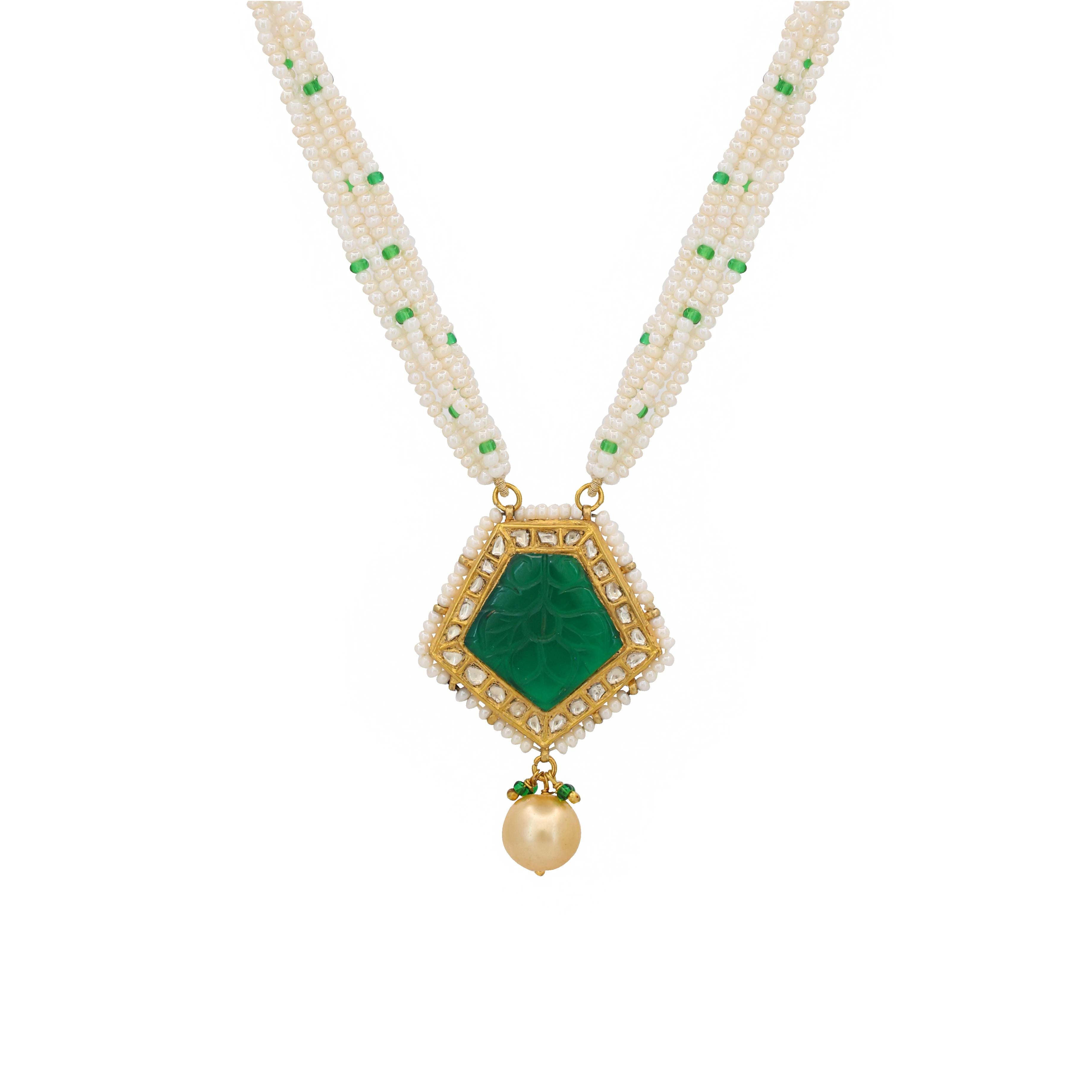 This gold pendant necklace features a striking green glass-filled emerald and natural syndicate diamond polki. The pendant hangs from a delicate string of pearls and glass beads, creating a beautiful and elegant piece of jewelry.