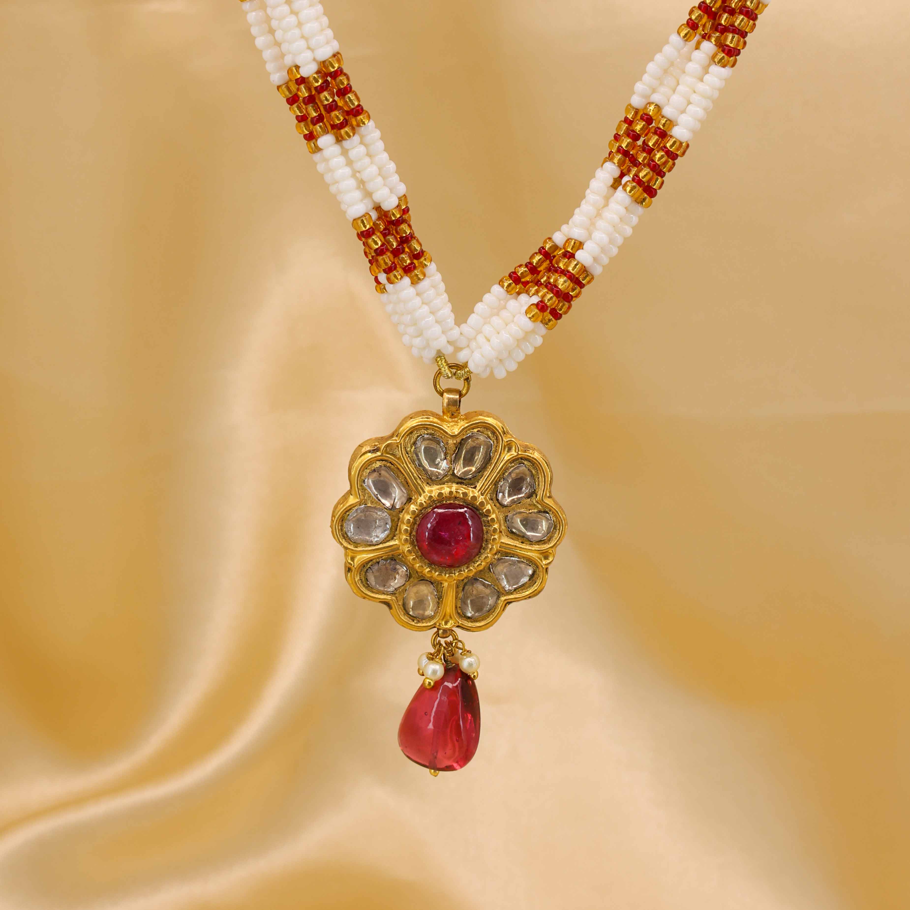 This gold floral pendant is set with natural Syndicate Polki diamonds and a central glass filling ruby, from which a vibrant drop hangs. The pendant is strung on a necklace of pearls and glass filling beads arranged in a striking pattern.