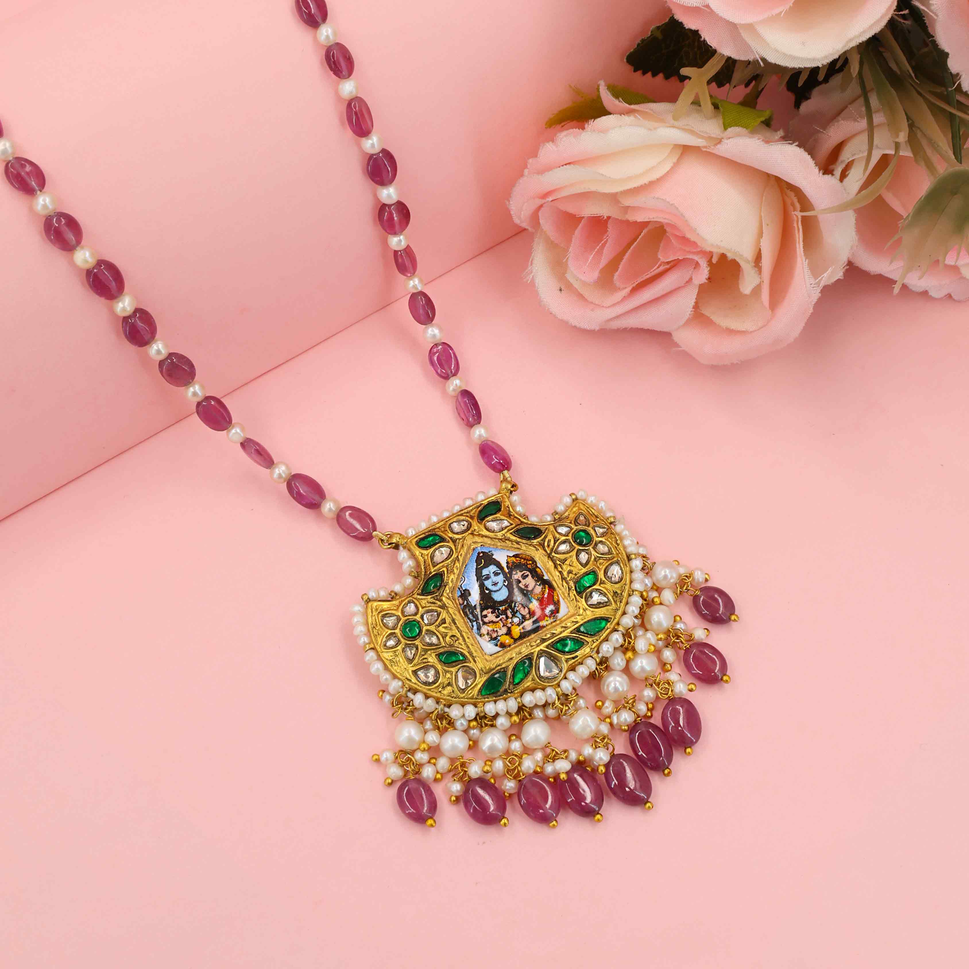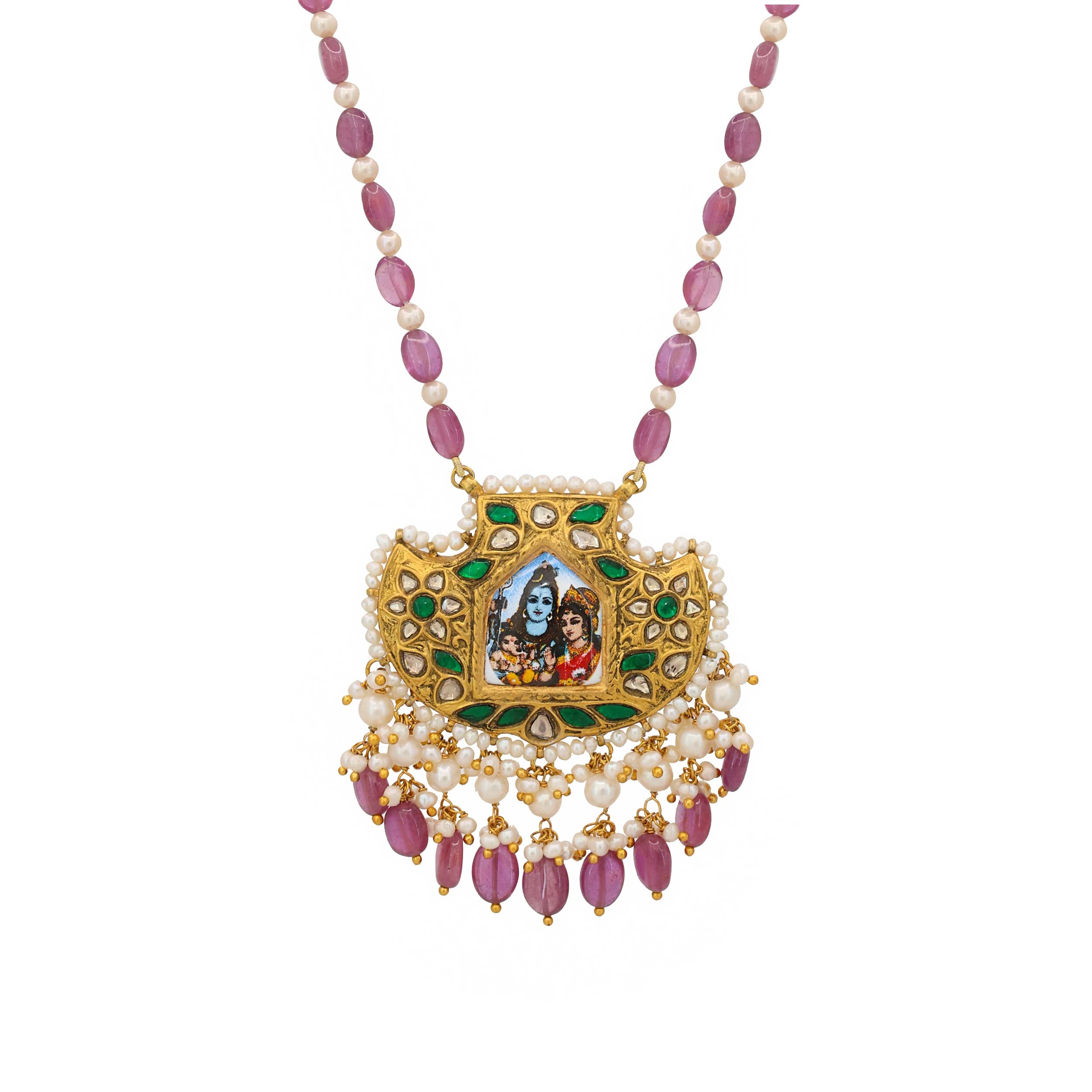This striking gold pendant features a hand-painted depiction of Lord Shiva and Parvati, surrounded by natural Syndicate Polki diamonds and green glass filling stones. The necklace is strung with glass ruby and pearls, with drops of pearls and rubies dangling below the pendant.