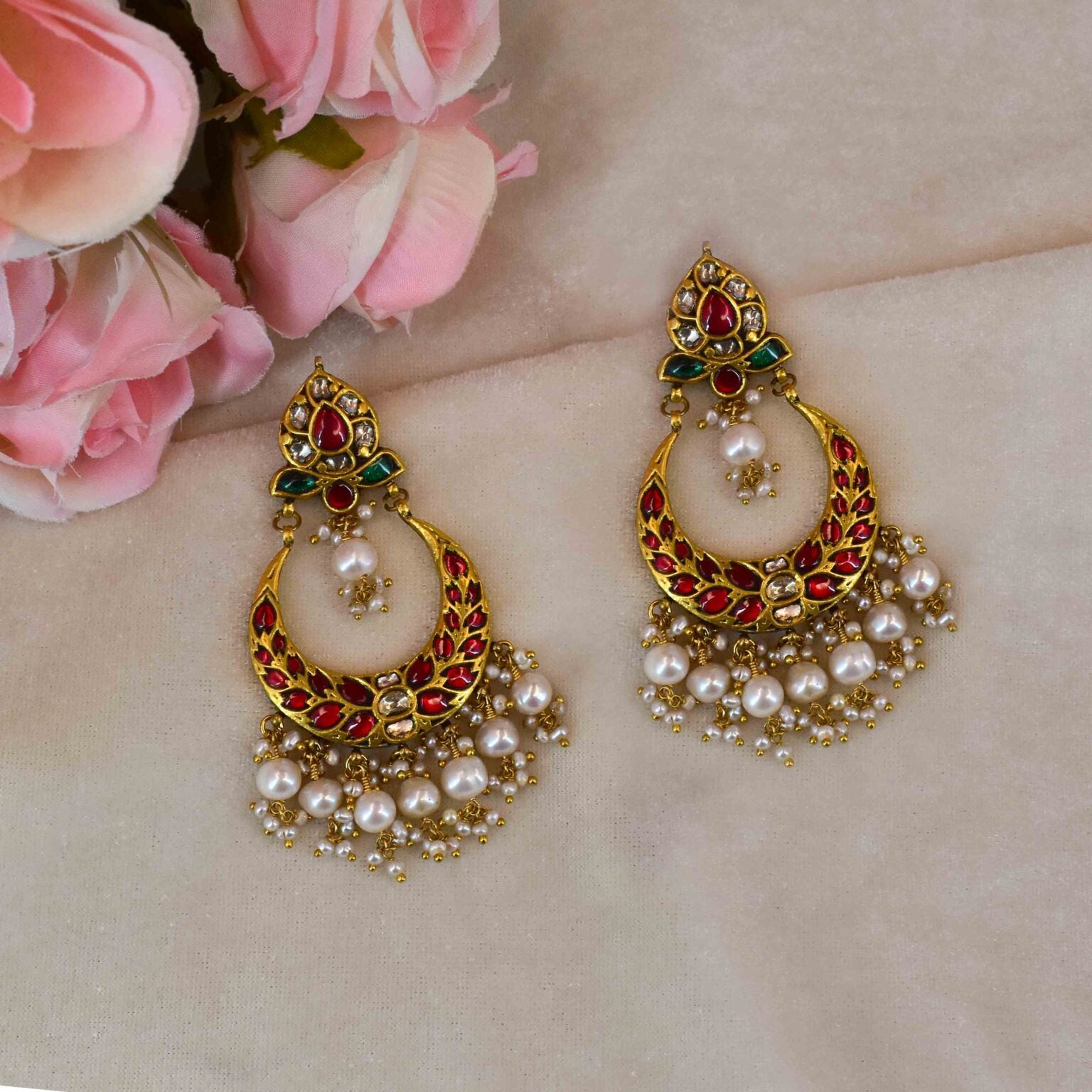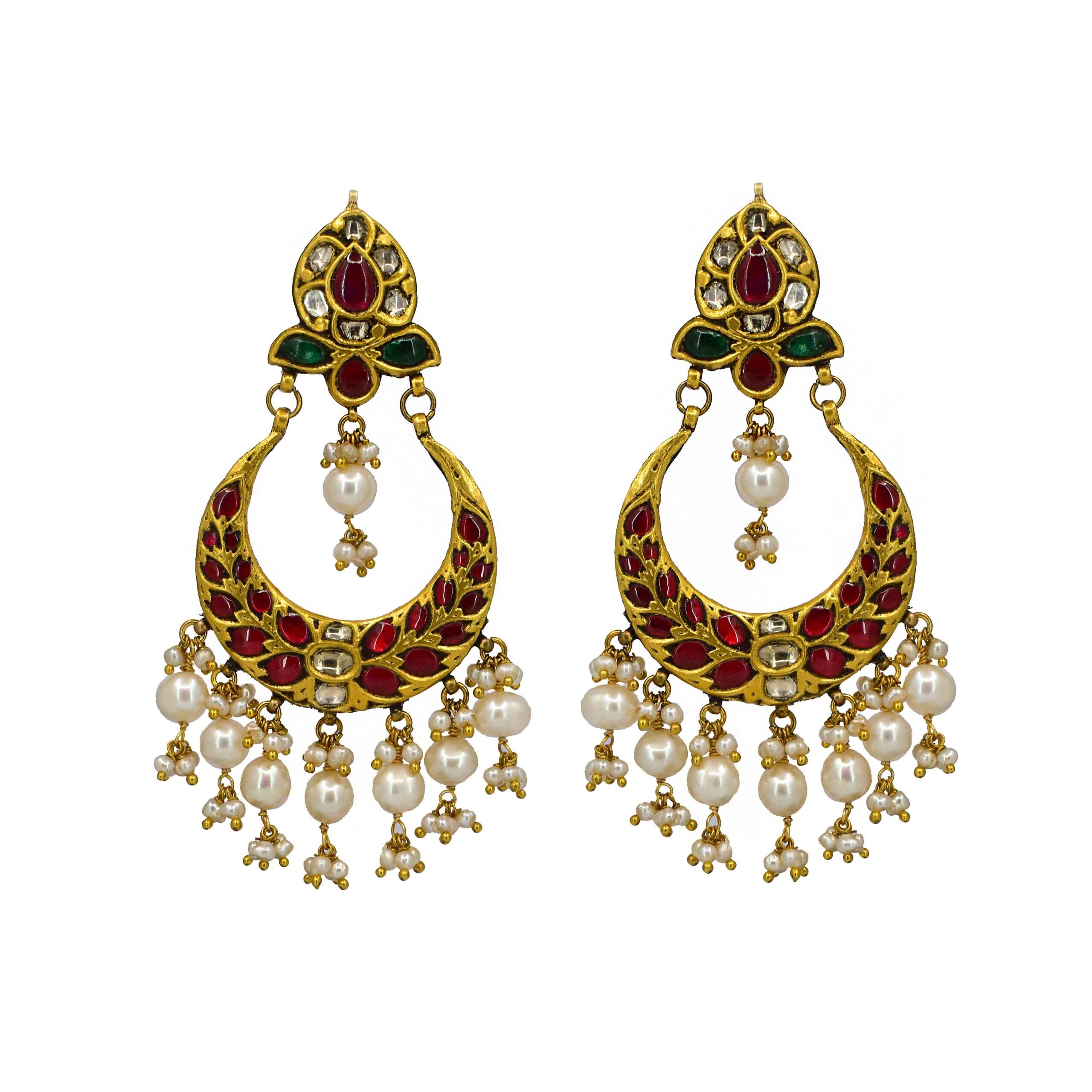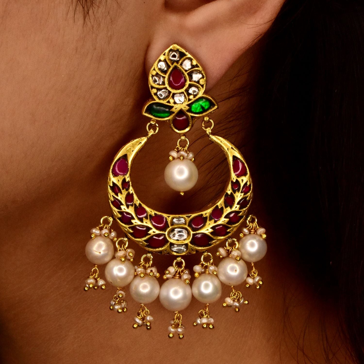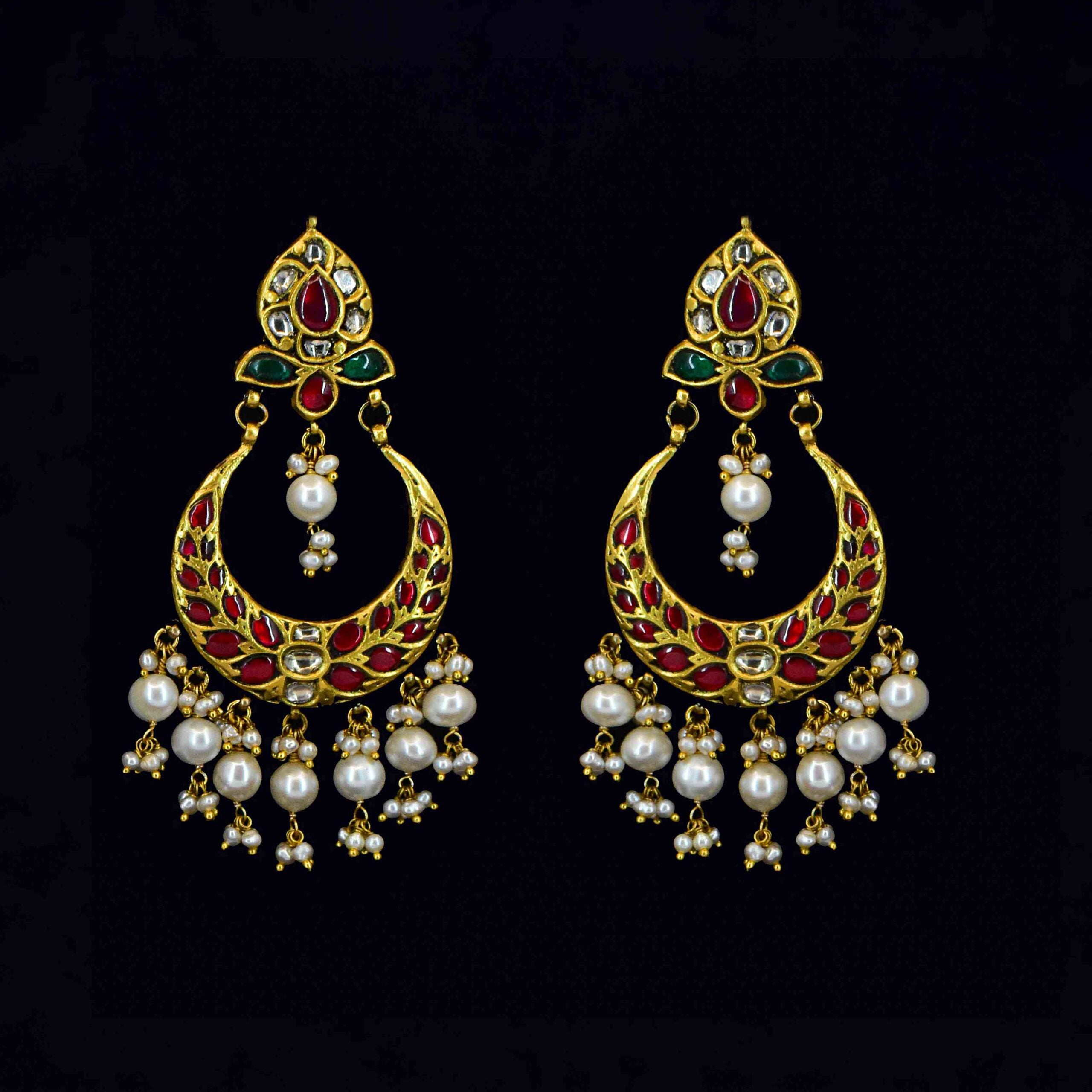 This exquisite partash chandbali showcases fine craftsmanship, featuring a graceful crescent shape embedded with glittering polki and vibrant red and green gemstones. The delicate design is enhanced by strings of natural pearls, adding elegance and movement. Rich in traditional artistry, this chandbali radiates opulence, perfect for timeless, royal allure.