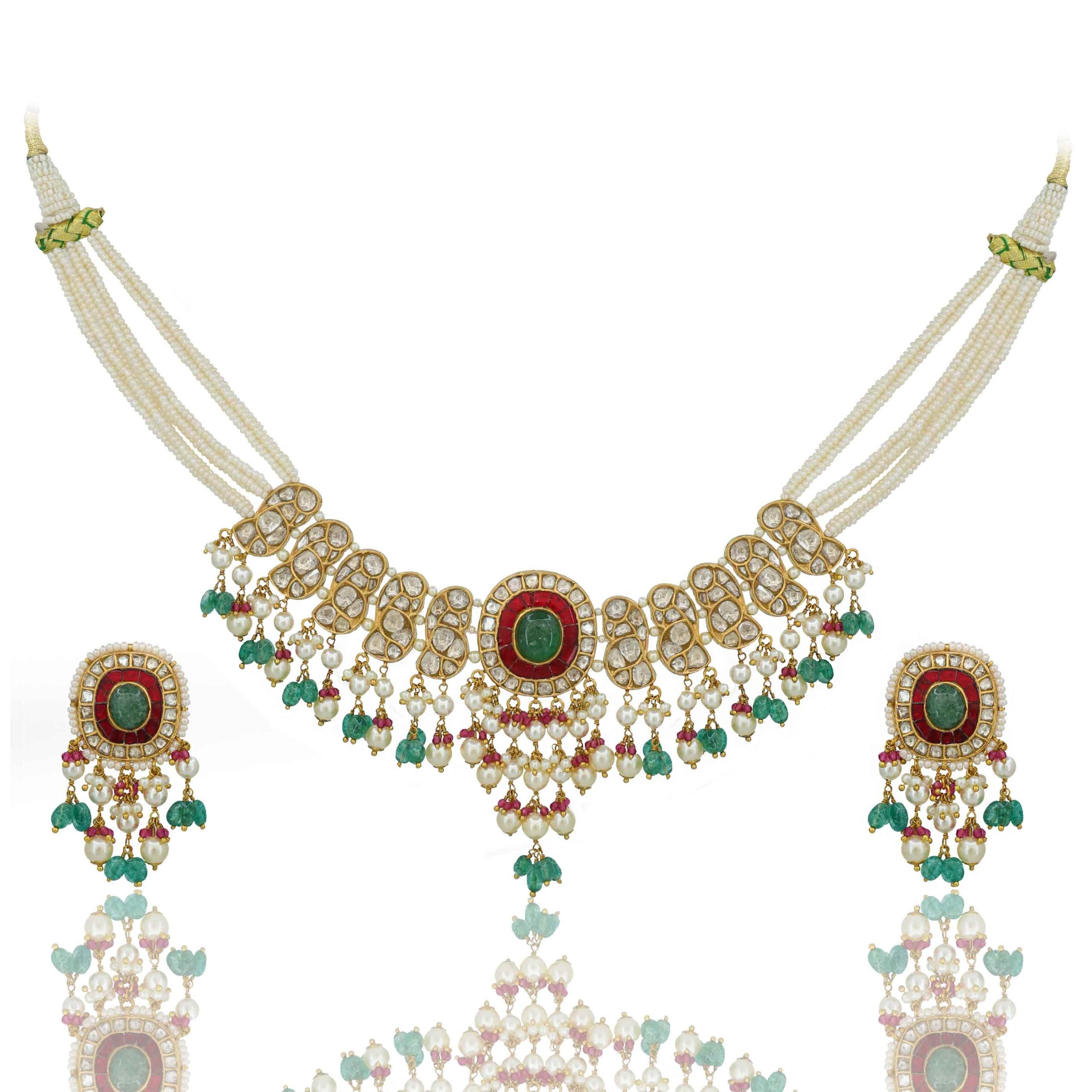 This regal gold choker necklace set features natural polki diamonds and a striking central green semiprecious stone. It’s elegantly strung with delicate pearls and vibrant semiprecious beads, creating a harmonious blend of classic and colorful. Matching earrings complete this exquisite, timeless piece.