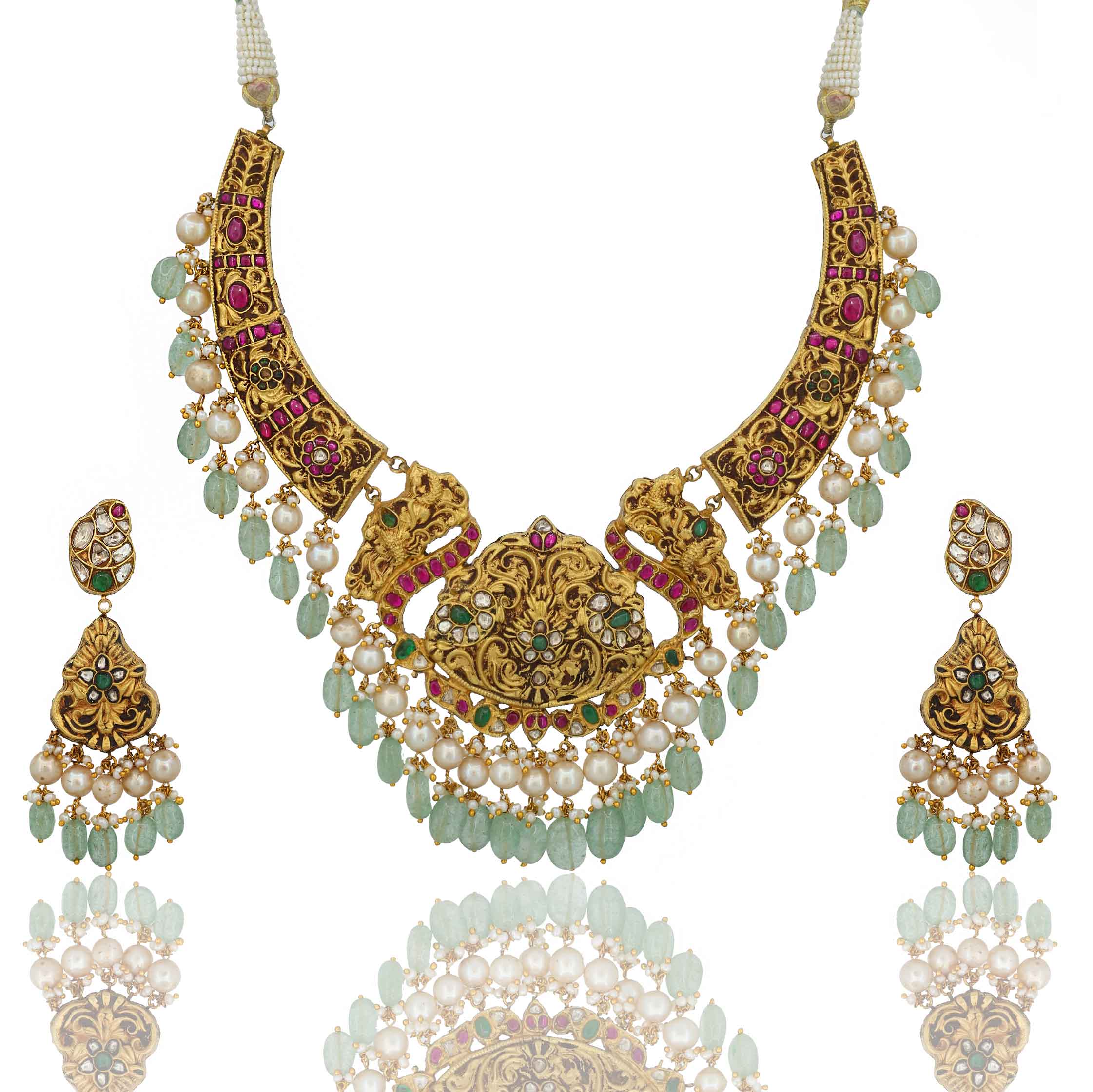 This stunning South Indian gold necklace features intricate designs, richly studded with natural rubies, polki diamonds, and emeralds. It is elegantly strung with lustrous freshwater pearls and delicate green glass-filling beads, culminating in a truly opulent and traditional masterpiece. Matching earrings complete this exquisite set.
