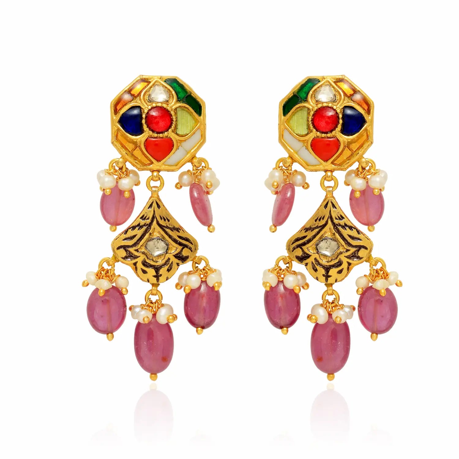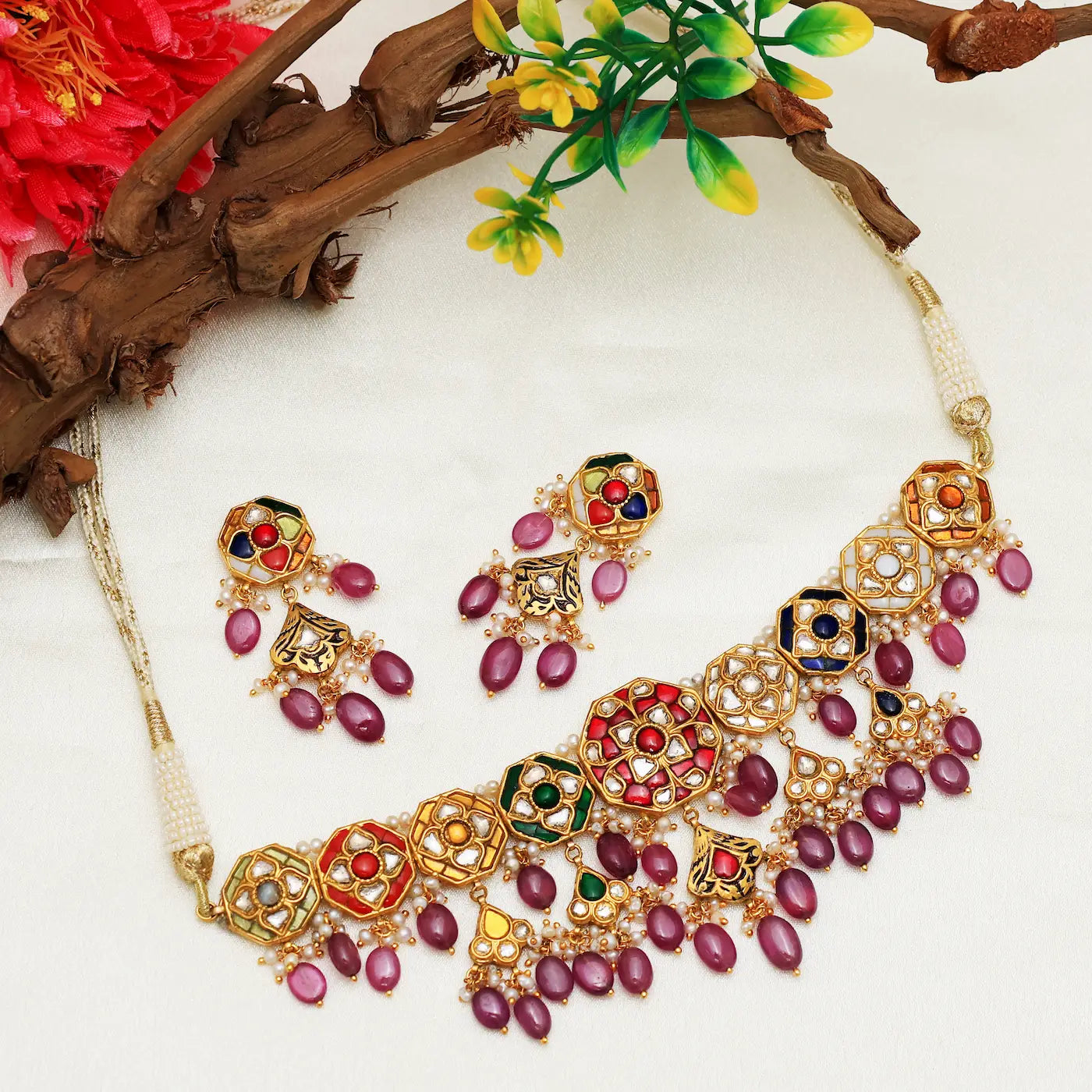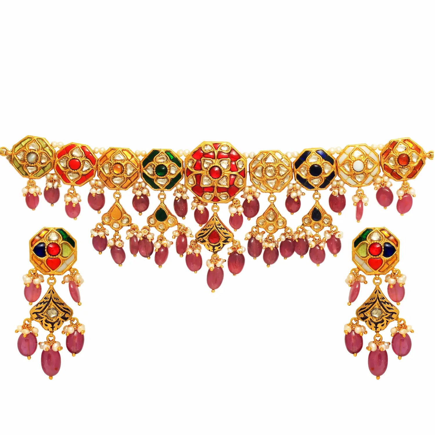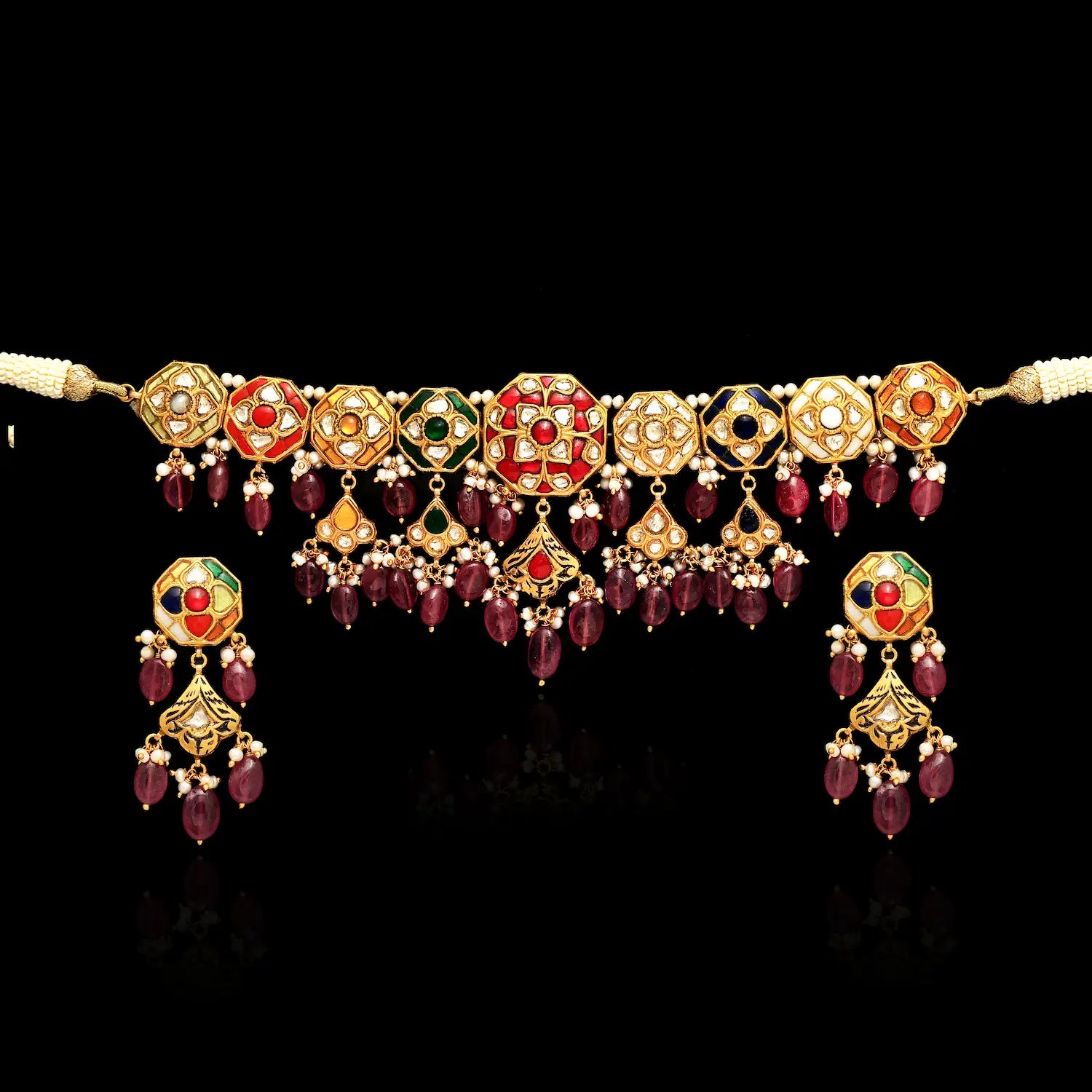 This exquisite Navratan choker set features a vibrant array of gemstones, meticulously set in a traditional design. The choker showcases colourful, multi-faceted elements interspersed with pearl-like beads, complemented by dangling ruby-red drops. Matching earrings echo the choker’s elegance, with similar gem-studded motifs and red drop accents, all set against a rich golden base, perfect for festive occasions.