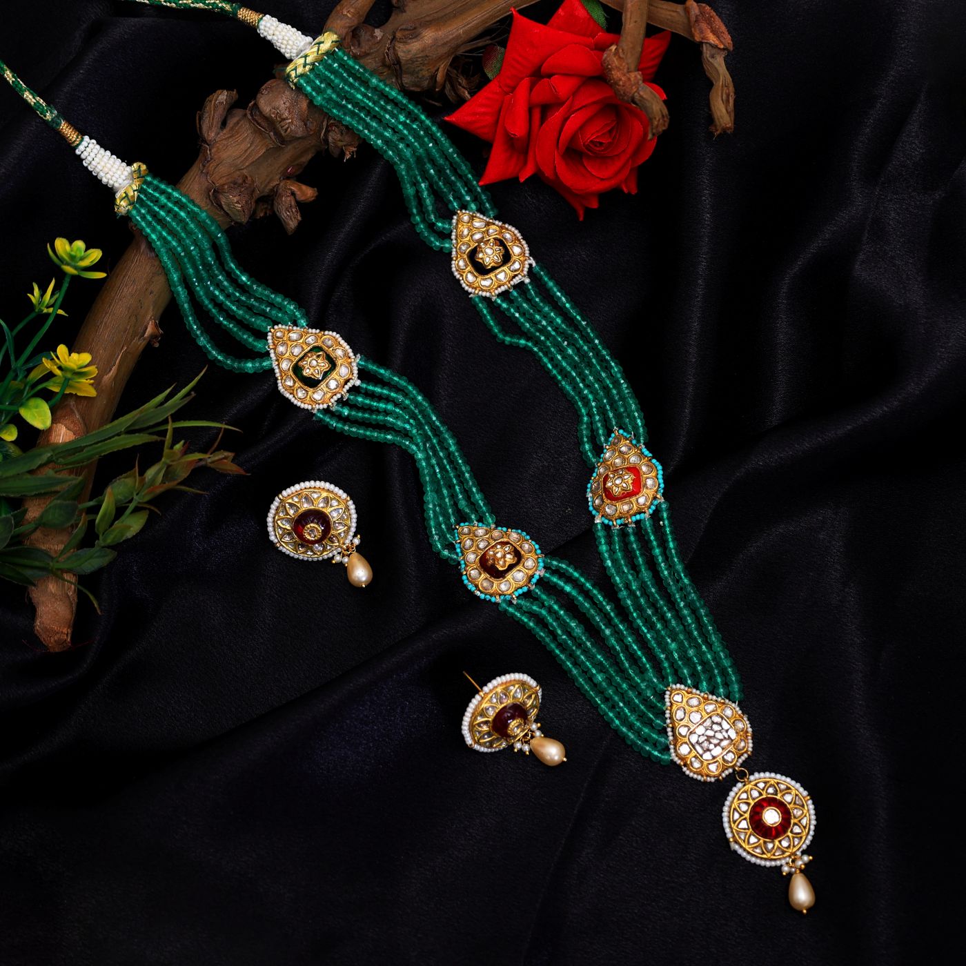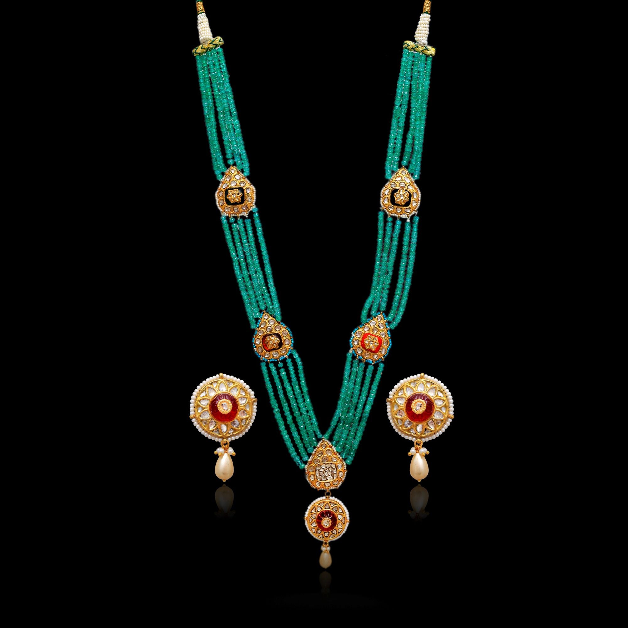 This long, multi-layered necklace set features vibrant green beads intricately strung with gold accents. The pendants and earrings showcase exquisite diamond polki settings and colorful stones . The overall design exudes traditional elegance, with the uncut diamonds adding a touch of timeless sparkle to the rich green and gold composition.