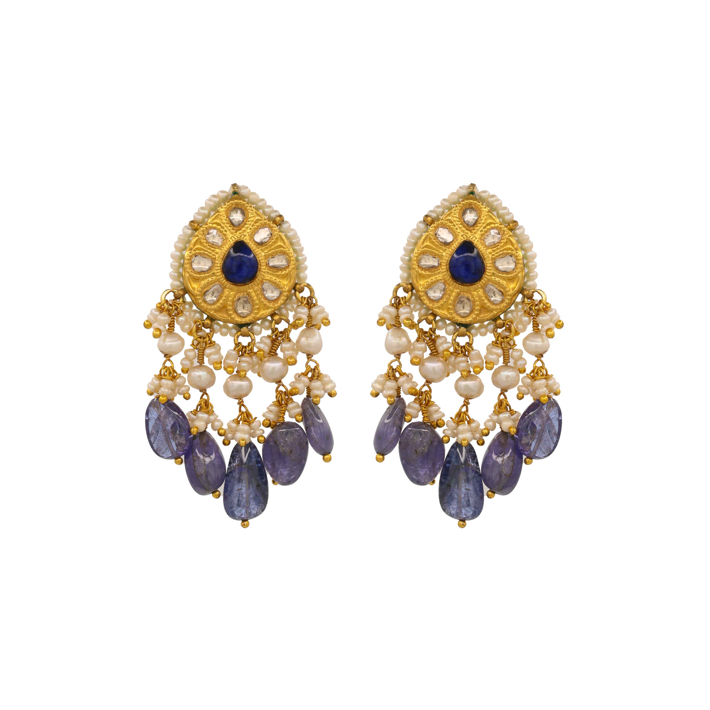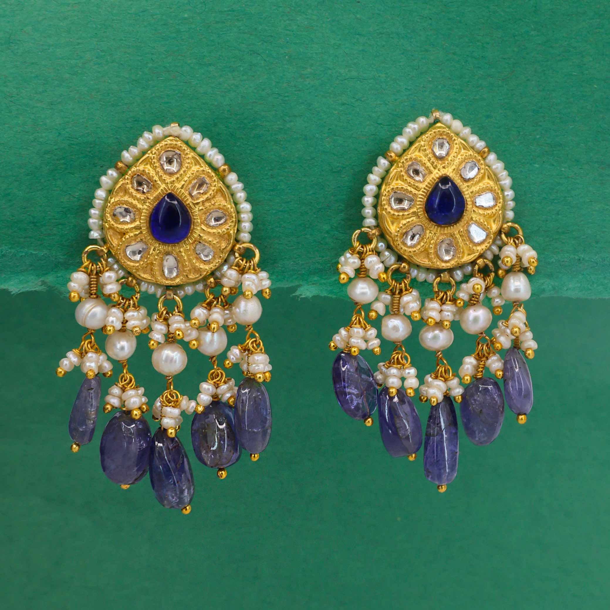 These beautiful Jhumka-style earrings feature a top stud with a central tanzanite stone surrounded by a ring of Polki diamonds and tiny pearls. From this top piece hang elegant tiers of dangling pearl and tanzanite beads, creating a magnificent and classic look. The combination of the uncut diamonds with the deep blue of the tanzanite gives them a rich, royal feel.