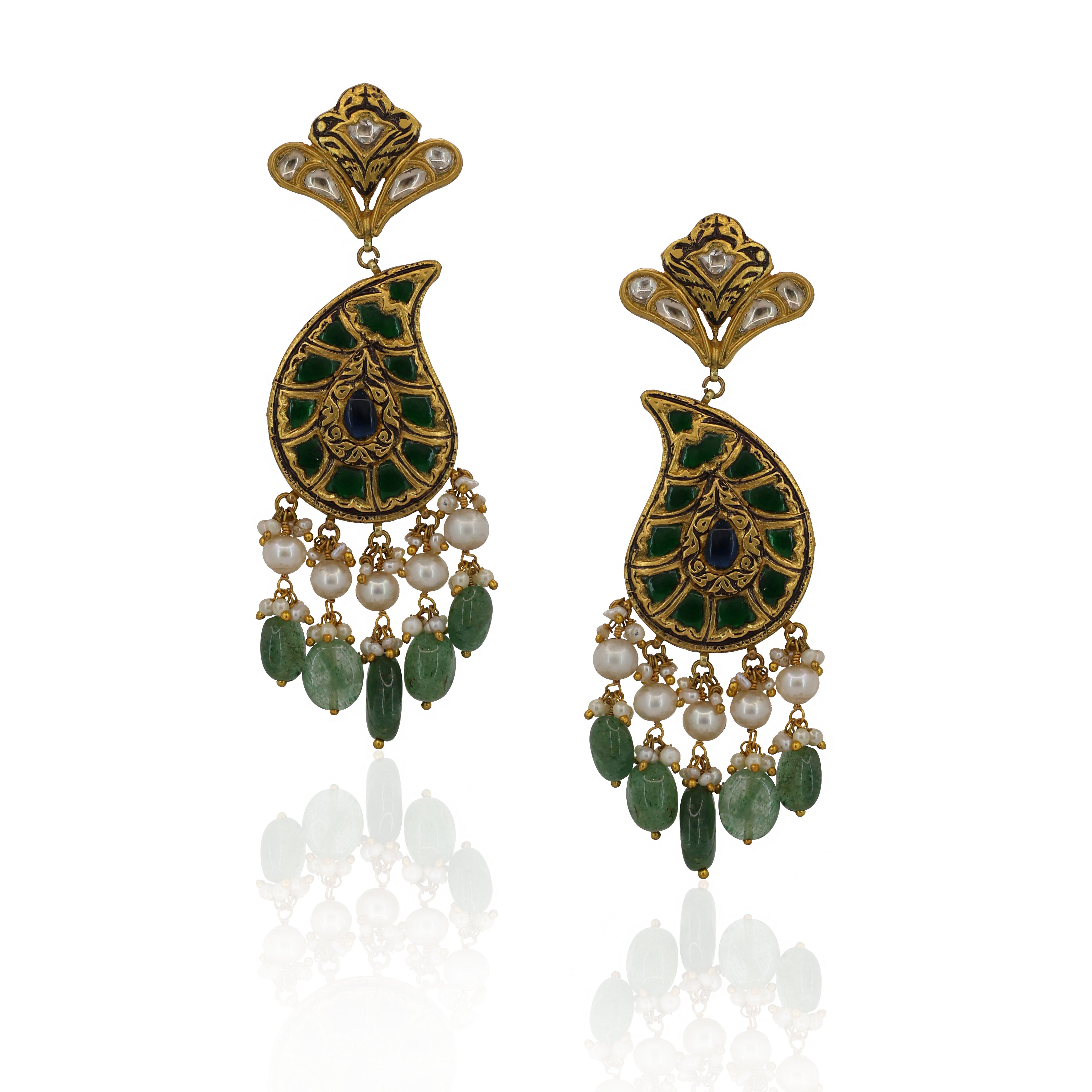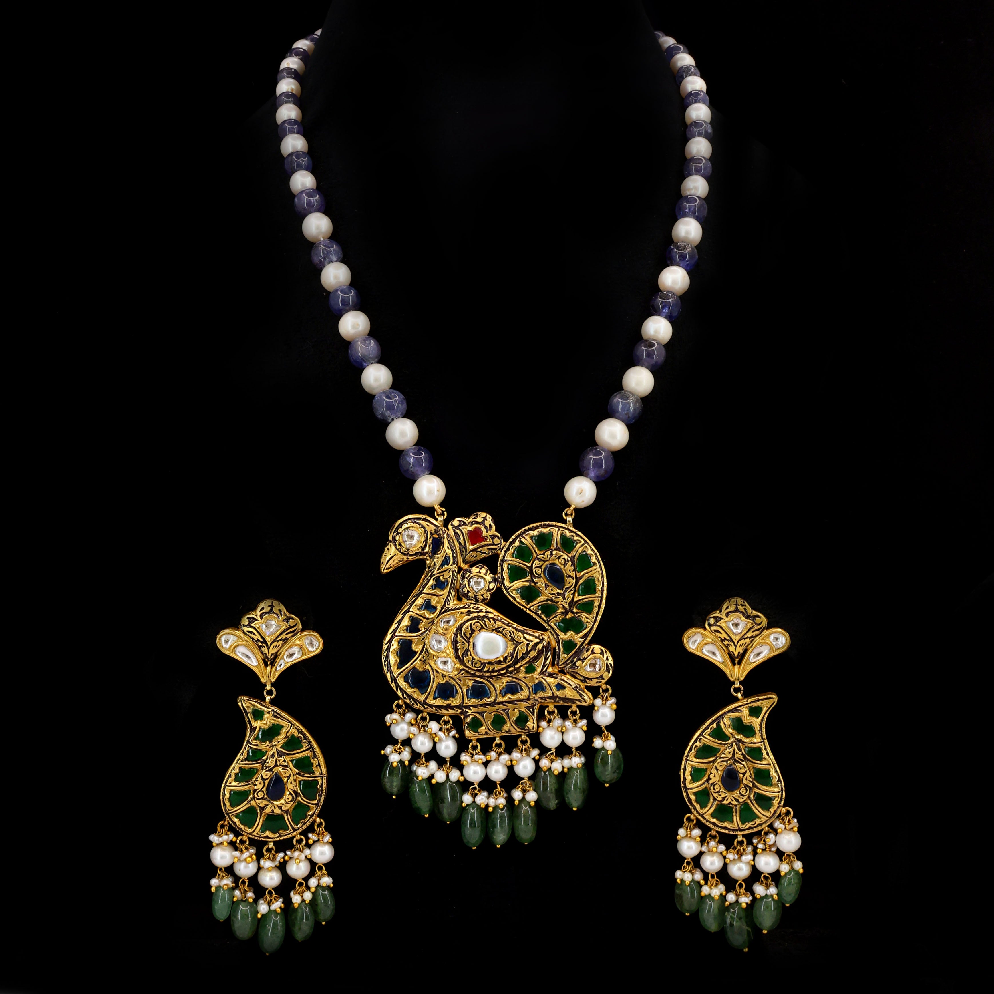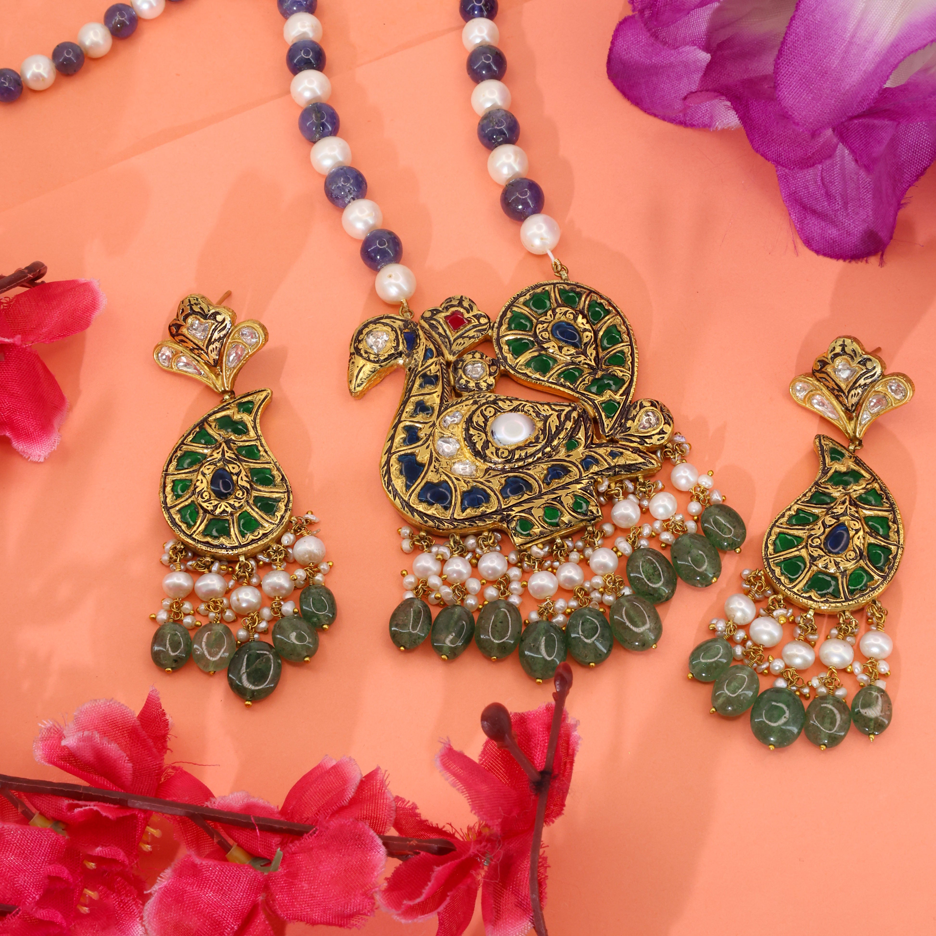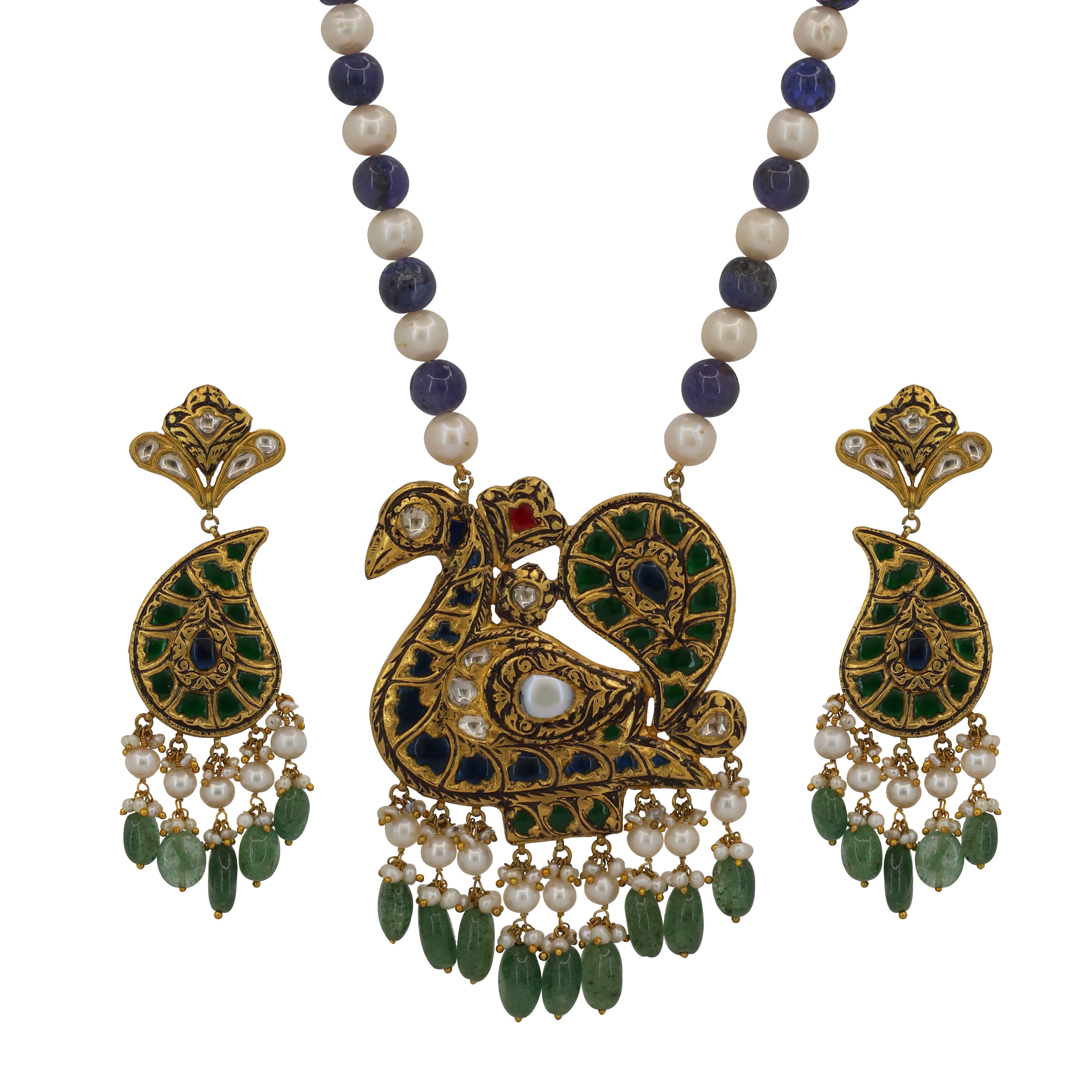 Exquisite handcrafted gold set featuring a majestic peacock pendant and matching paisley earrings. It is intricately studded with natural Syndicate Polki diamonds and vibrant glass filling. The ensemble is elegantly finished with a string of pearls, Tanzanite beads, and emerald-green drops for a timeless, regal aesthetic.