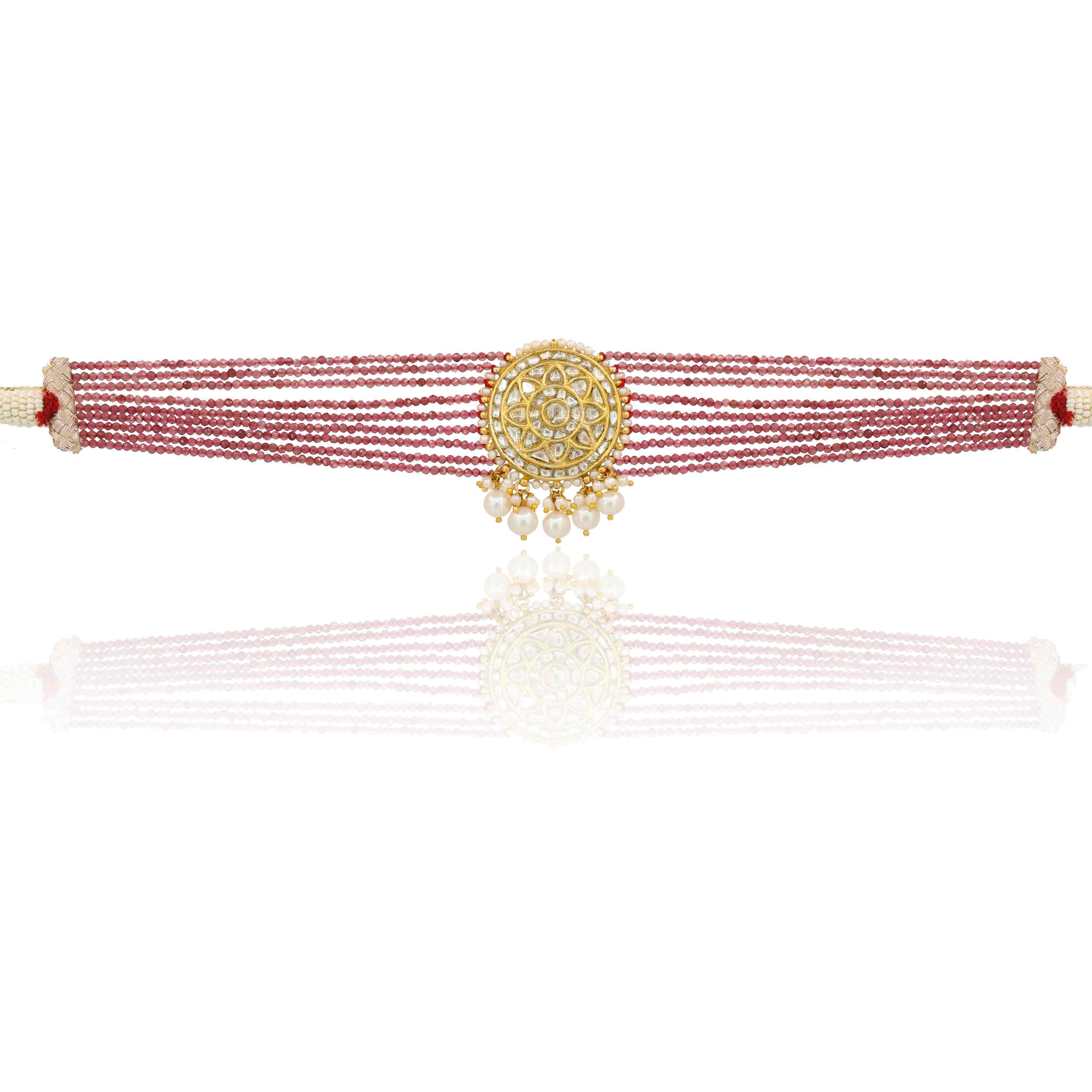 dazzling Polki Diamond and Ruby Choker featuring seven strands of fine glass-filled ruby beads. The antique gold centerpiece is studded with natural Polki diamonds and finished with delicate pearl drops.