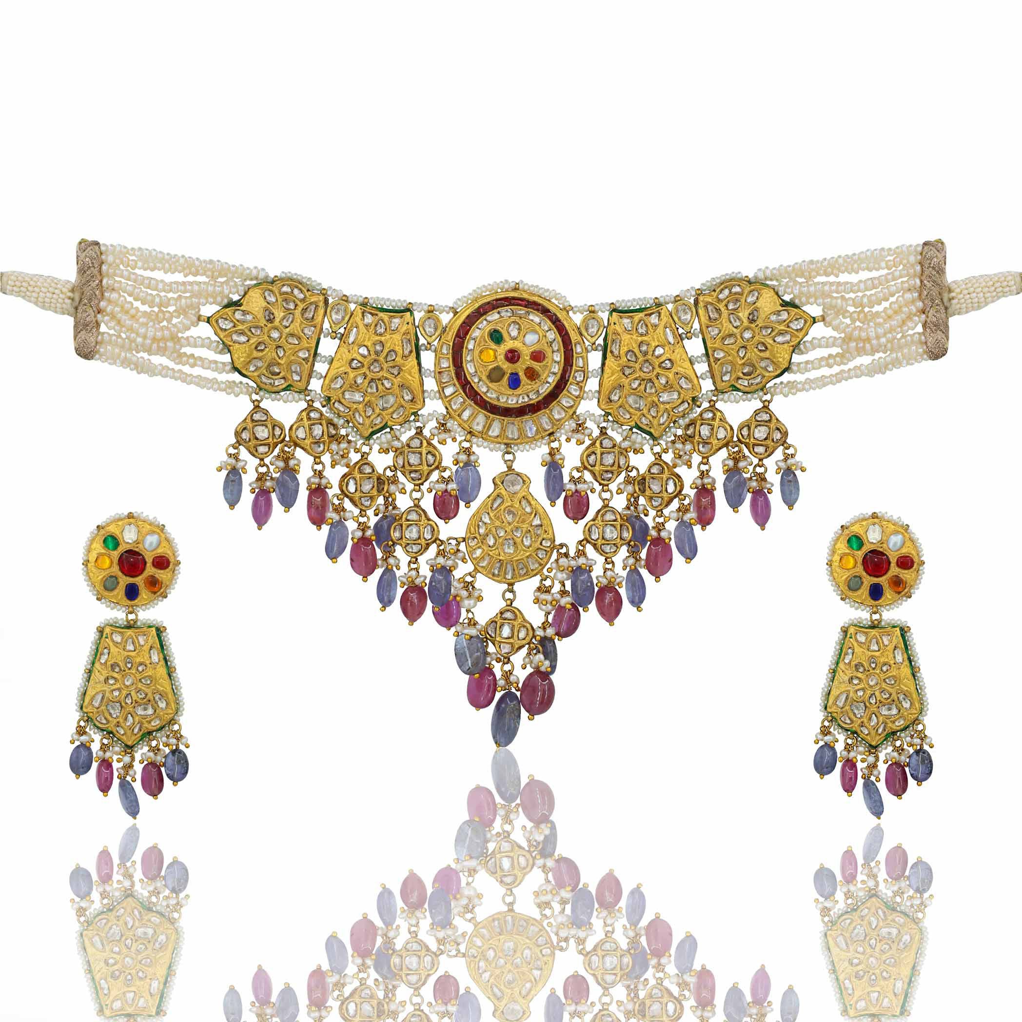 This stunning gold choker necklace set, crafted in Jaipur, showcases natural diamond polki with vibrant Navratna gemstones. It’s elegantly multi-strung with lustrous pearls, delicate tanzanite, and glass-filled ruby beads, creating a rich and opulent design, complete with matching earrings.