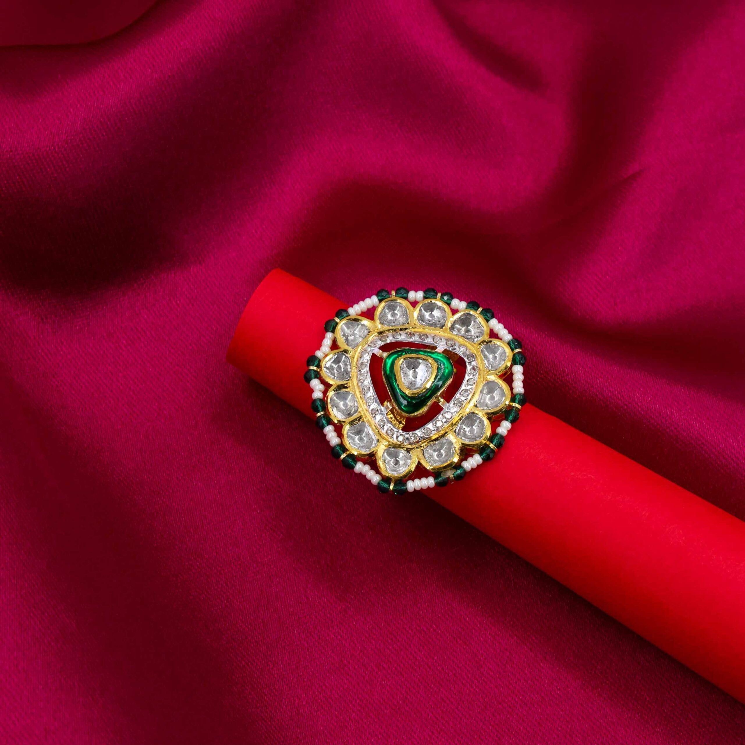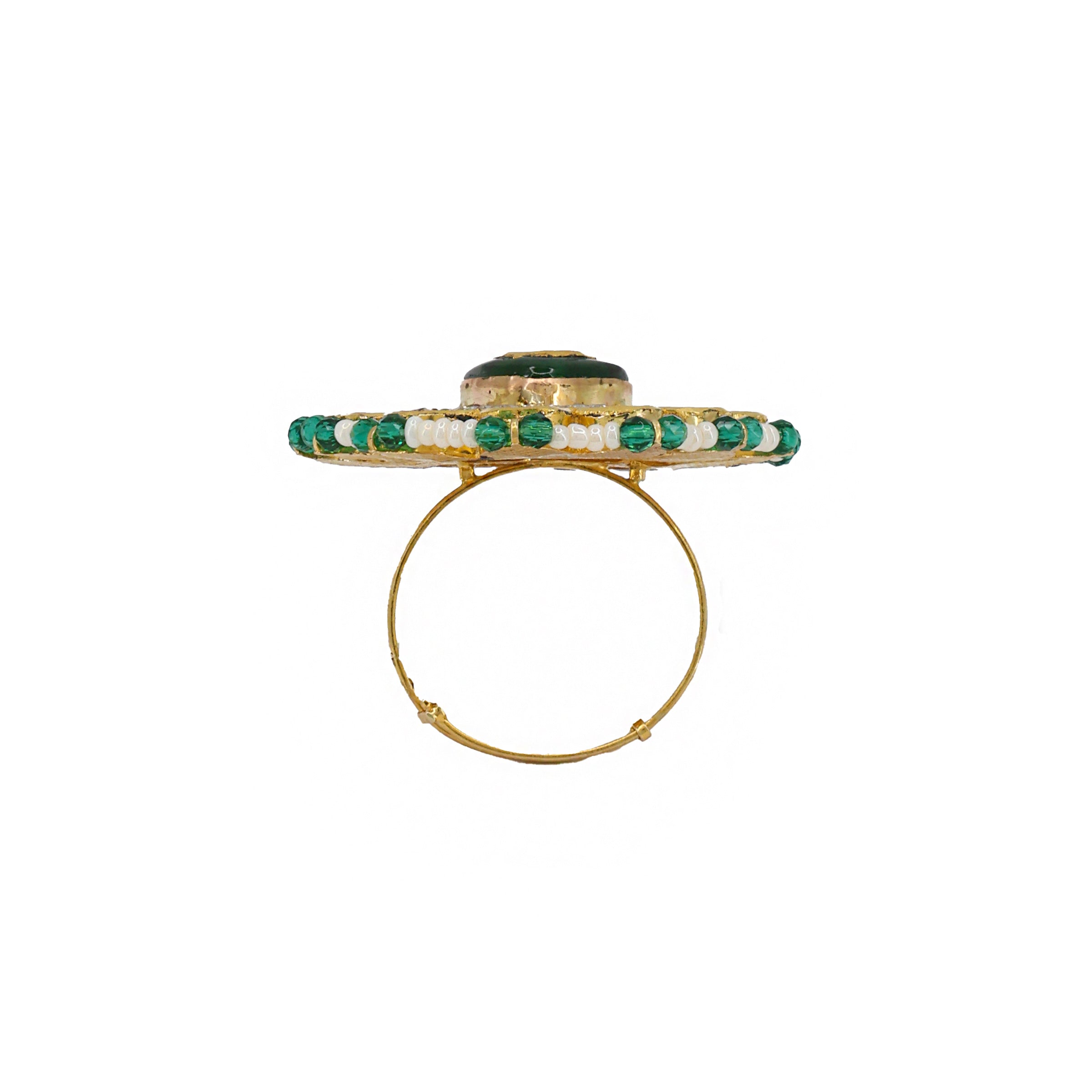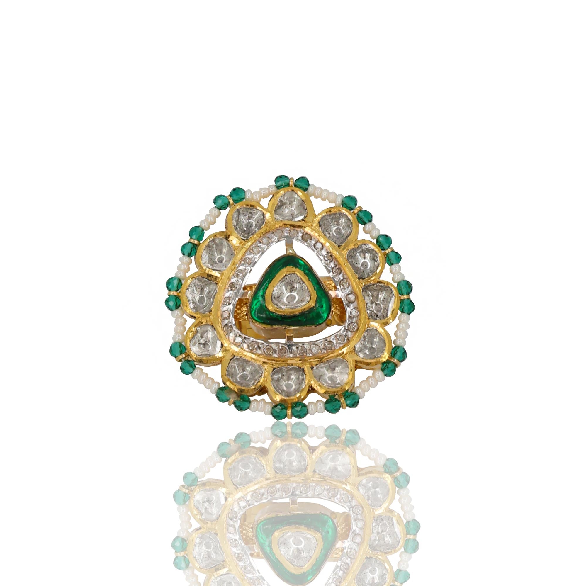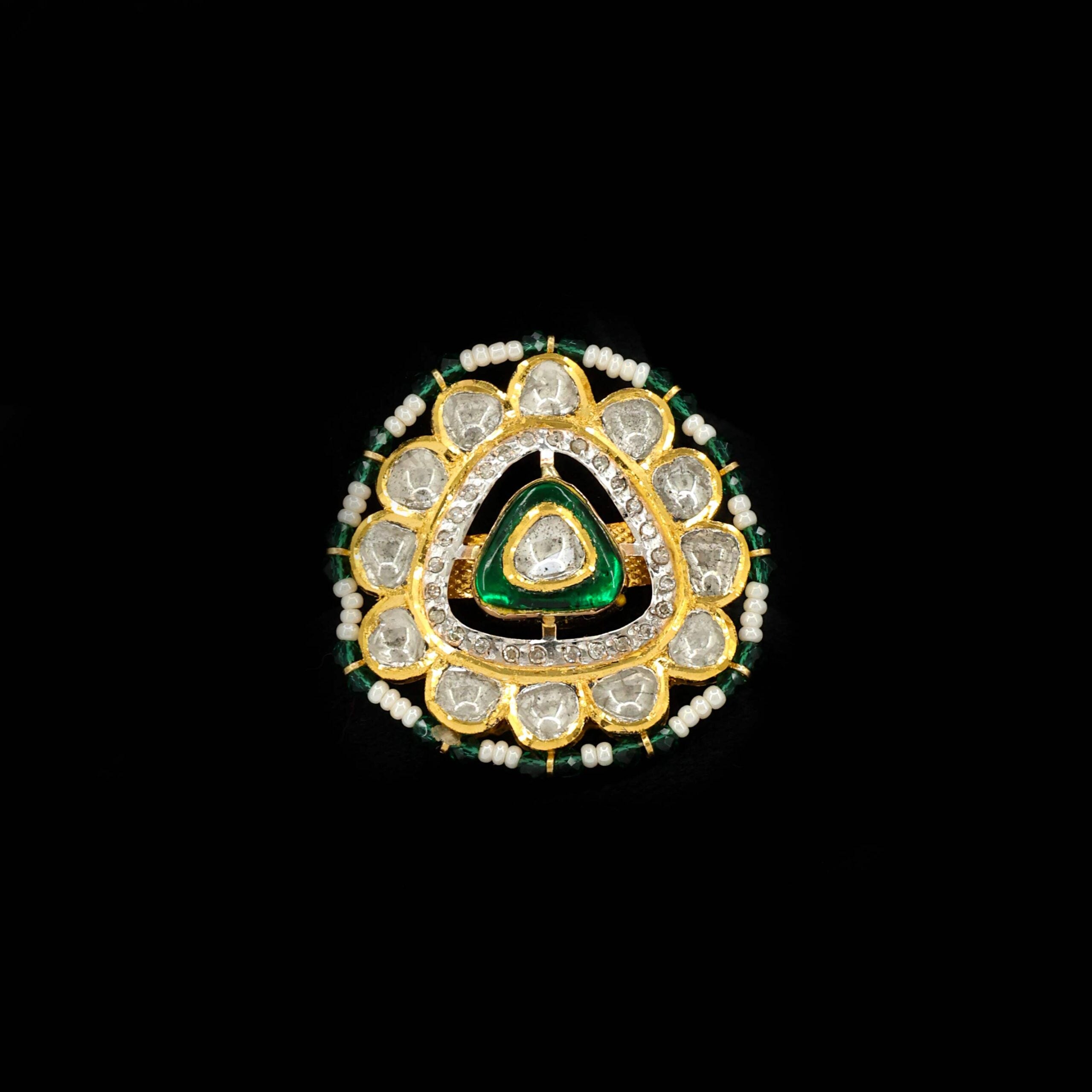 This striking gold ring from Jaipur features a prominent triangular natural polki diamond at its heart. It’s elegantly surrounded by a halo of more uncut polki diamonds, and further accentuated by an outer border of delicate pearls and vibrant green glass-filling beads, showcasing traditional artistry.