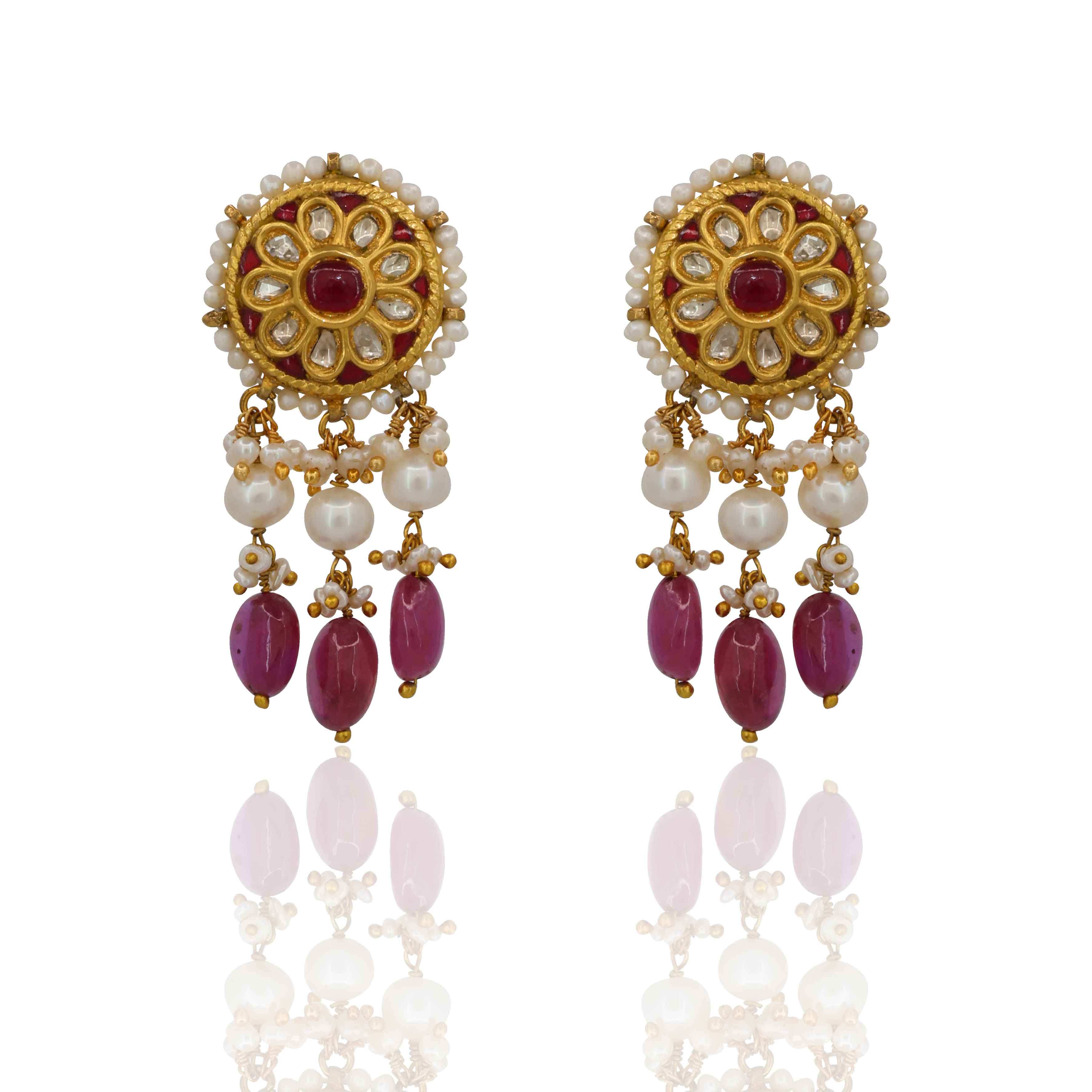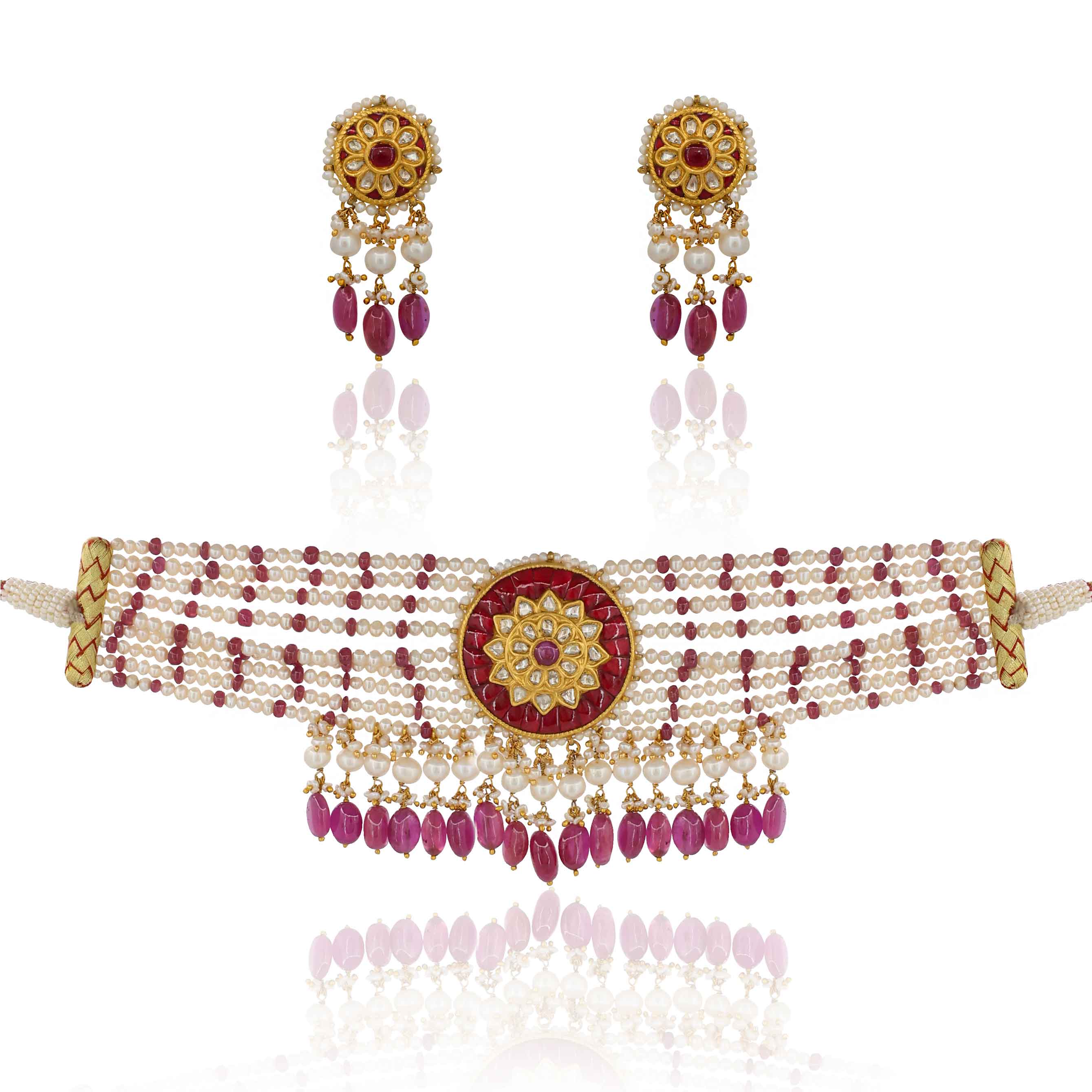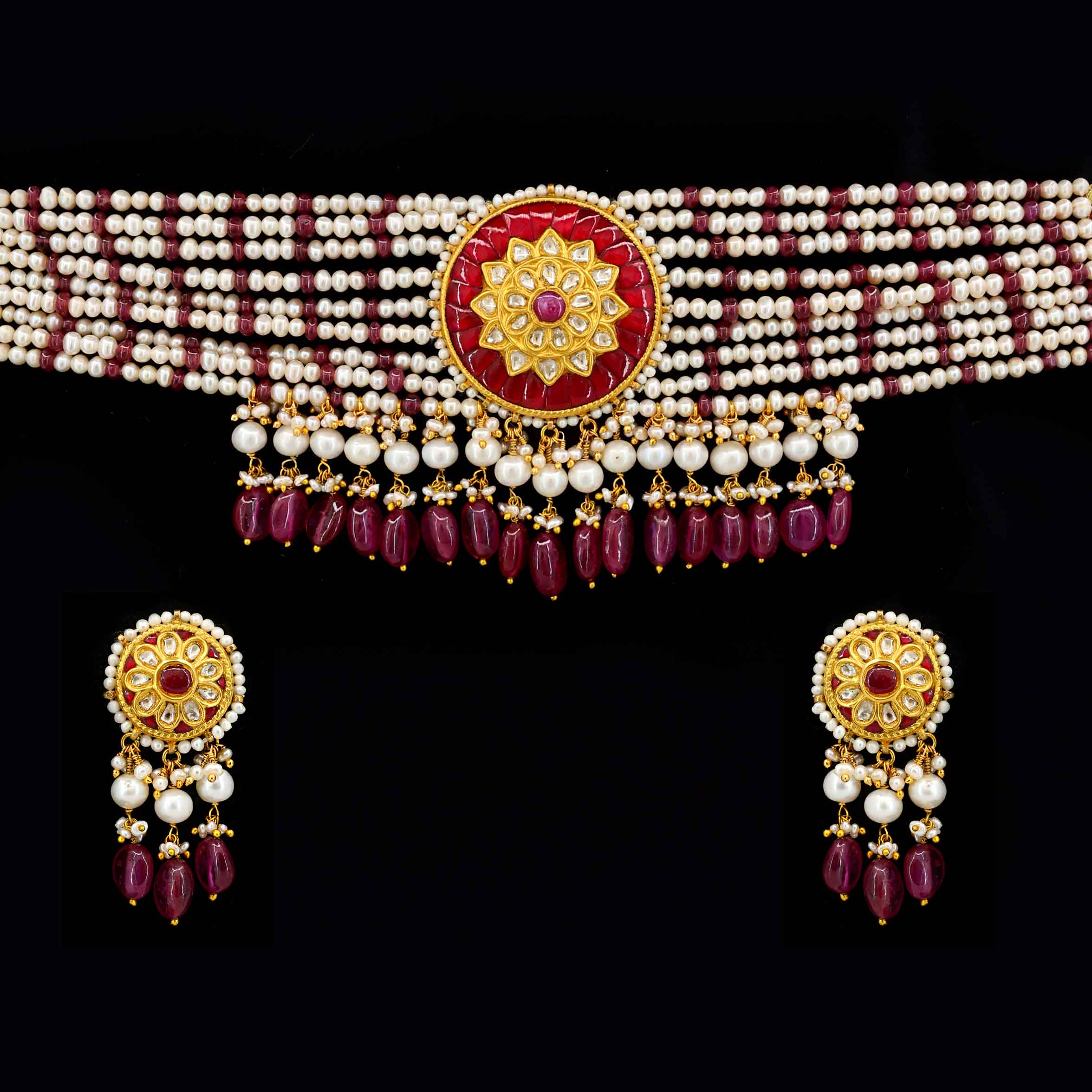 traditional Kundan Polki choker set. It features a floral Ruby Glass Filling centerpiece on a wide band of delicate pearl and ruby glass beads. Matching earrings complete this exquisite look.