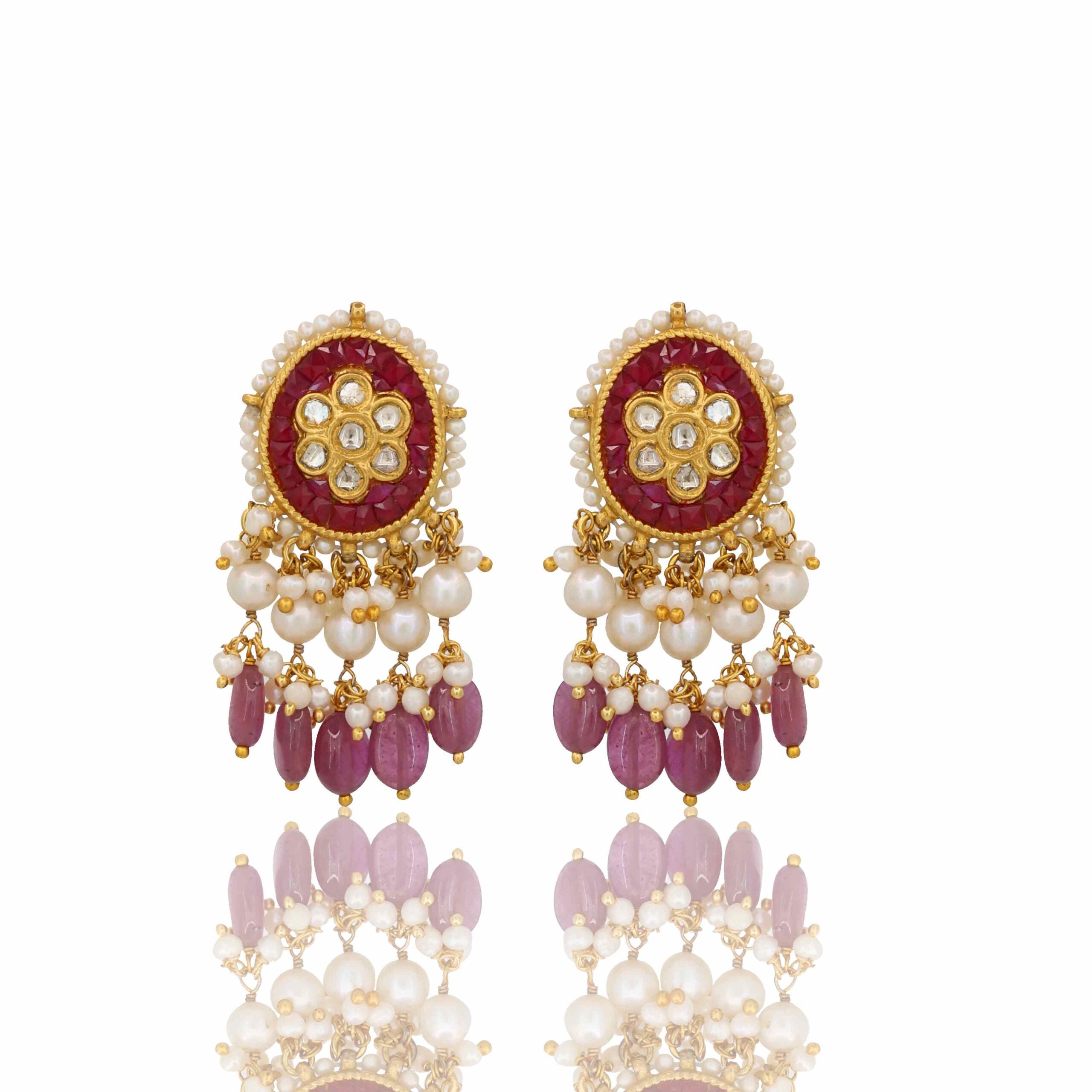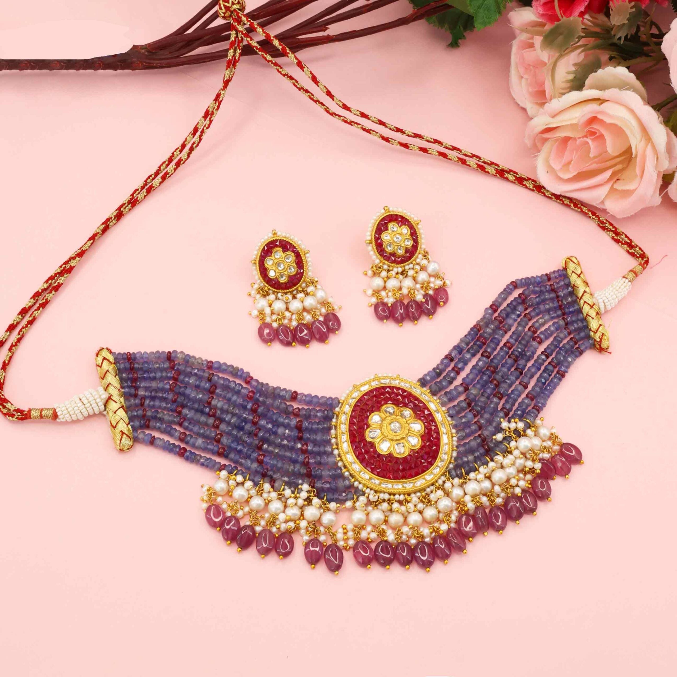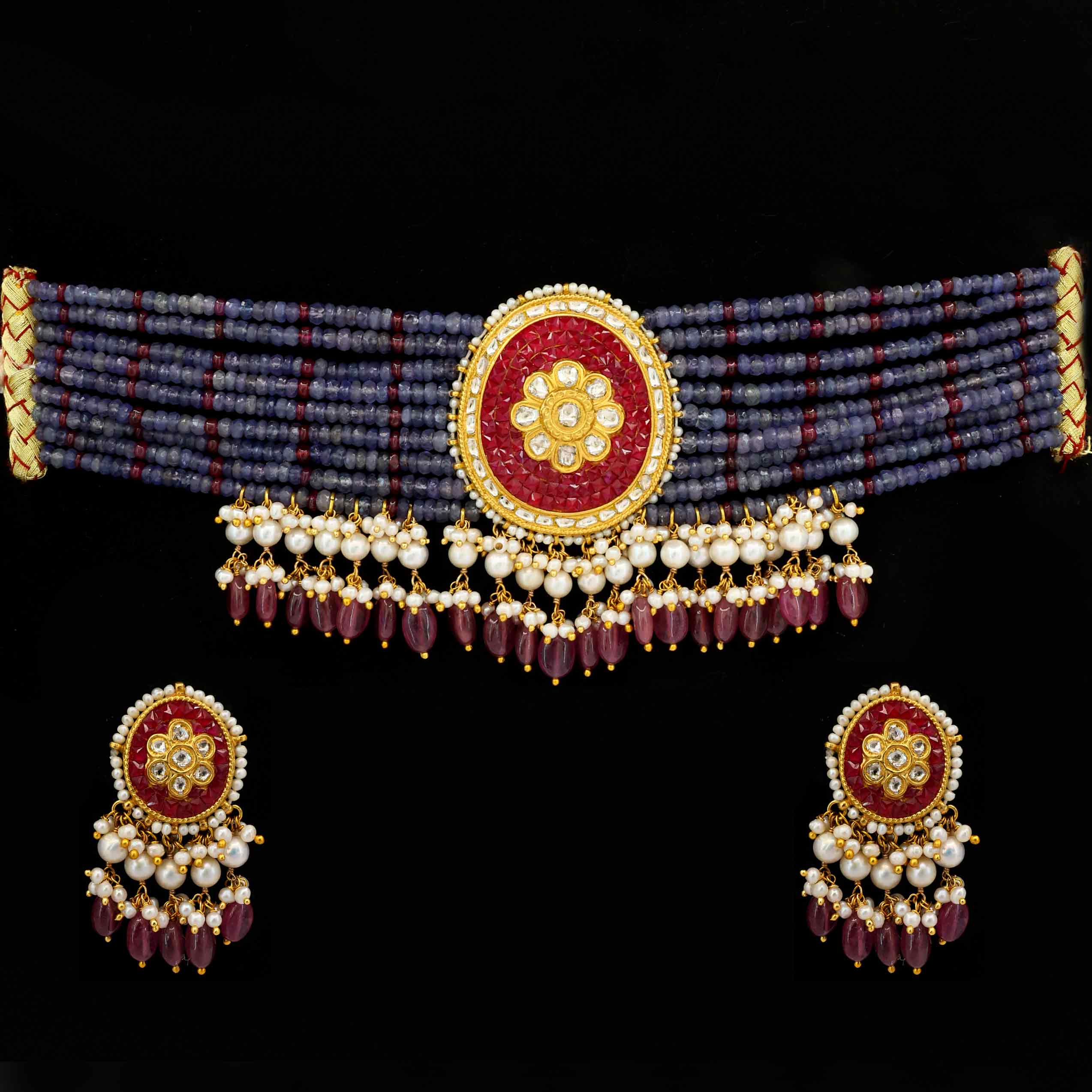 This exquisite gold choker necklace from Jaipur features a central medallion studded with natural diamond polki and a vibrant semi-precious red stone. It’s elegantly multi-strung with natural tanzanite beads, purple glass-filling beads, and lustrous pearls, creating a truly unique and luxurious piece.