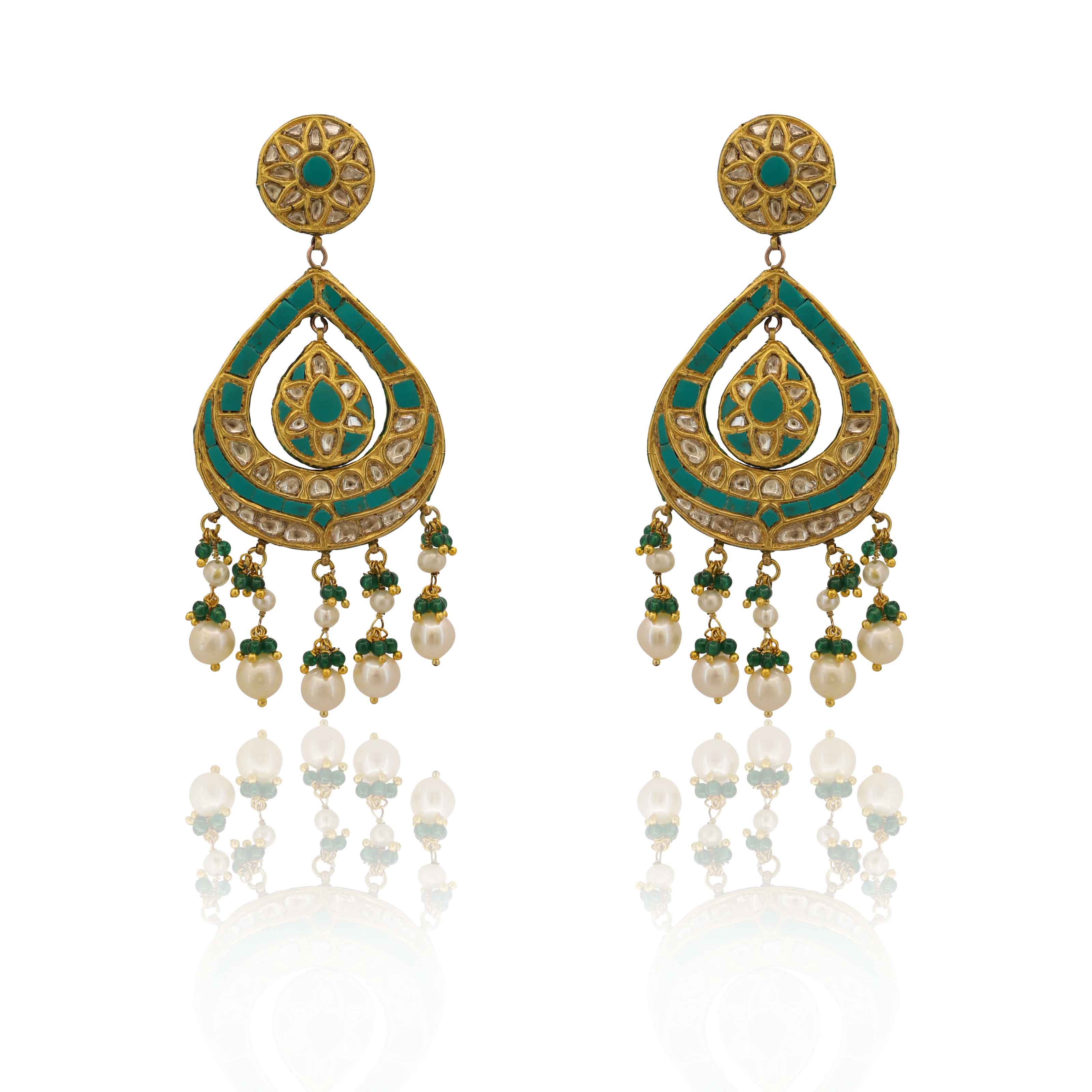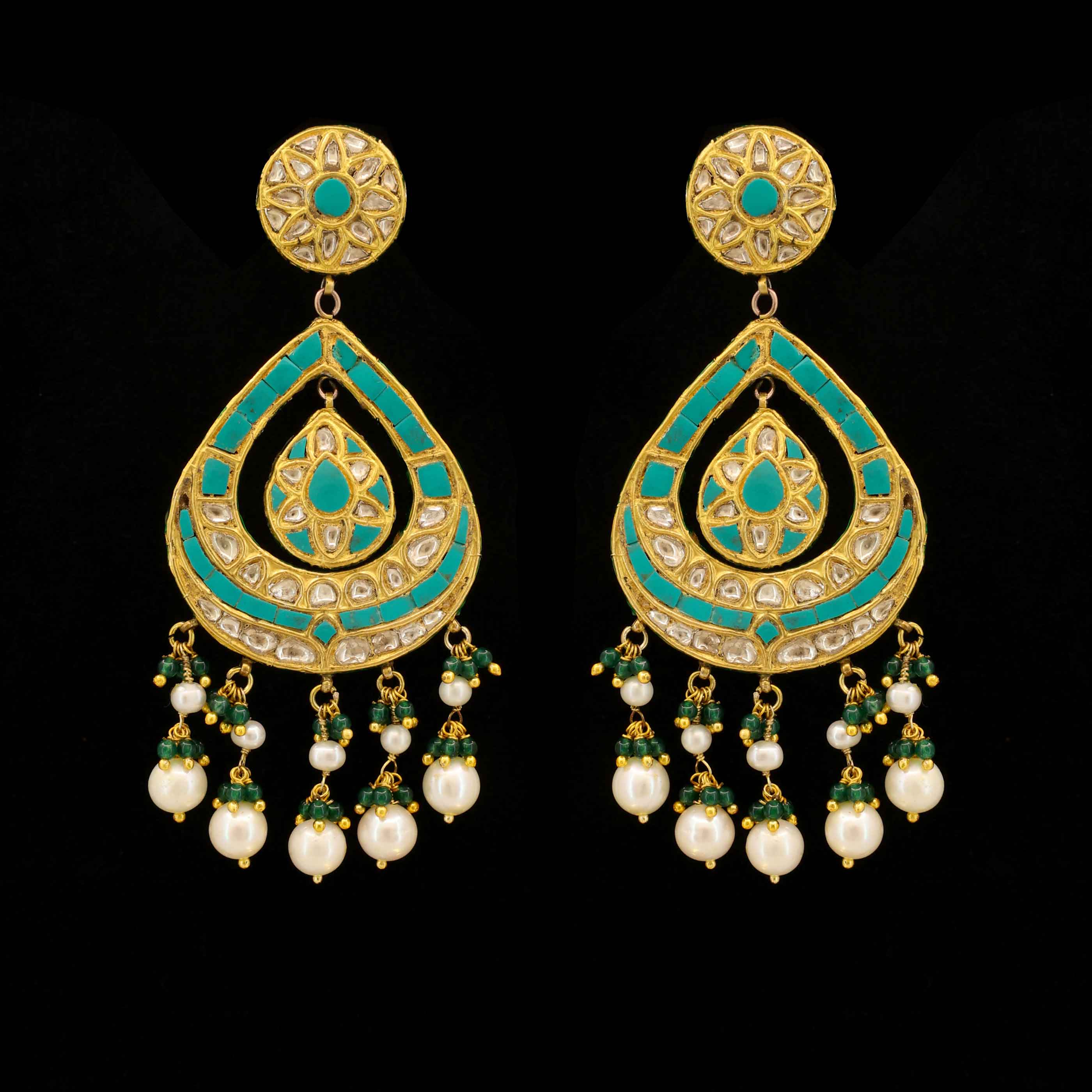 These exquisite teardrop earrings feature Polki diamonds set in a gold finish, framed by vibrant turquoise-colored glass filling (Meenakari). The regal design is finished with delicate clusters of lustrous pearls and turquoise beads. This unique statement piece perfectly blends traditional artistry with a sophisticated splash of color.
