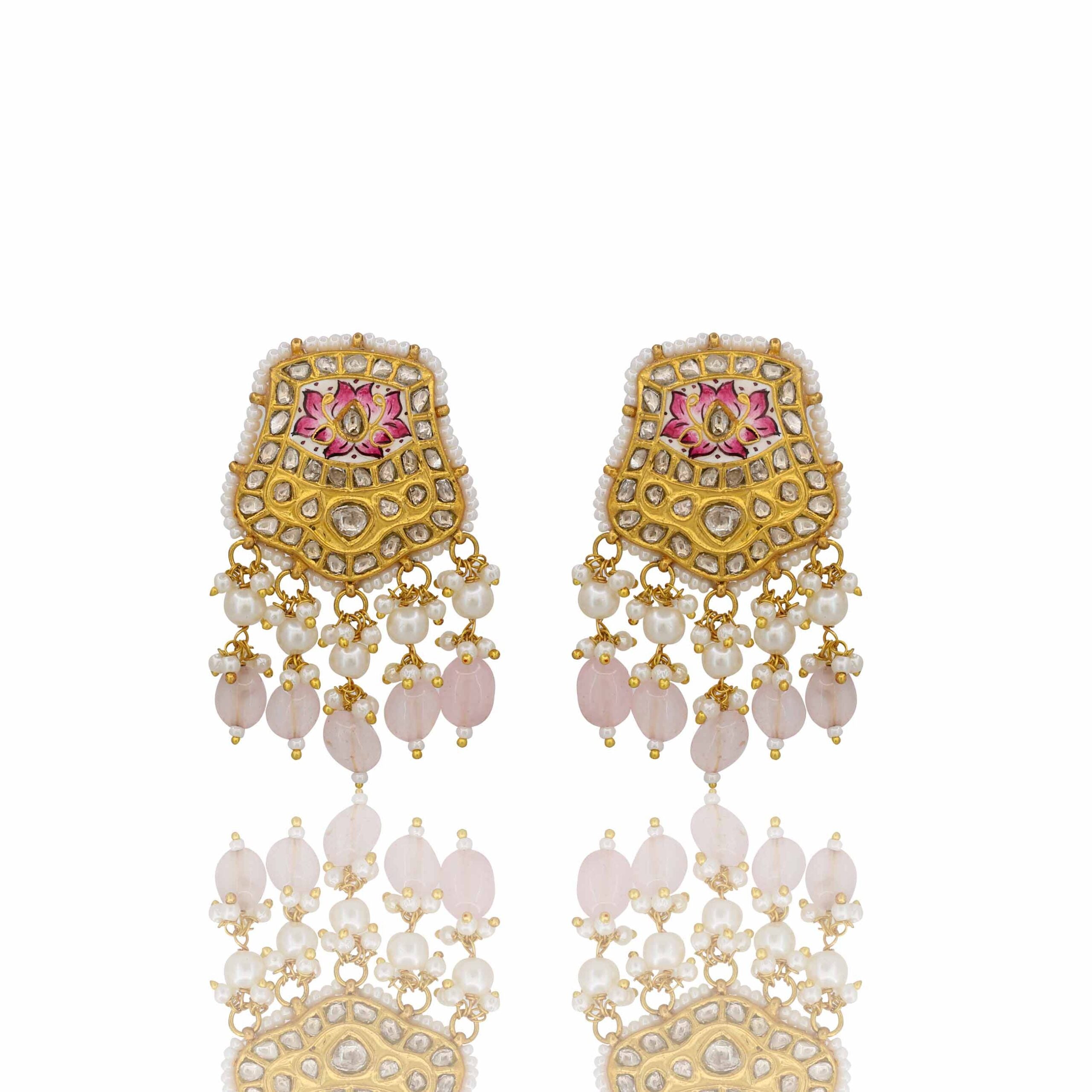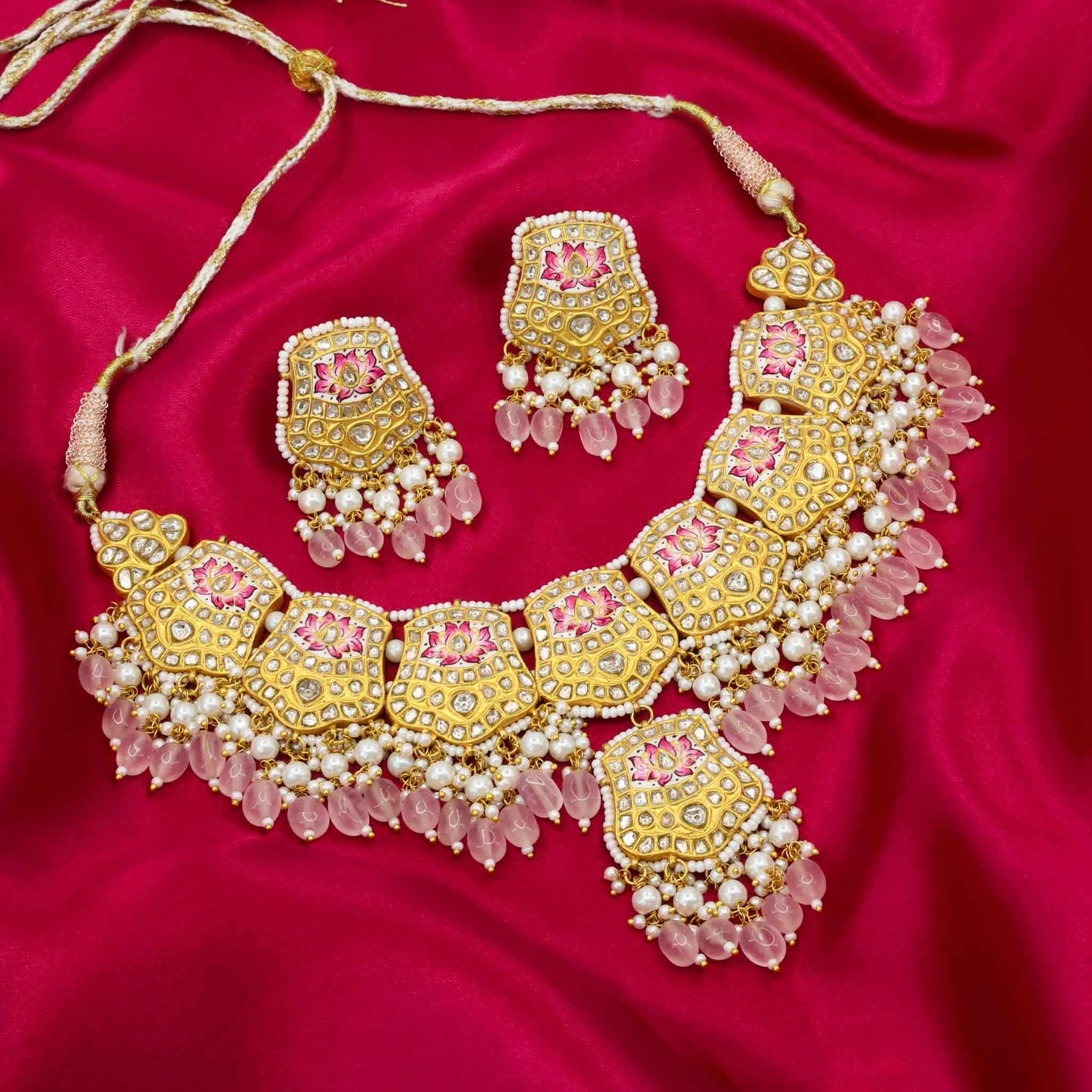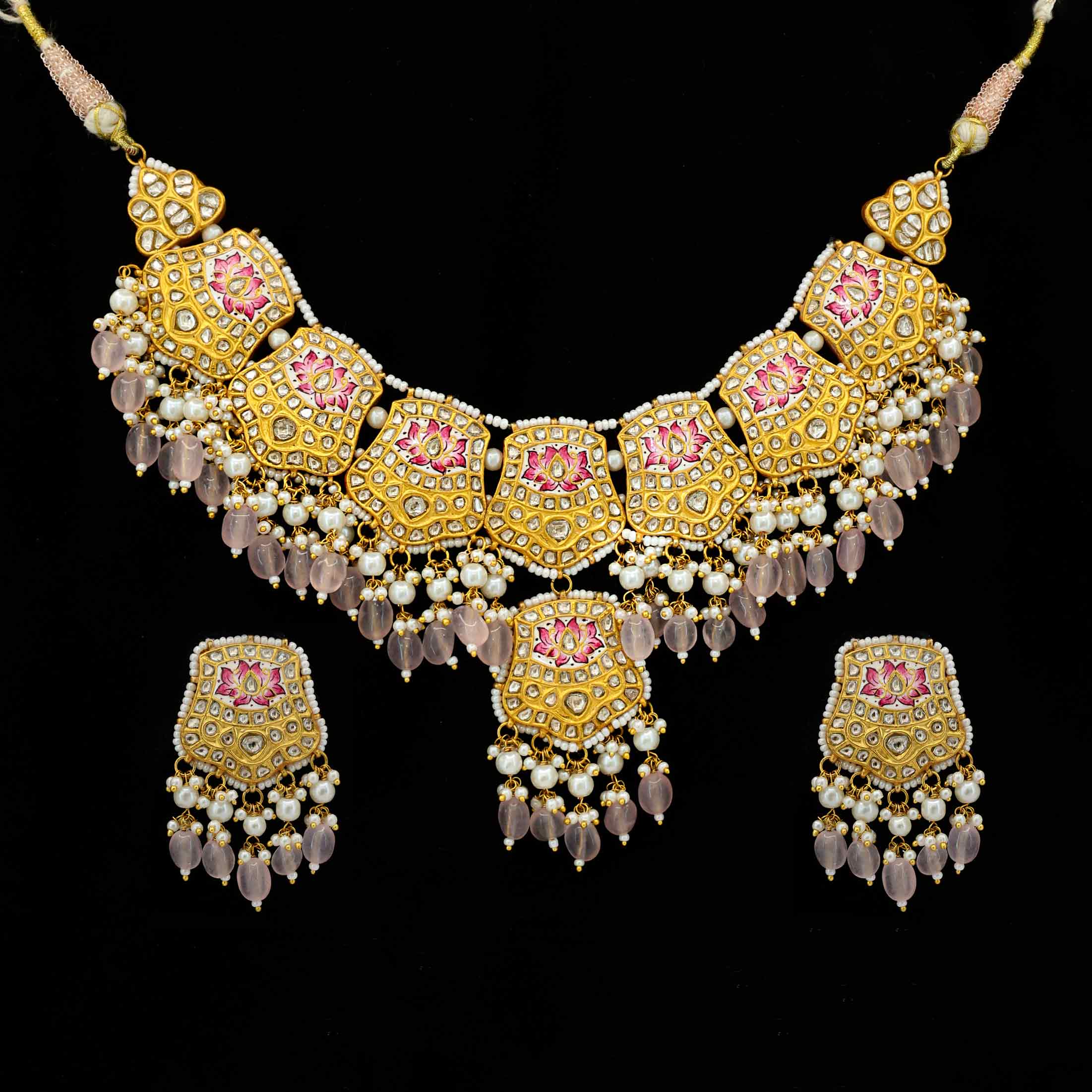 This enchanting gold enamel necklace set from Jaipur features intricate floral motifs in pink and white, studded with natural polki diamonds. It’s gracefully strung with delicate pink glass-filling beads and lustrous freshwater pearls, complete with matching jhumka-style earrings.