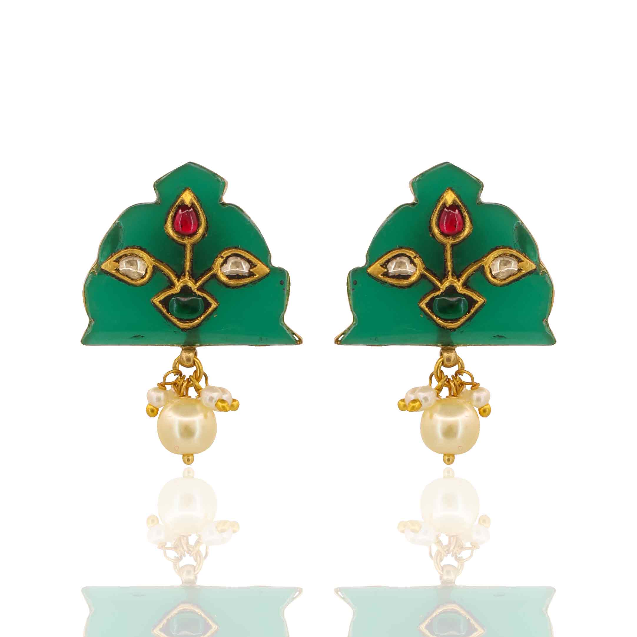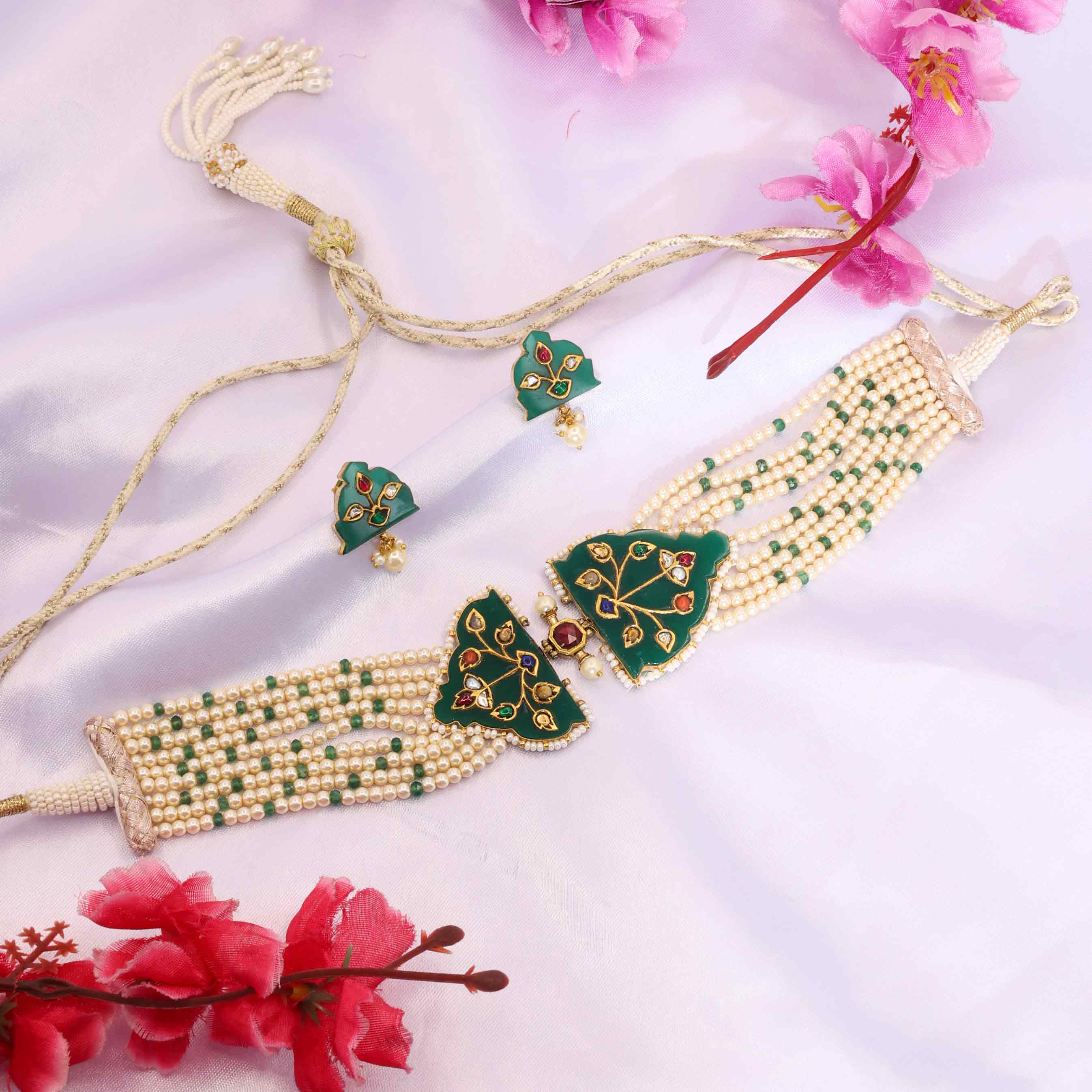 Gold Choker Set features multiple strands of pearls dotted with emerald beads. The central gold clasp showcases intricate stone carving and Meenakari (enamel), accented with Natural Polki Diamonds and Navratna-style colored gemstones. Matching studs complete this elegant look.
