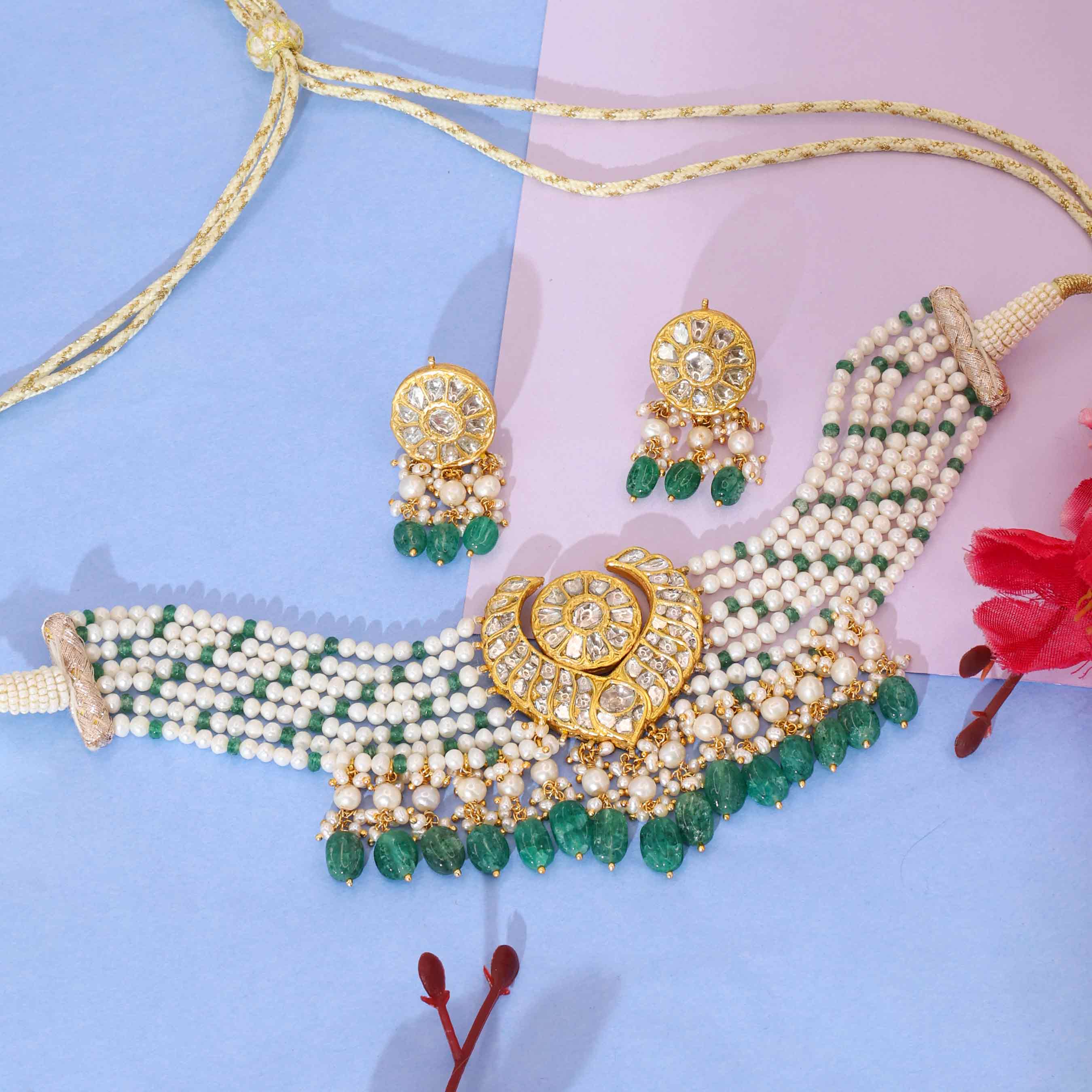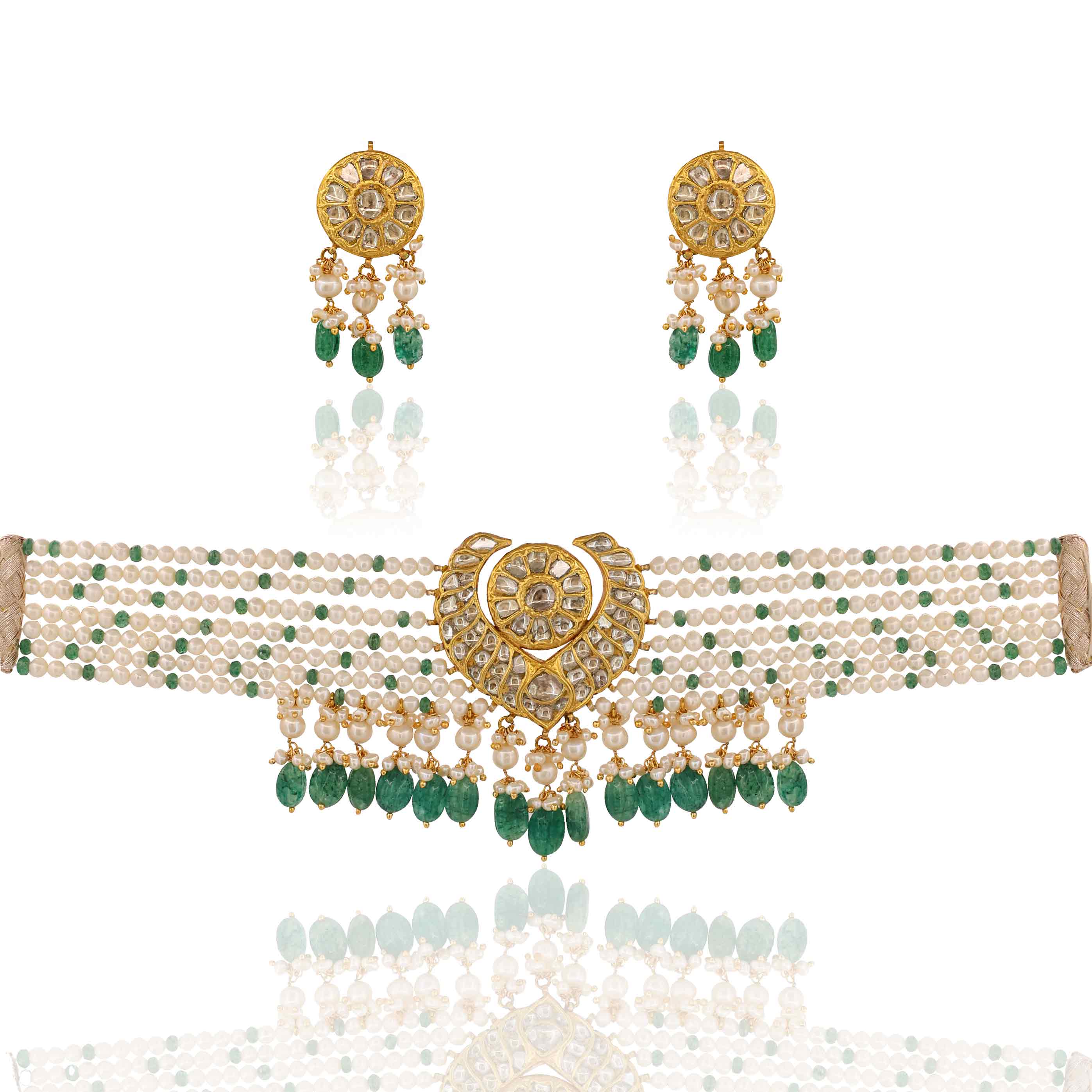 gold choker set features multiple strands of pearls and emerald beads. The central heart-shaped pendant is intricately studded with dazzling Natural Polki Diamonds. Matching earrings complete this refined and luxurious ensemble, finished with pearl and emerald drops.