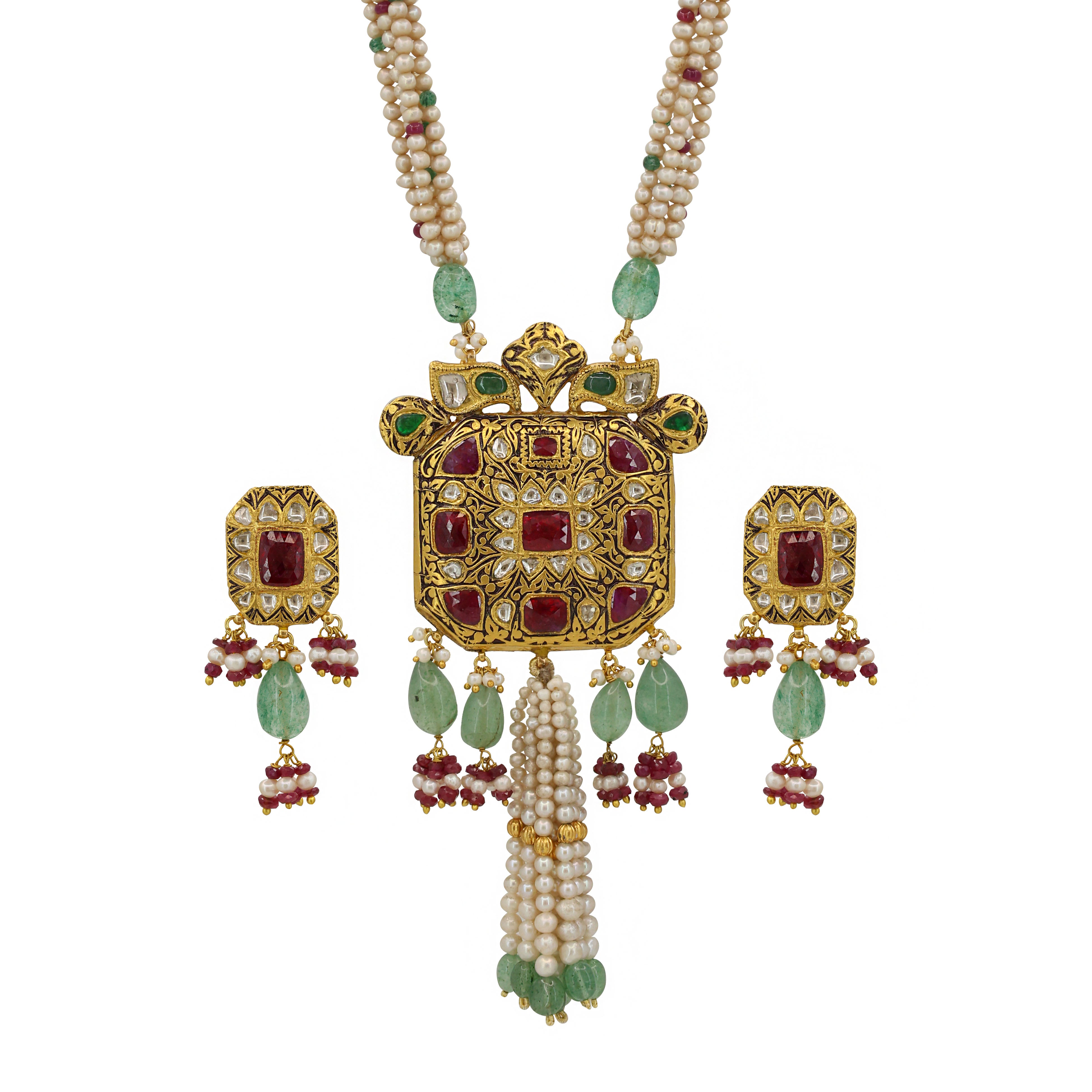 This exquisite gold pendant set features a masterfully crafted square pendant and matching earrings. It is intricately studded with natural Syndicate Polki diamonds and vibrant glass-filled rubies. Elegantly finished with pearl strings, emerald-hued glass stones, and ruby drops, it embodies timeless regal charm.