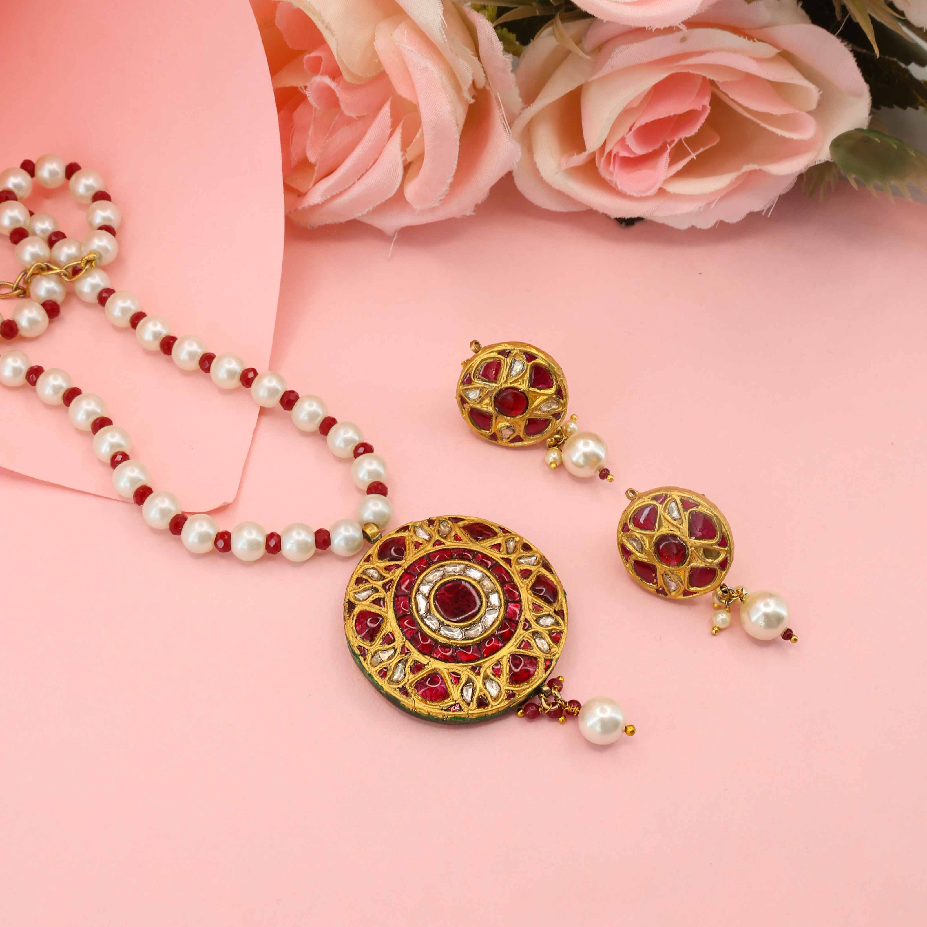 This traditional gold polki diamond and ruby pendant set features a round pendant and matching earrings strung with pearls and ruby beads.