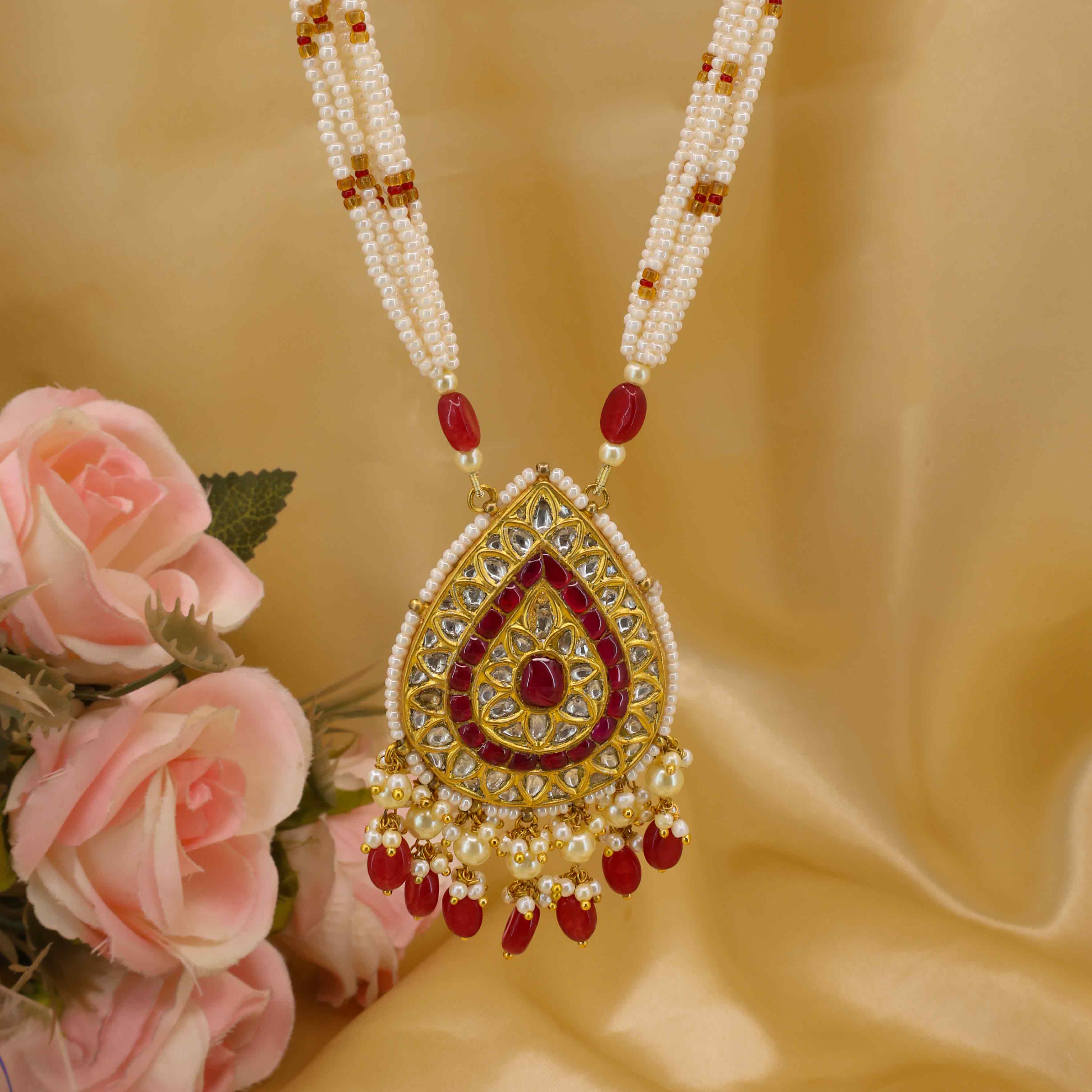 This gold pendant is crafted in a teardrop shape and features natural Syndicate Polki diamonds and a central glass filling ruby. It is strung on a necklace of delicate pearls and glass filling beads, with multiple ruby drops dangling below.