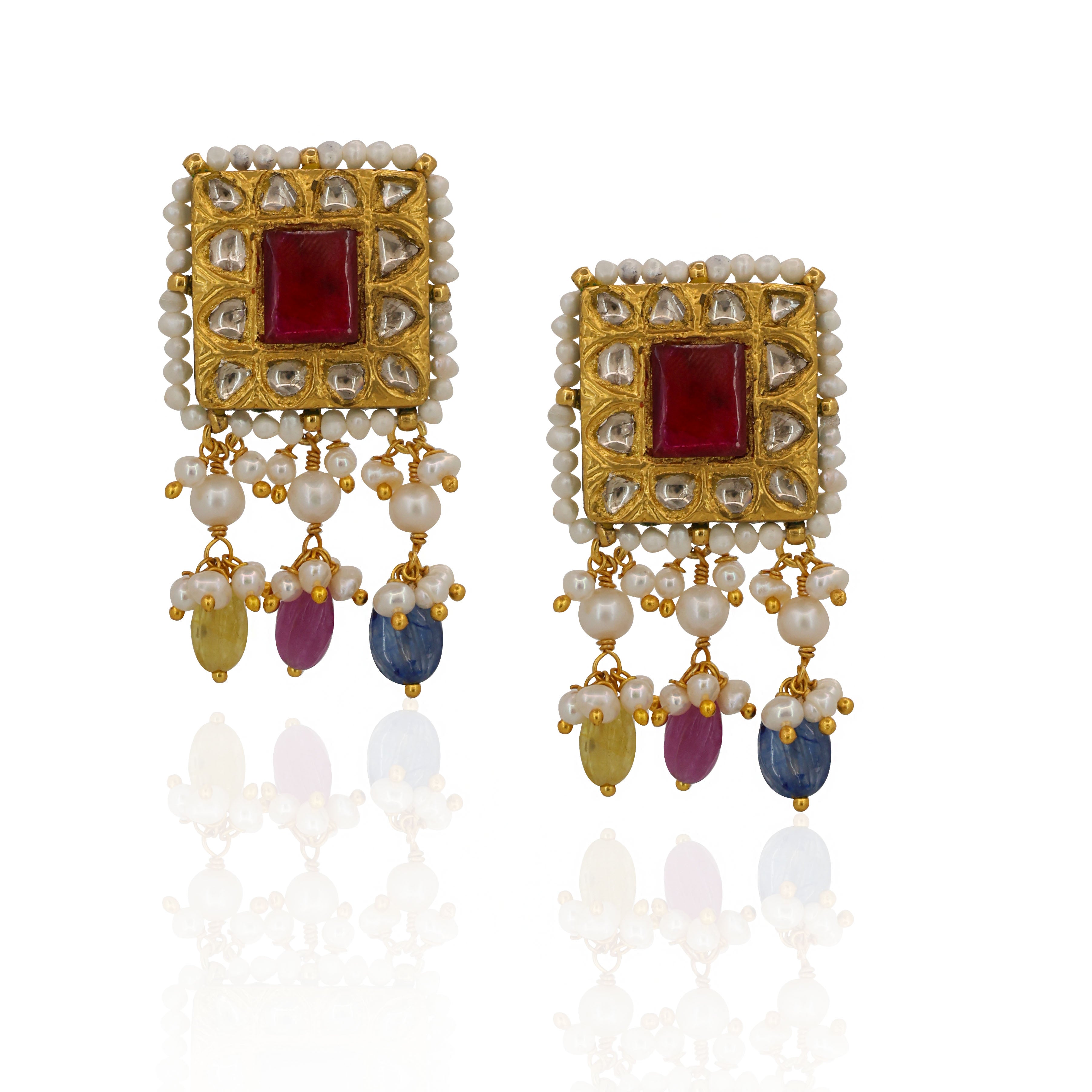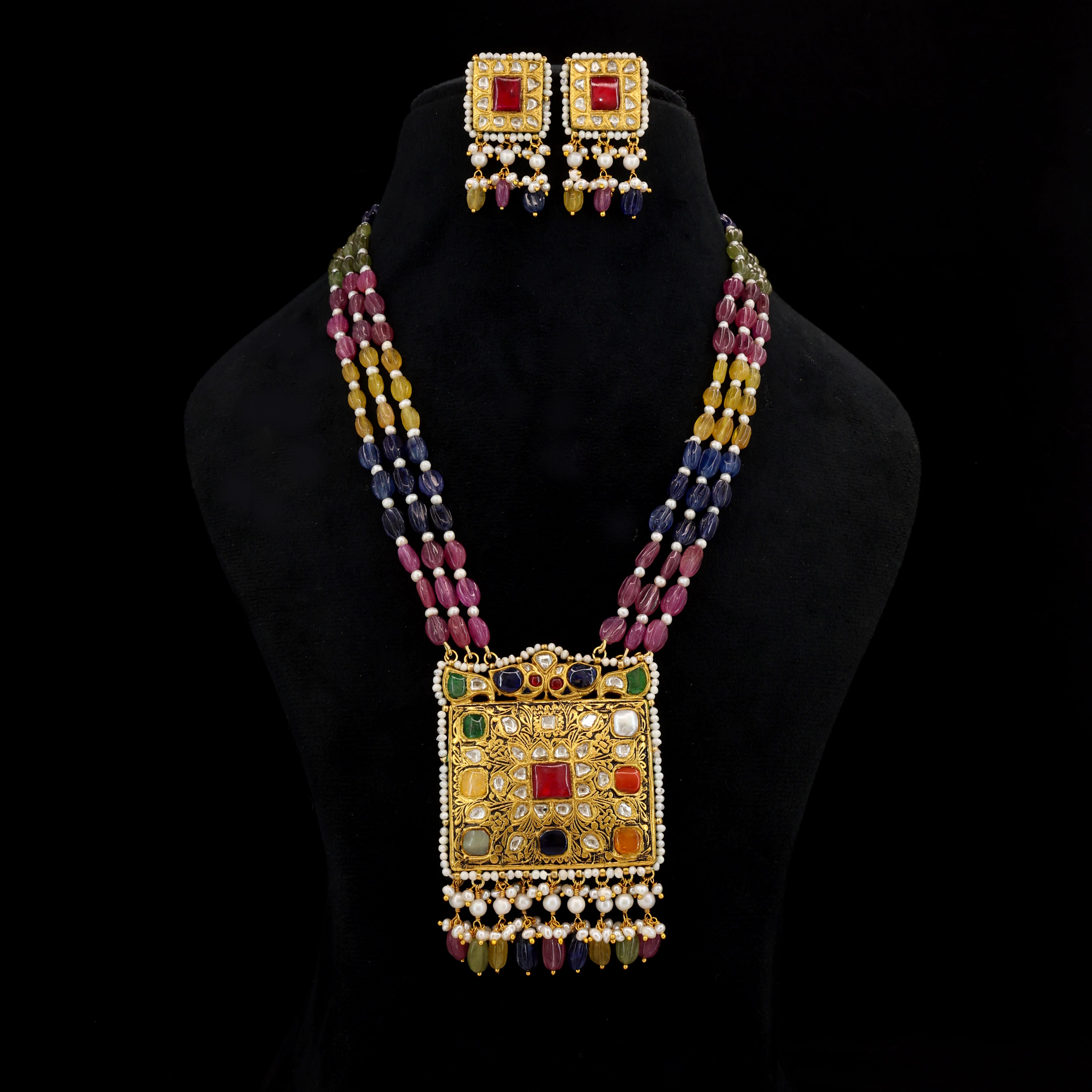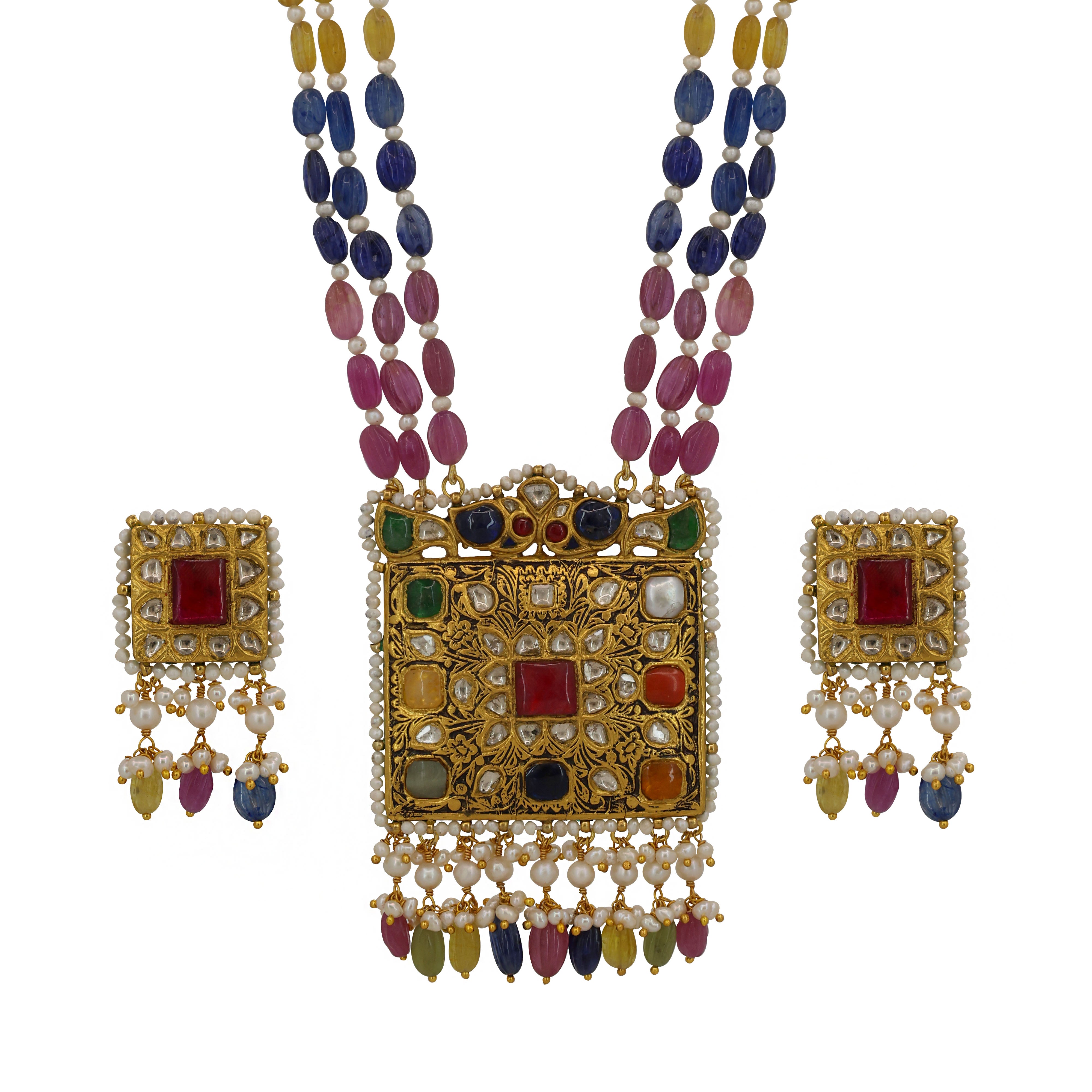 This exquisite Gold Pendant Set features a square centerpiece intricately studded with Natural Syndicate Polki Diamonds and vibrant Navratna gemstones. Complemented by matching earrings, the set is elegantly stringed with Natural Multi-Sapphire beads and delicate Pearls, blending traditional Indian craftsmanship with timeless regal charm.