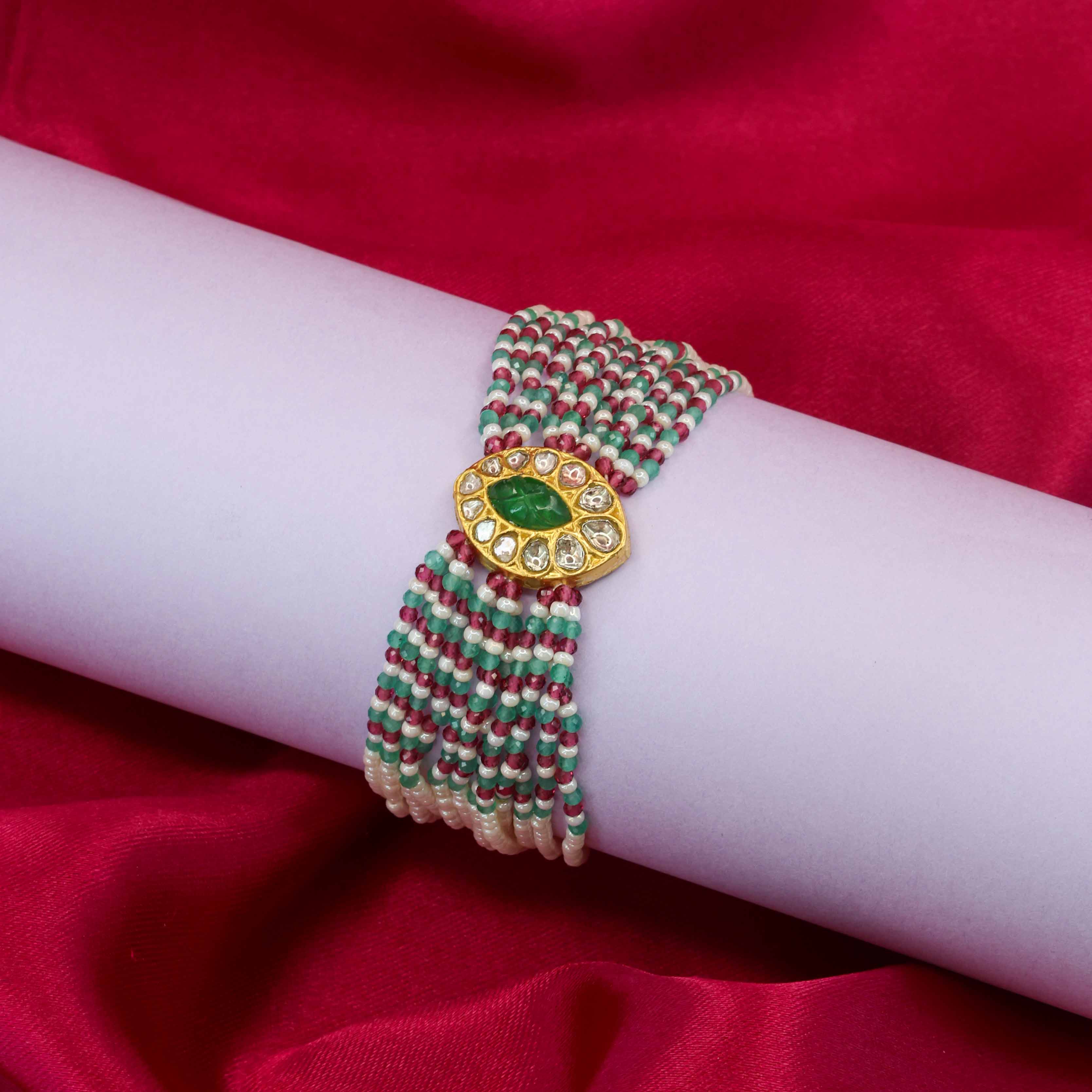 This bracelet features a central gold Natural Syndicate Polki diamond setting with an oval Glass emerald stone, flanked by multiple strands of Pearl, green, and pink beads.