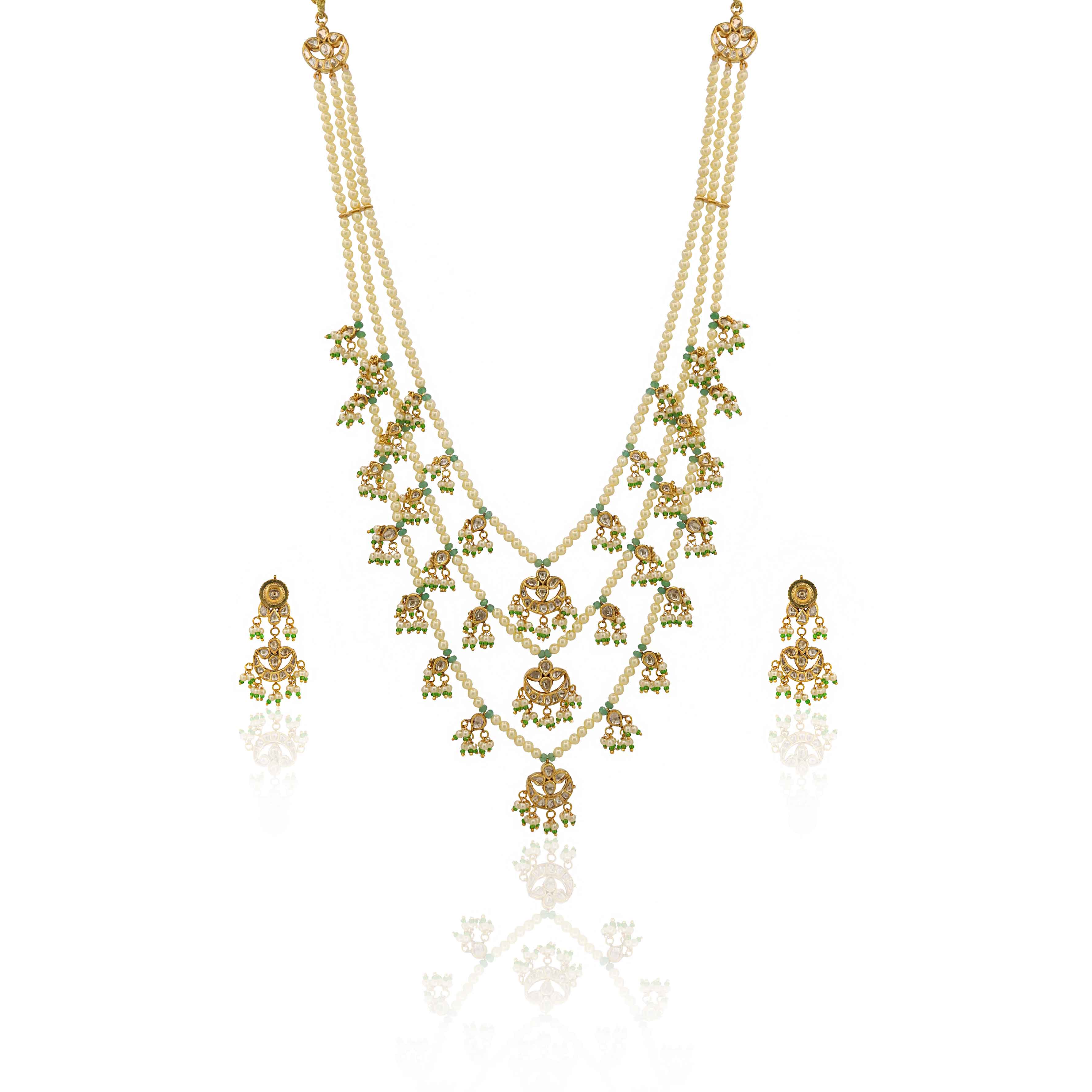This exquisite Gold Jadau Teen Lada necklace features three strands of natural Polki diamonds and pearls, accented with green glass beads. The set includes matching earrings, all showcasing intricate traditional craftsmanship.