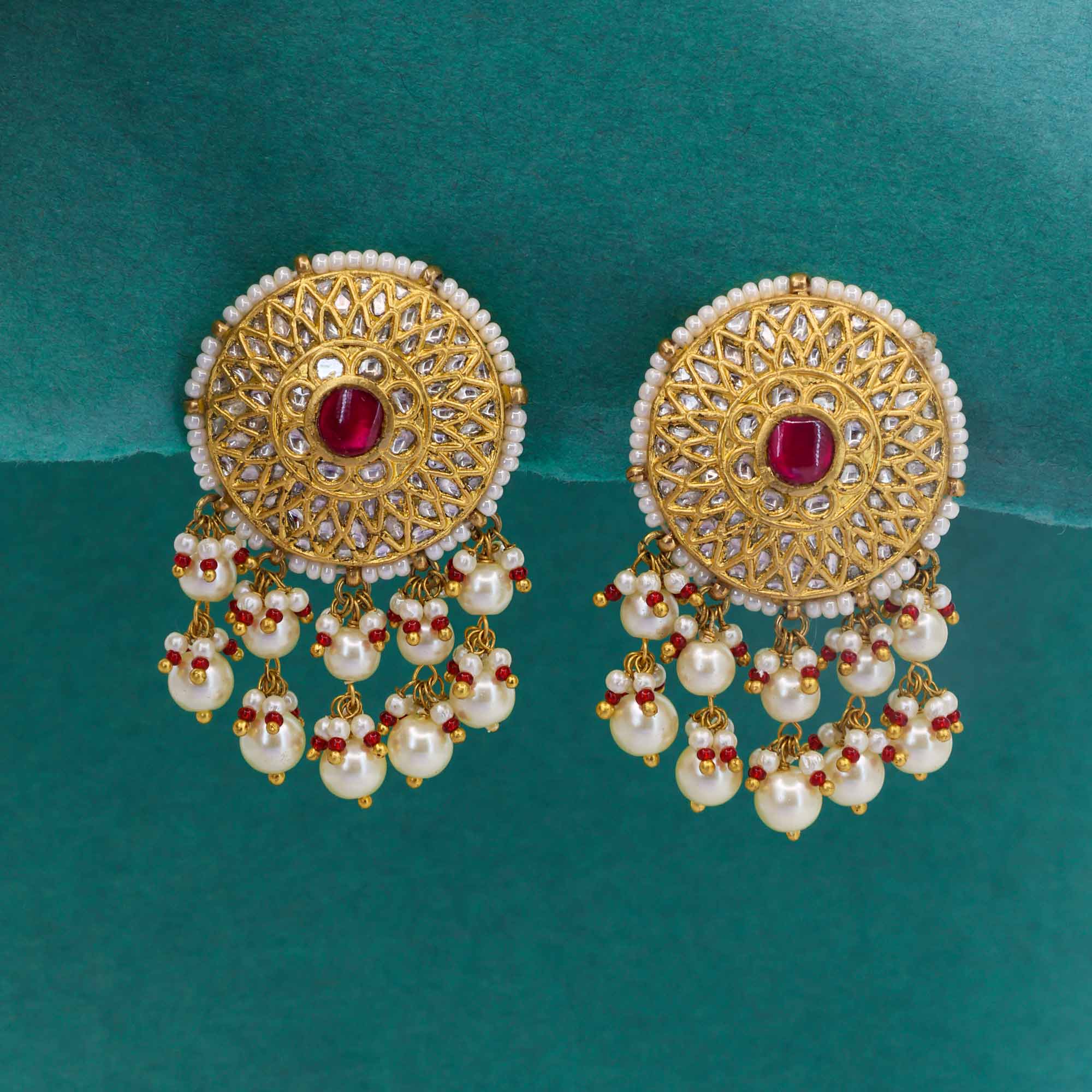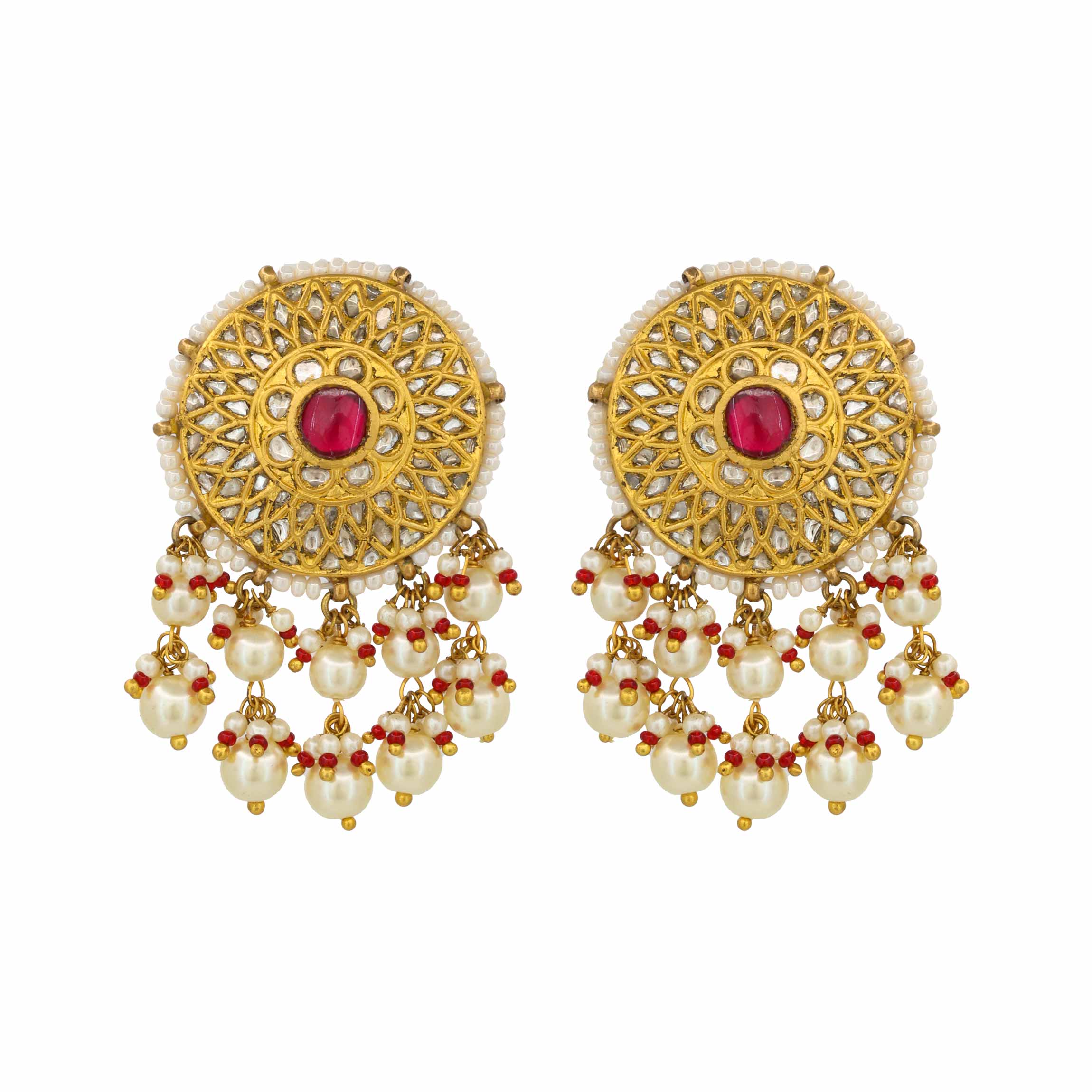 These stunning earrings feature a central Polki diamond surrounded by a circular gold design with a vibrant red ruby at its center. The intricate gold setting is bordered with tiny white pearls, and a cluster of dangling white pearls and smaller red beads hangs gracefully from the bottom, creating a beautiful and traditional Jhumka-style look.