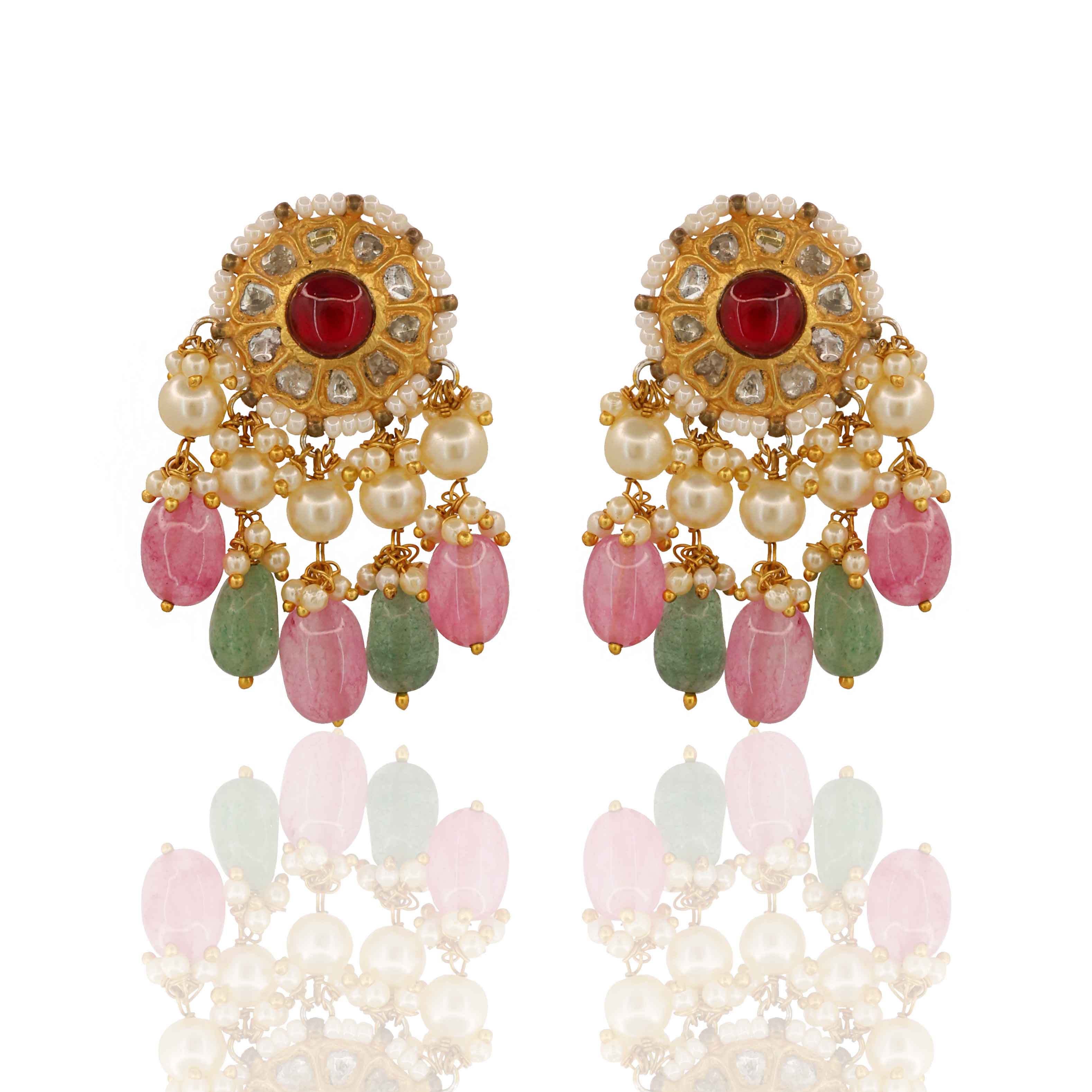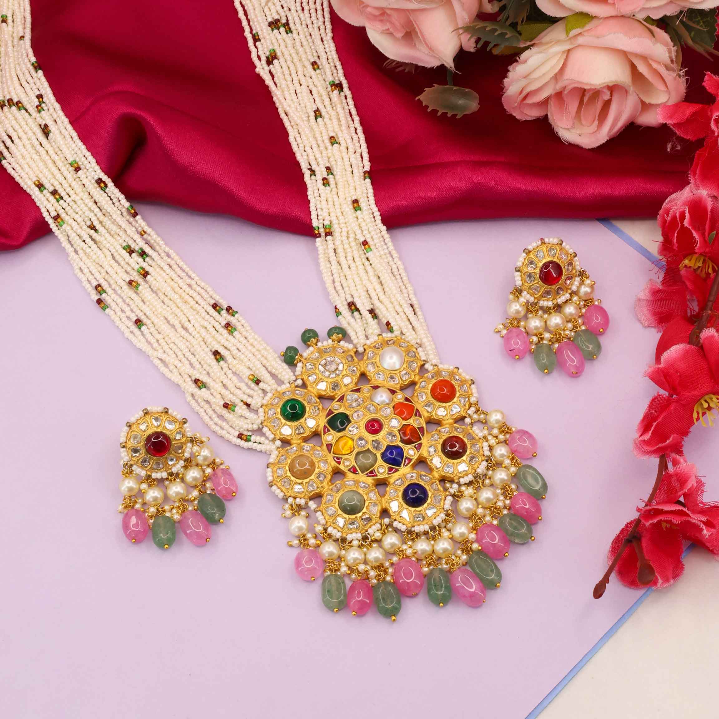 Regal Navratna Polki Pendant Set with multi-stringed pearls. Features nine sacred stones, gold Polki diamonds, and delicate Rose Quartz and glass-filled emerald drops.