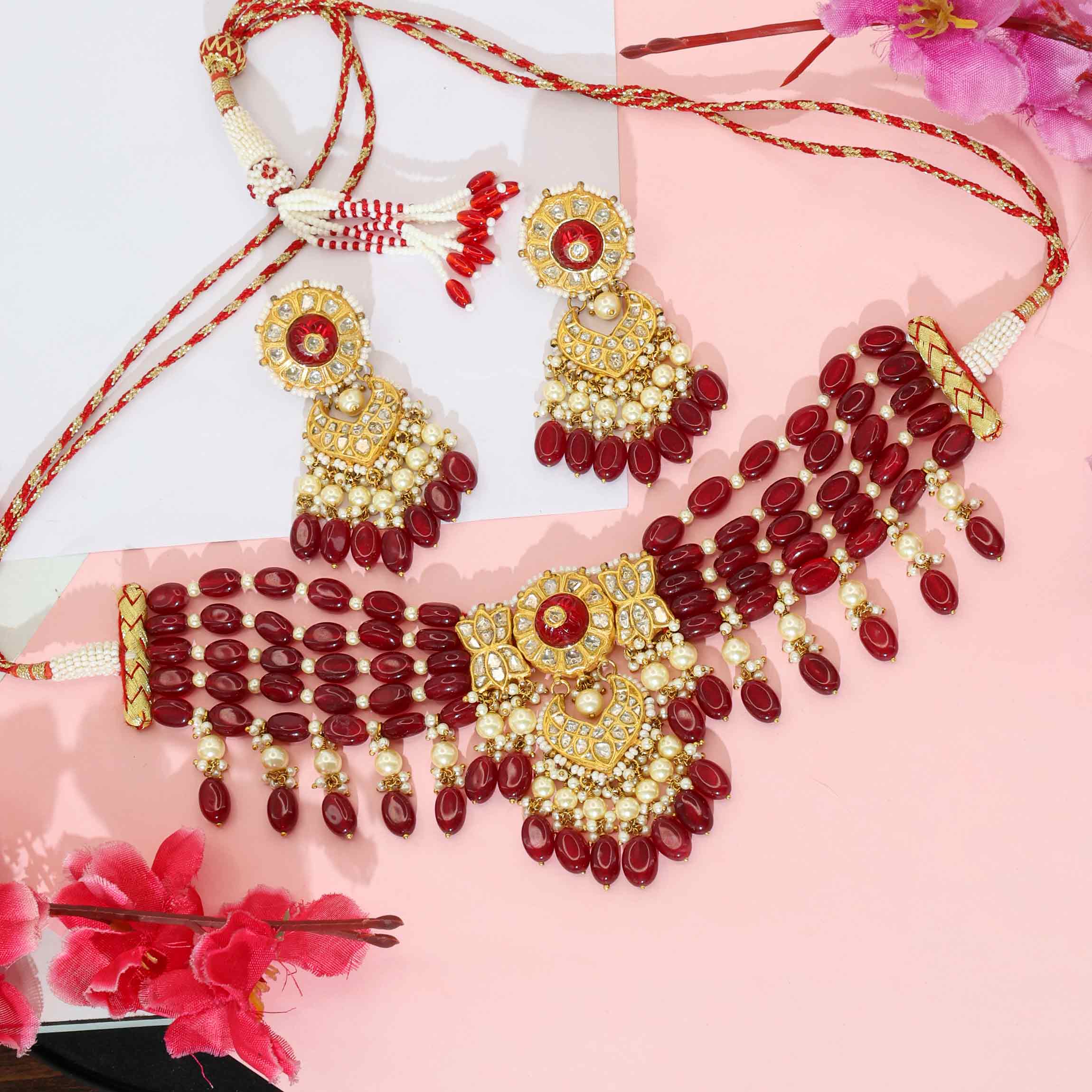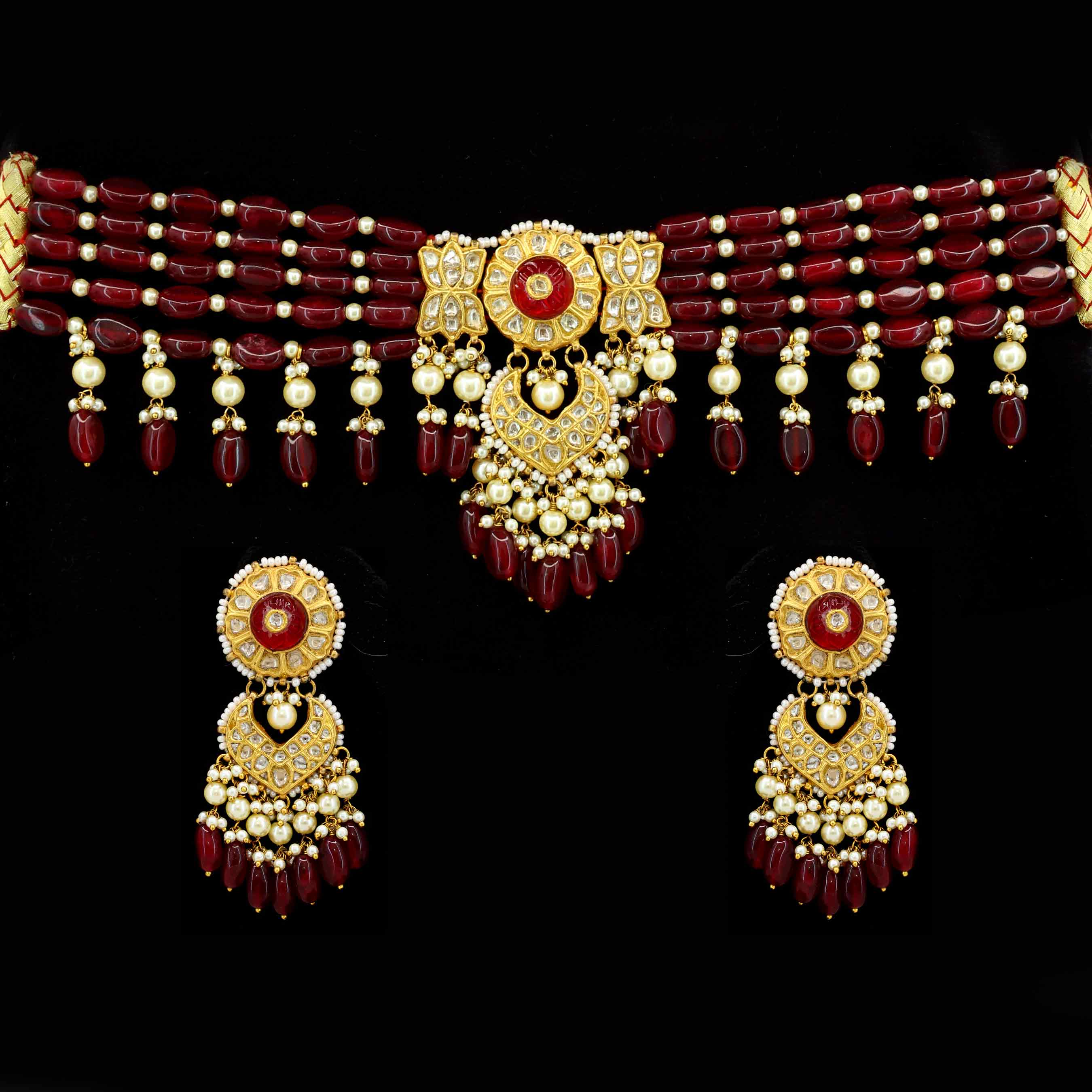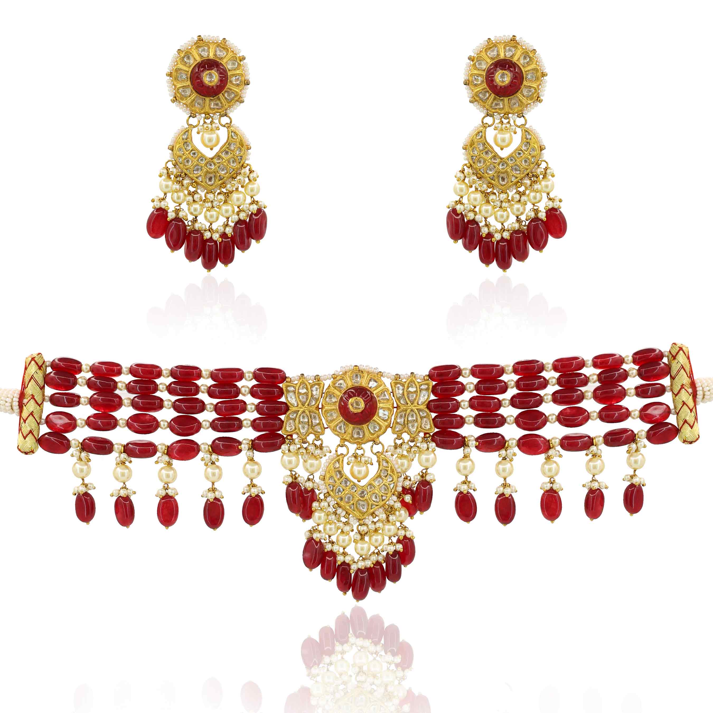 This elegant gold-plated choker set features a polki diamond centerpiece, complemented by strings of glass-filled ruby beads and pearls. The matching earrings complete the traditional, royal look.