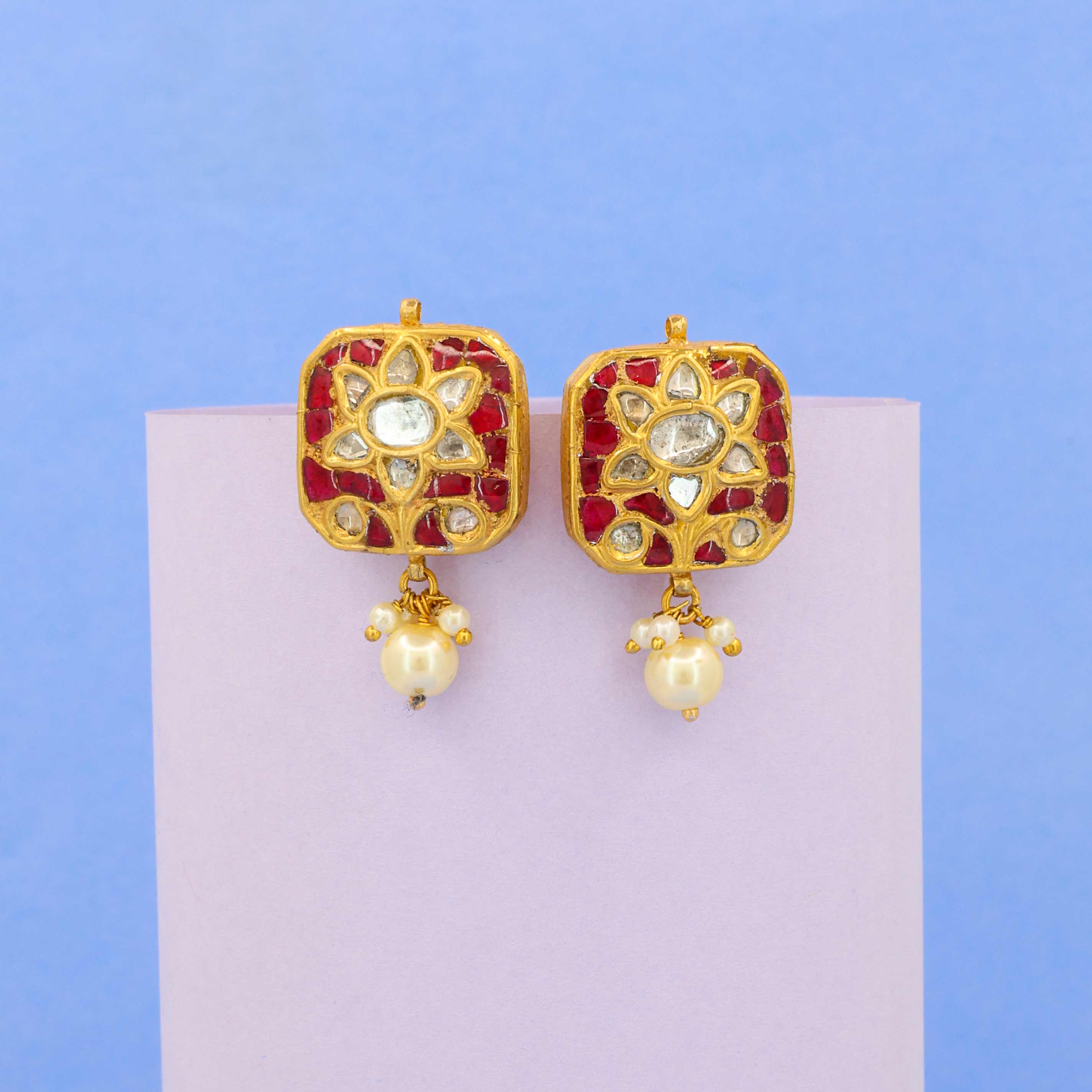 These striking earrings feature a central Polki diamond surrounded by a vibrant floral design of glass-filled rubies, all set in a gold-plated frame. A delicate pearl and small gold bead dangle from the bottom, adding an elegant touch. The combination of the bold red stones and the rustic Polki diamond gives the piece a classic, traditional feel.
