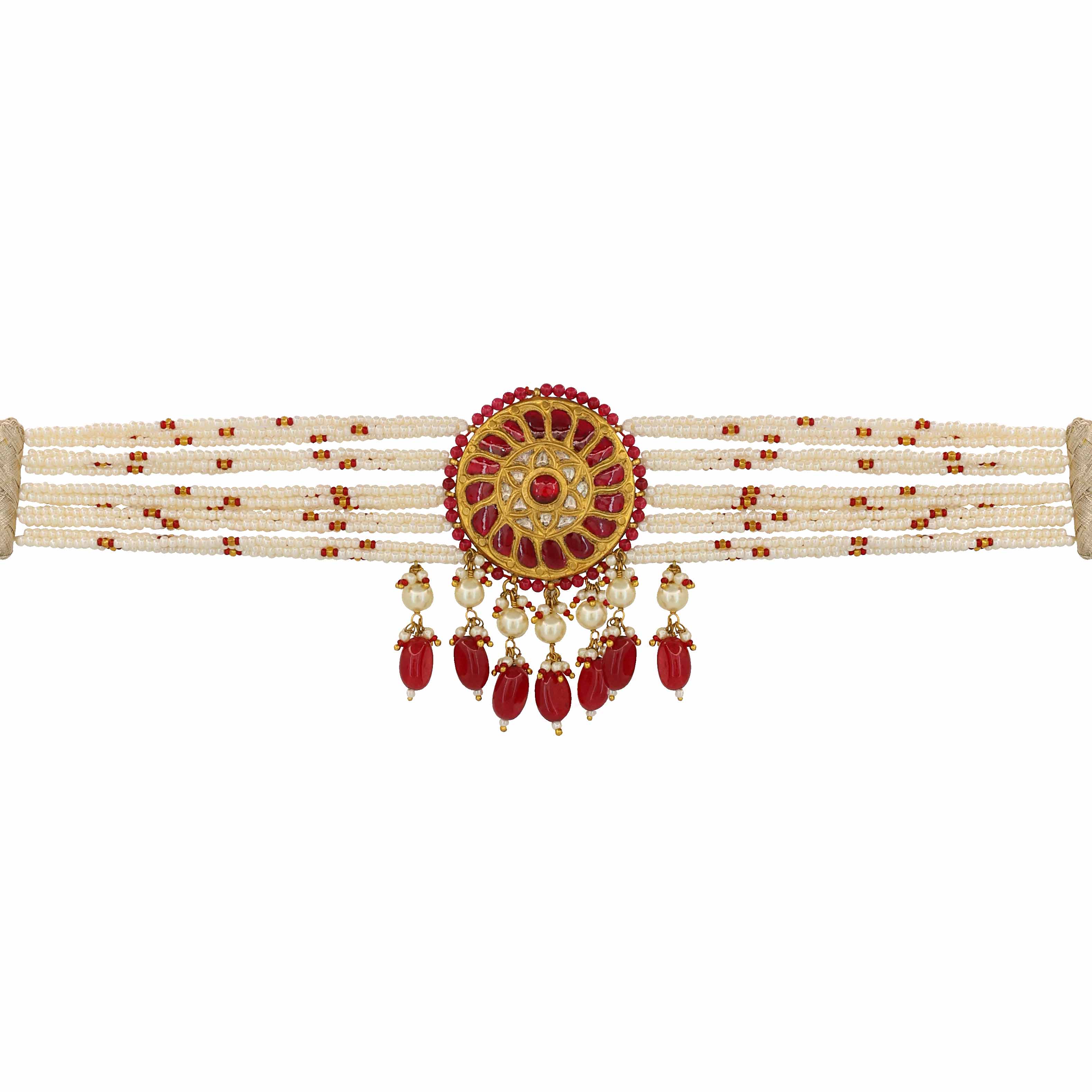 This choker features a gold centerpiece with Polki diamonds and glass rubies on multiple strands of pearls and glass ruby beads.
