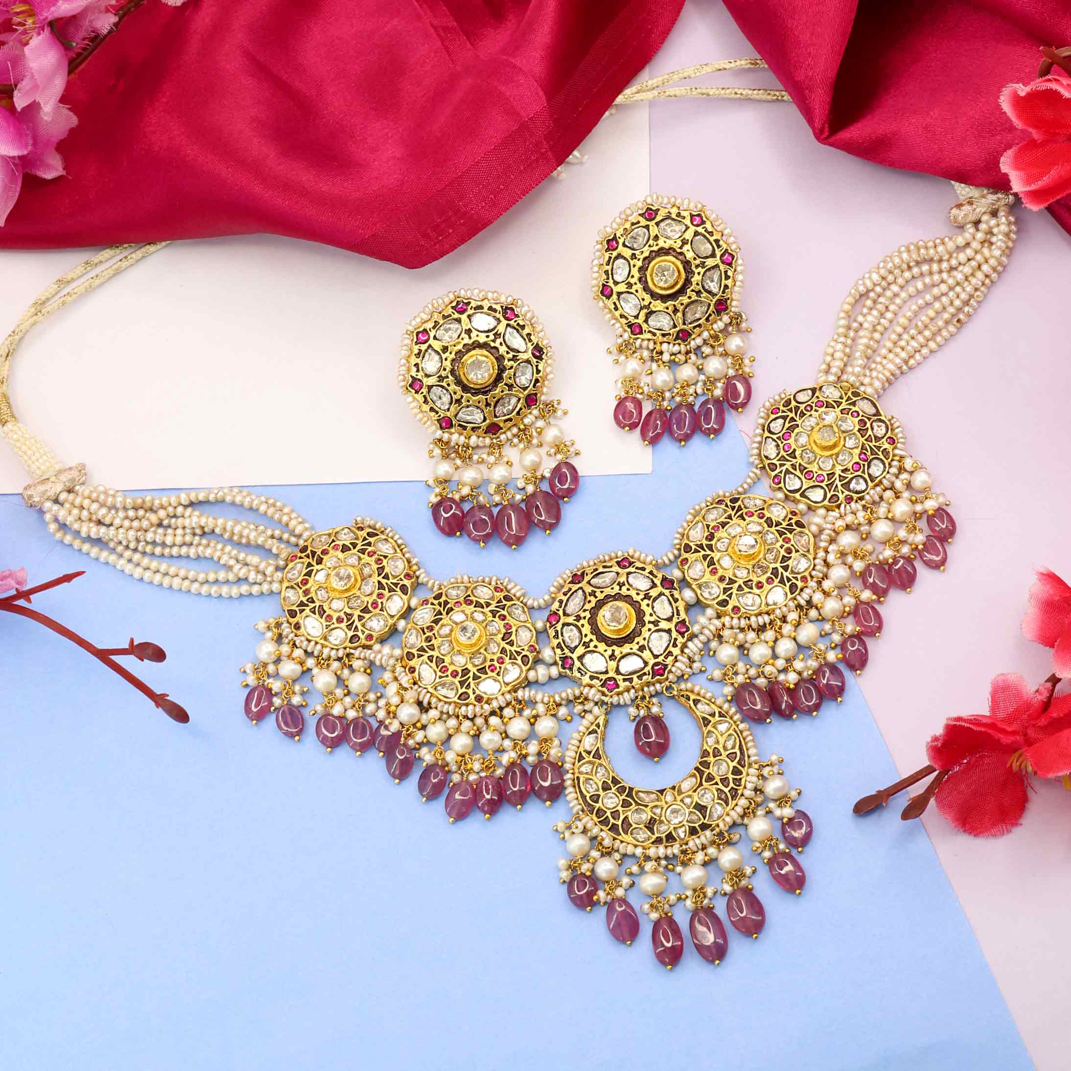 The piece showcases stunning circular motifs inlaid with ruby-red glass filling, creating a rich contrast. A prominent central Chandbali pendant anchors the design. It is elegantly strung with multi-strand pearls and finished with cascades of alternating pearl and vibrant pink glass-filled ruby tassel drops, embodying traditional Jadau craftsmanship.