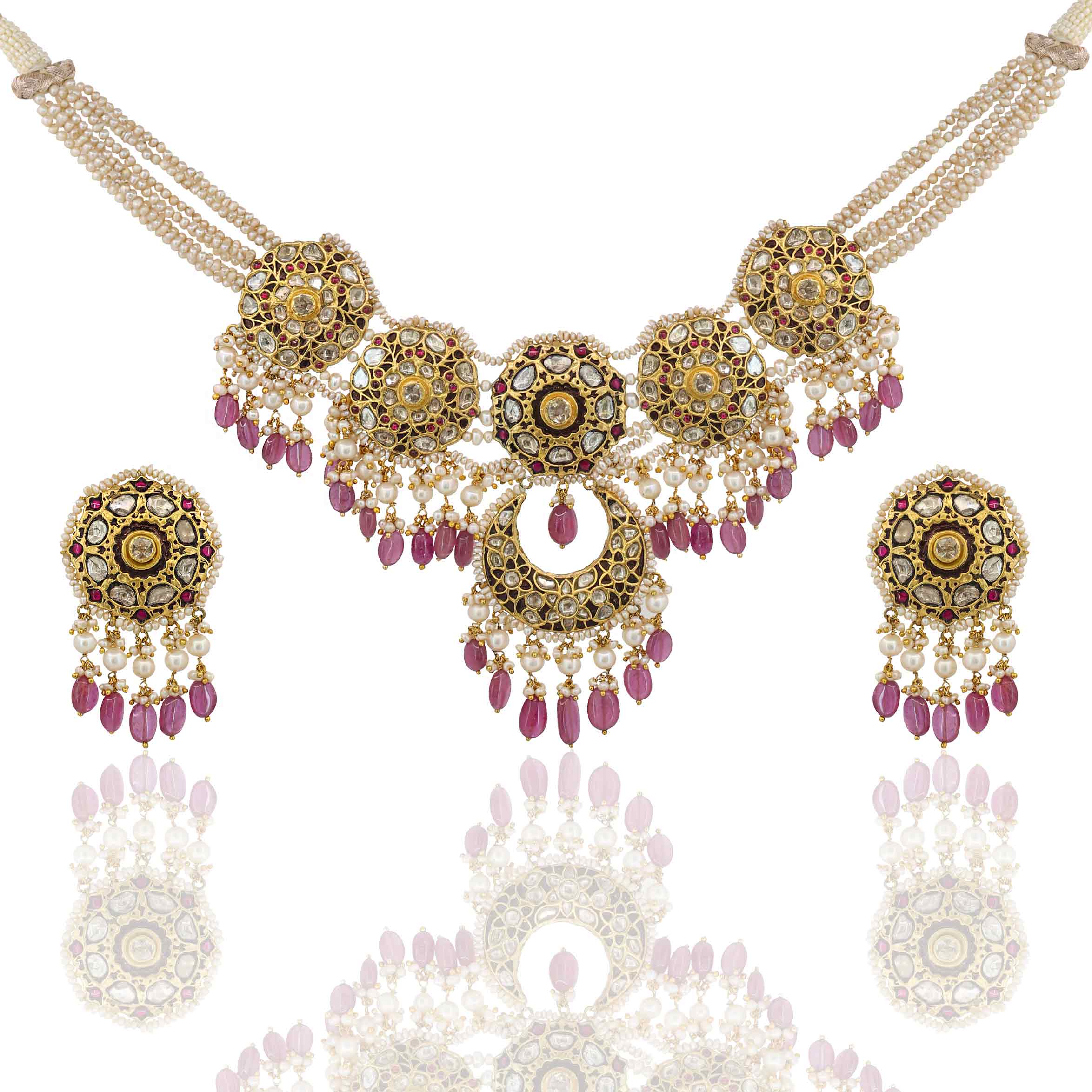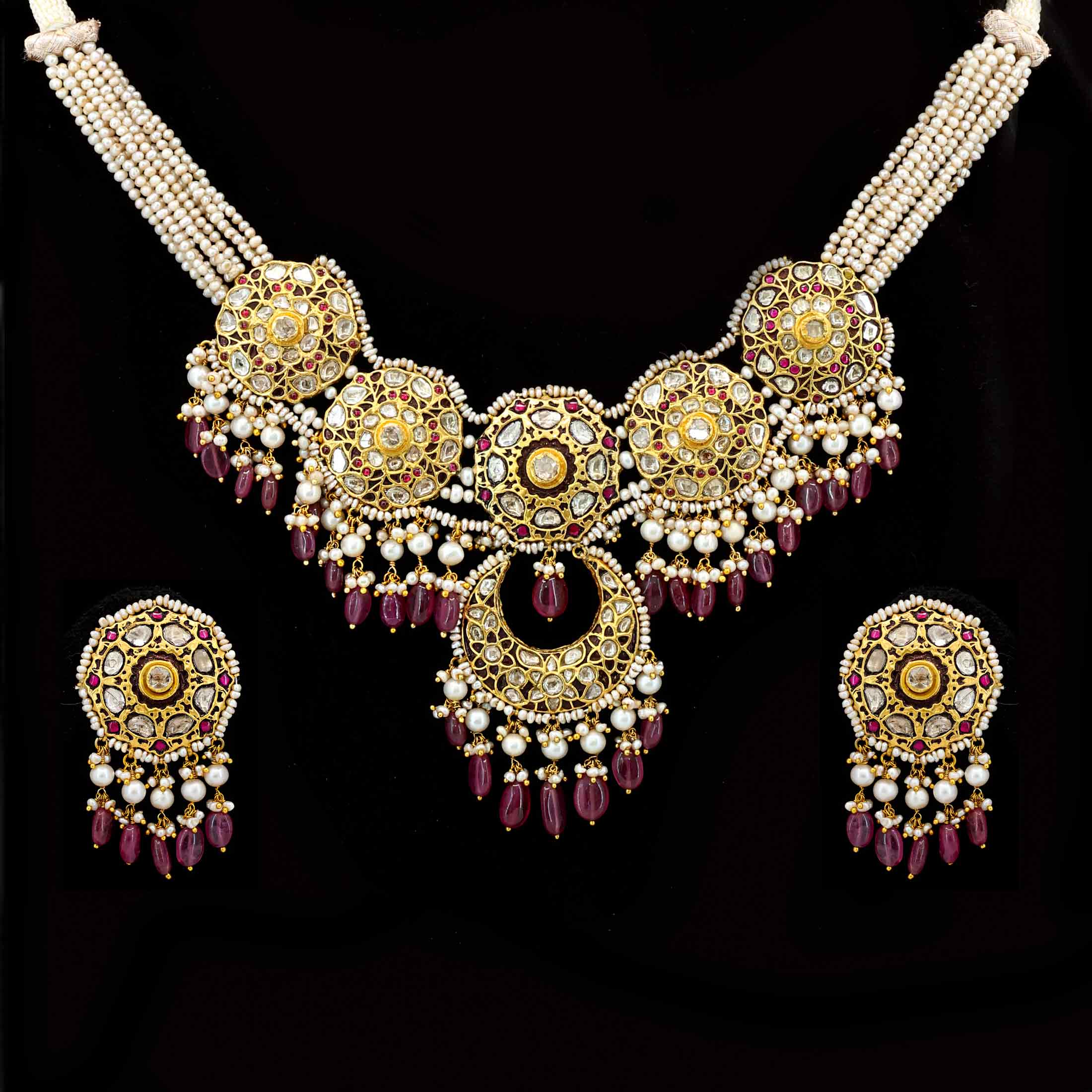 This majestic necklace set features an intricate design in gold, heavily studded with Syndicate natural Polki diamonds.