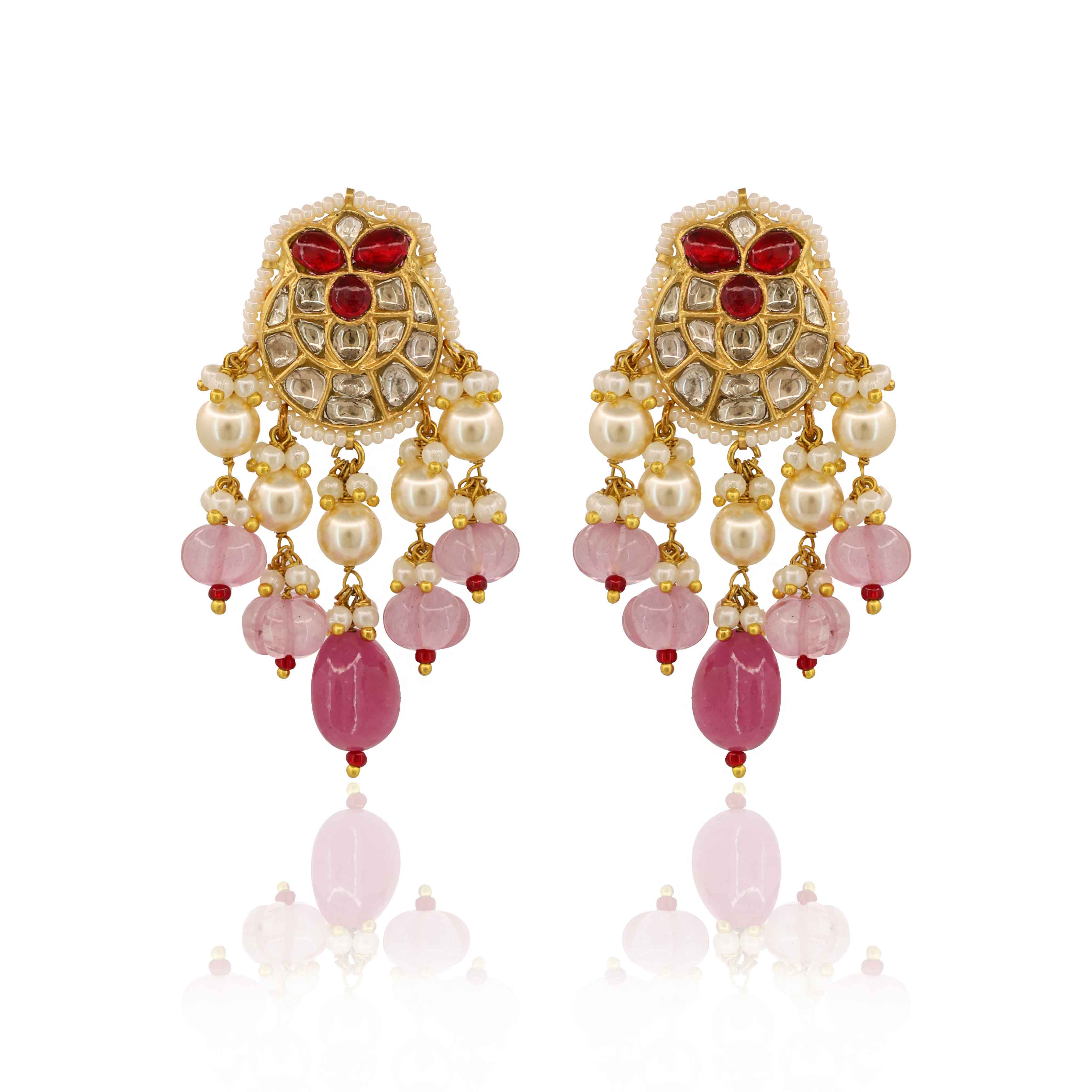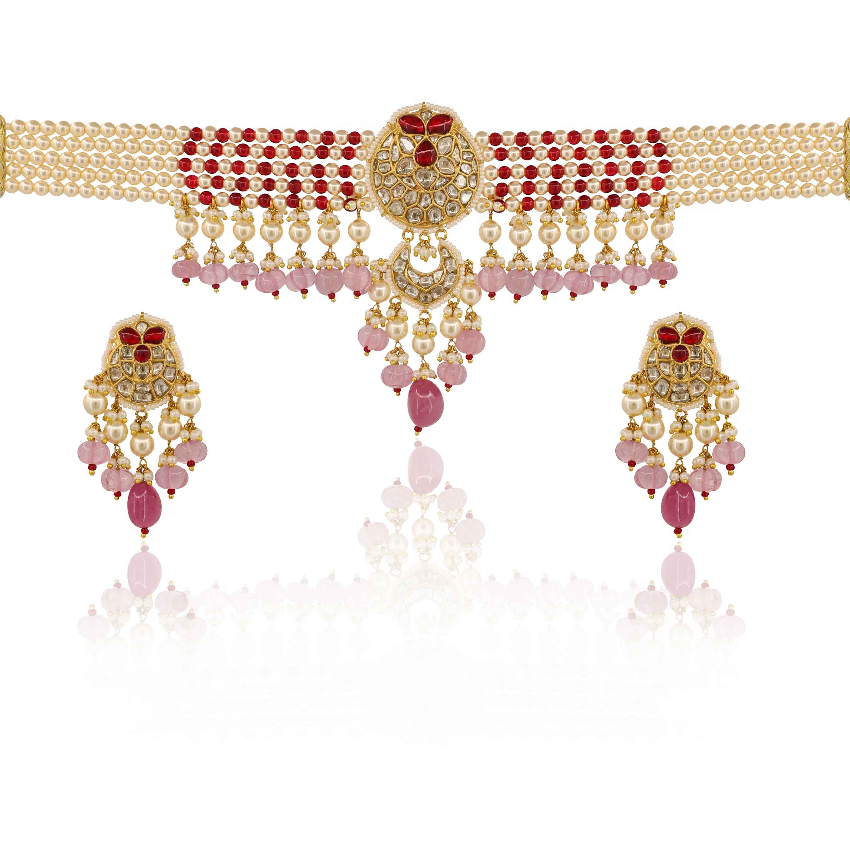 Stunning Polki Diamond Choker featuring an owl-inspired motif. The wide neckpiece and earrings are embellished with pearls, glass ruby beads, and rose quartz drops.