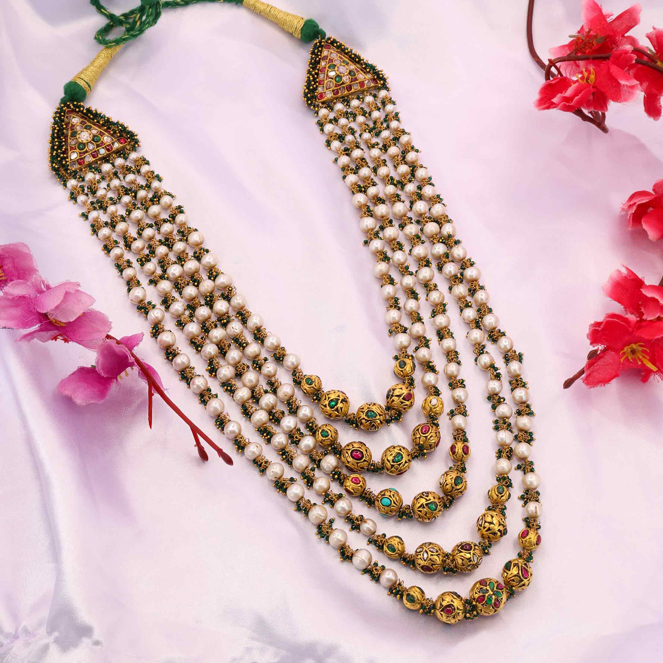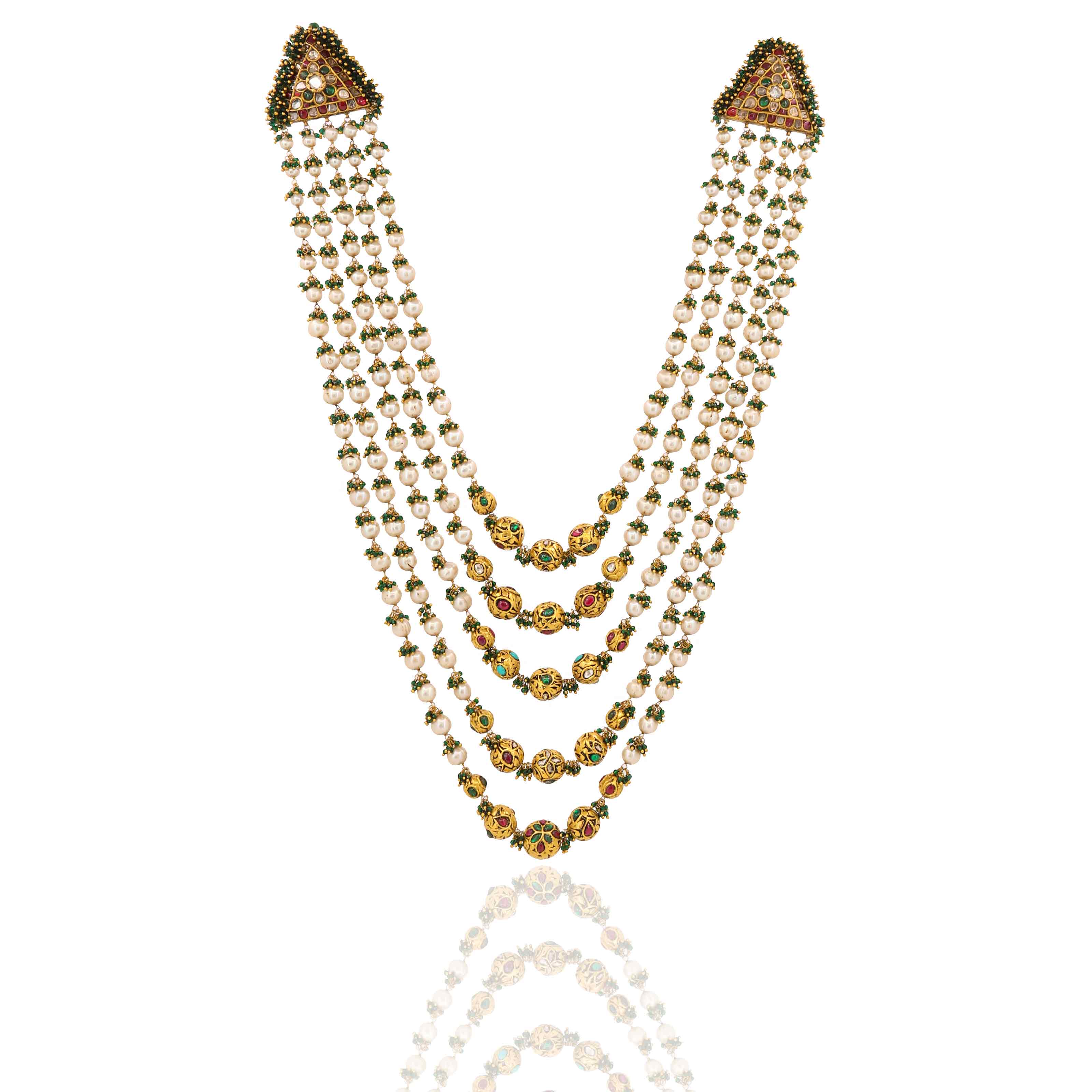 five-layer gold necklace is studded with natural Polki diamonds and rubies. The layers are elegantly strung with pearls and gold beads, culminating in stunning triangular pieces at the top. It's a grand piece of traditional jewelry.