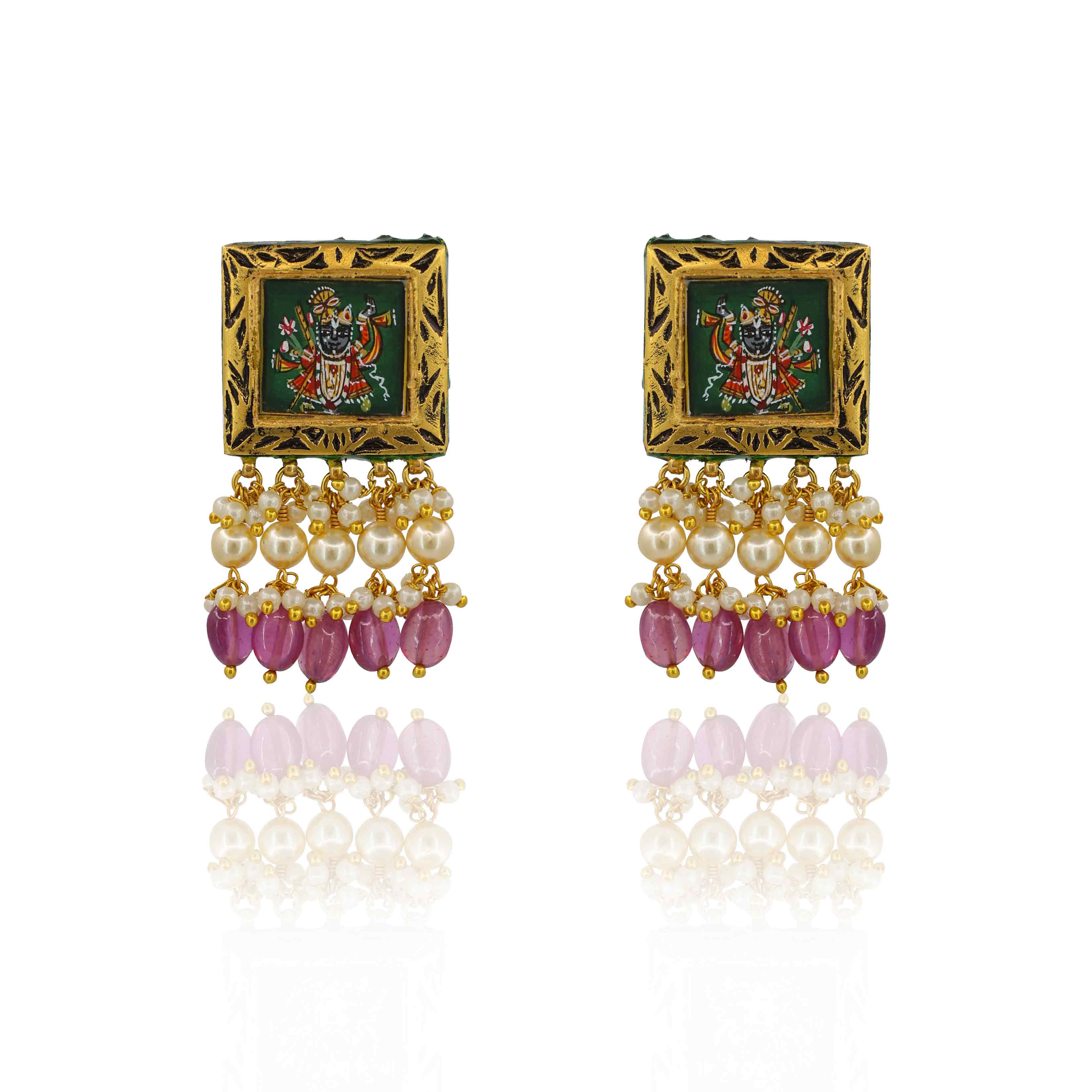 This striking Shreenathji Gold Necklace Set features a choker and a long mala, both adorned with hand-painted panels and subtle Polki diamonds. The set is richly strung with multi-strand pearls and features dangling glass-filled rubies and tiny emeralds, creating a luxurious, cohesive look.