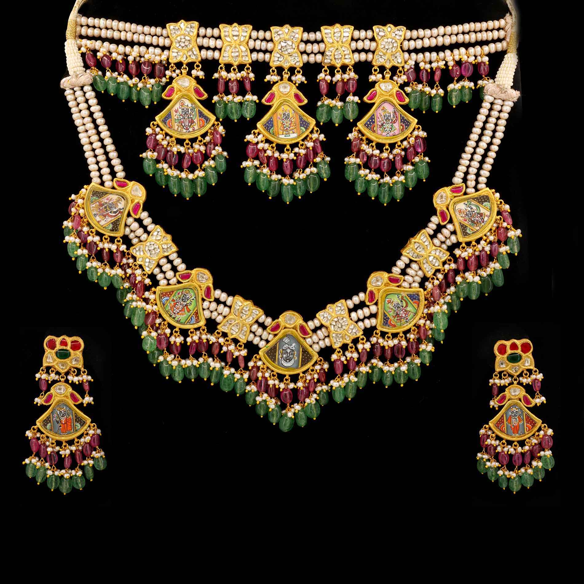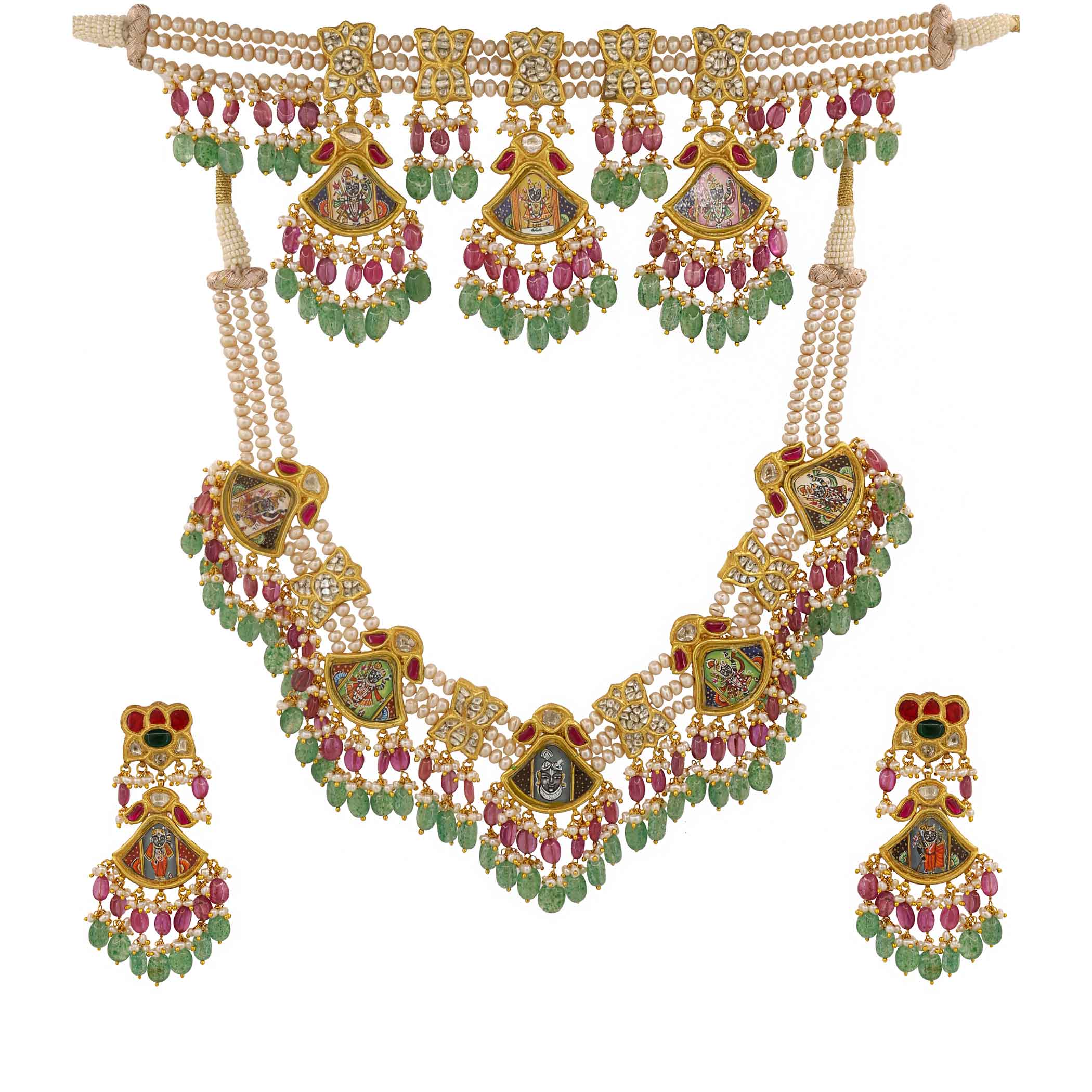 This elaborate Shreenath Ji set combines Polki diamonds and pearls with hand-painted devotional motifs. The layered look is completed with elegant dangles of Ruby and Emerald glass-filled beads.