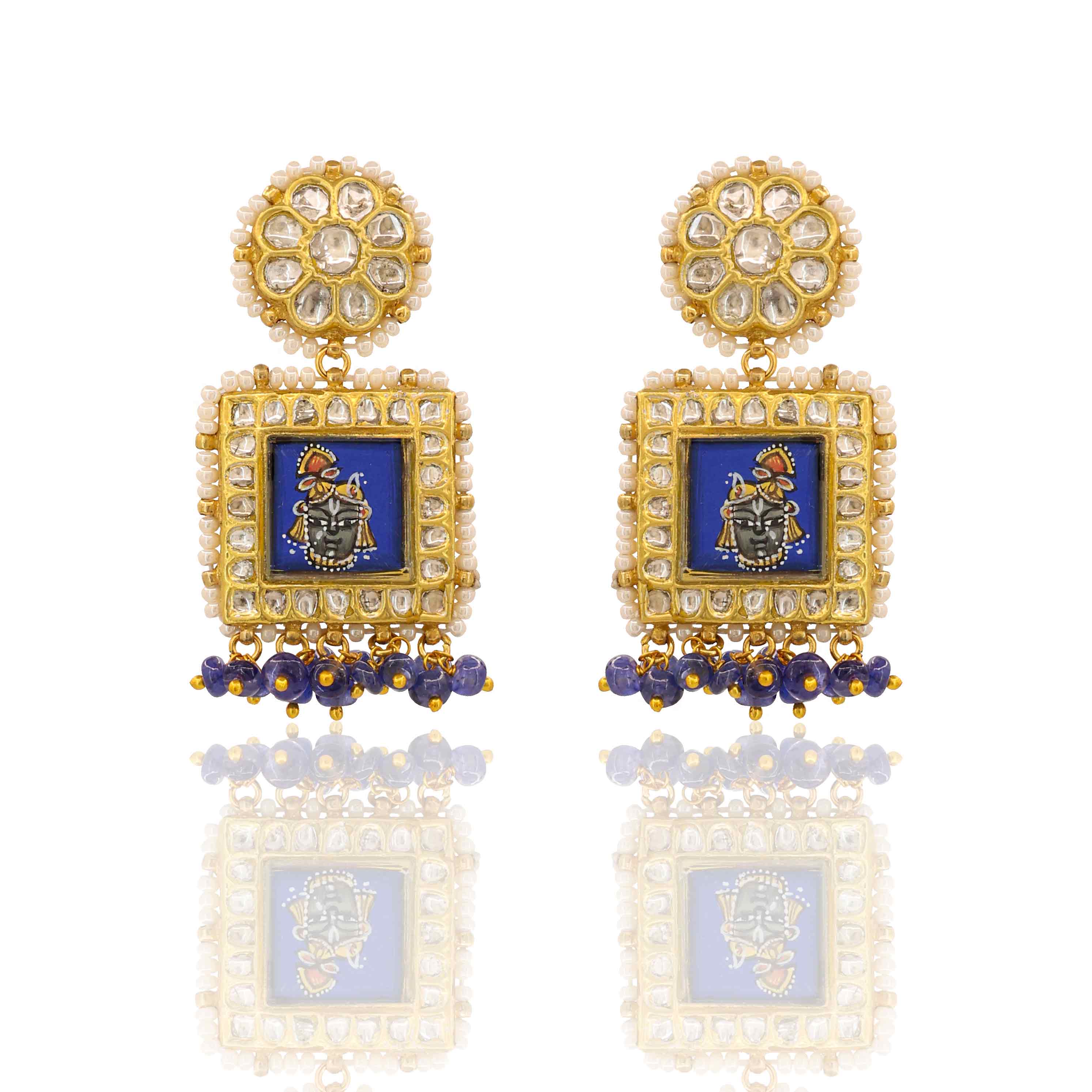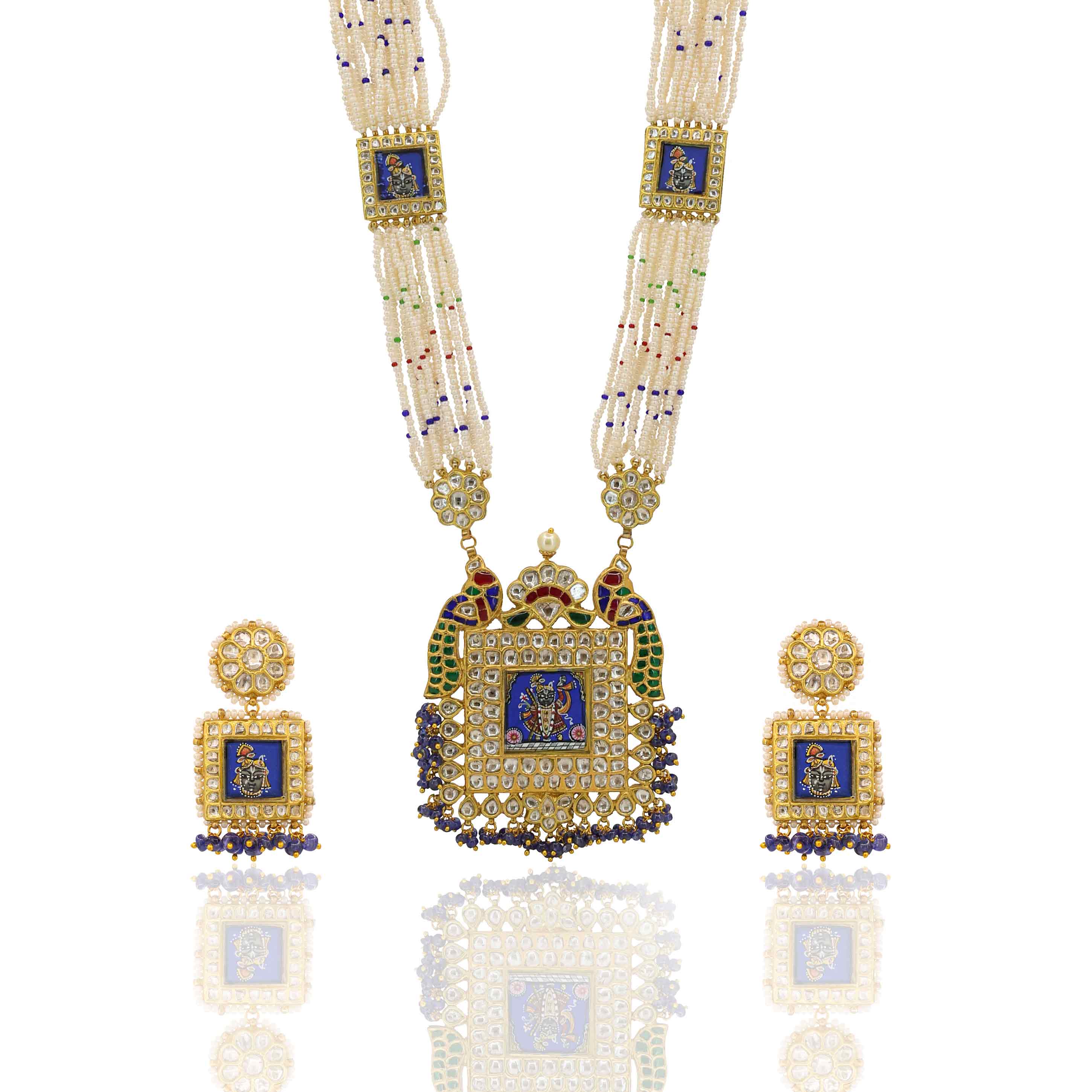 A Regal Shreenath Ji Pendant Set in gold, featuring natural Polki diamonds, ruby, emerald, and blue tanzanite. The pendant is strung on multi-layered pearl and colored bead strands, complemented by matching earrings.