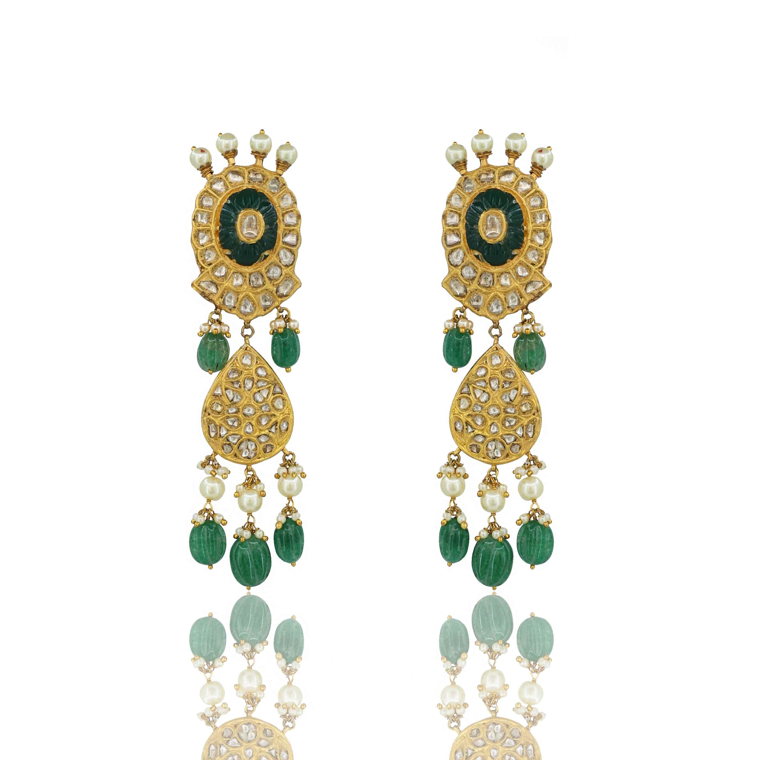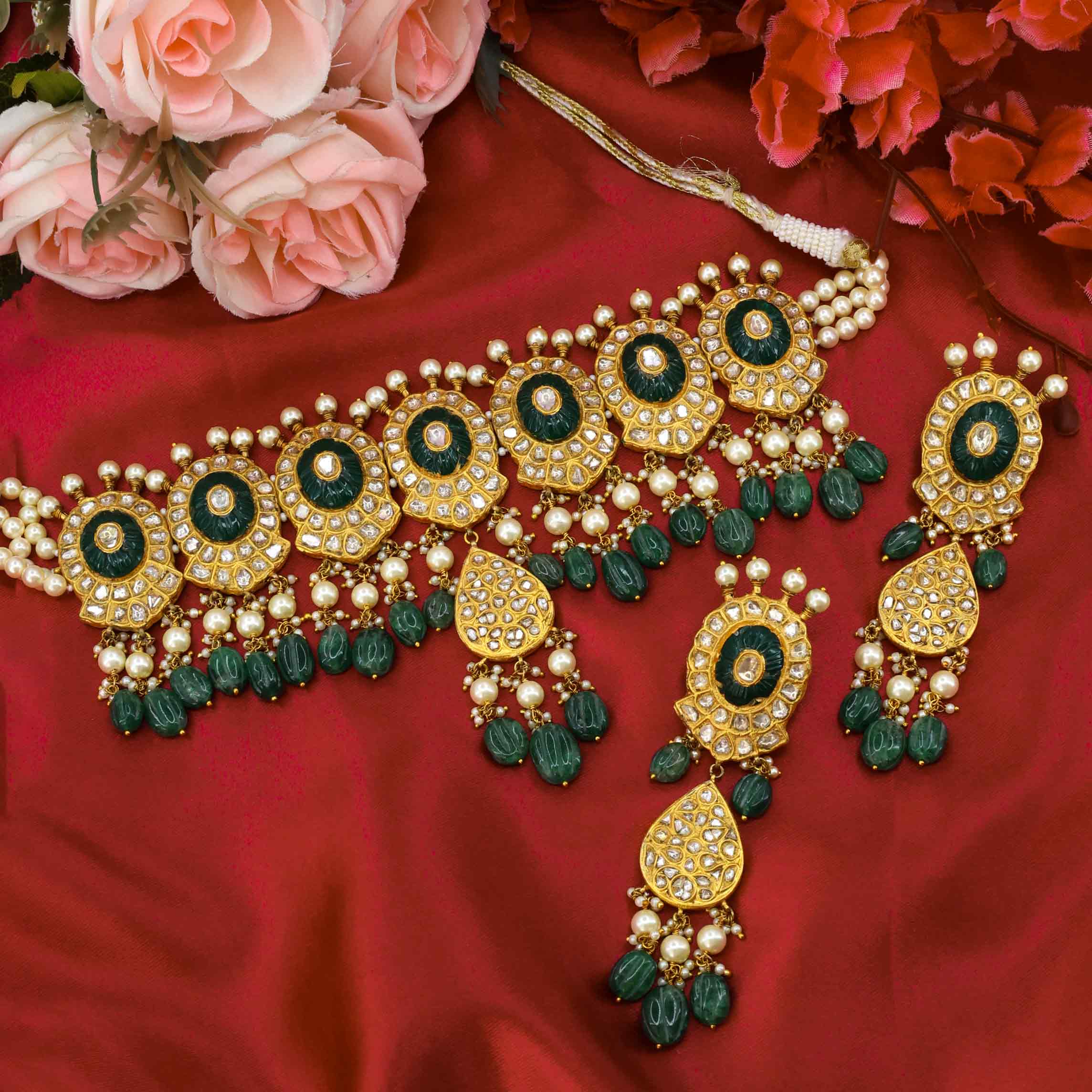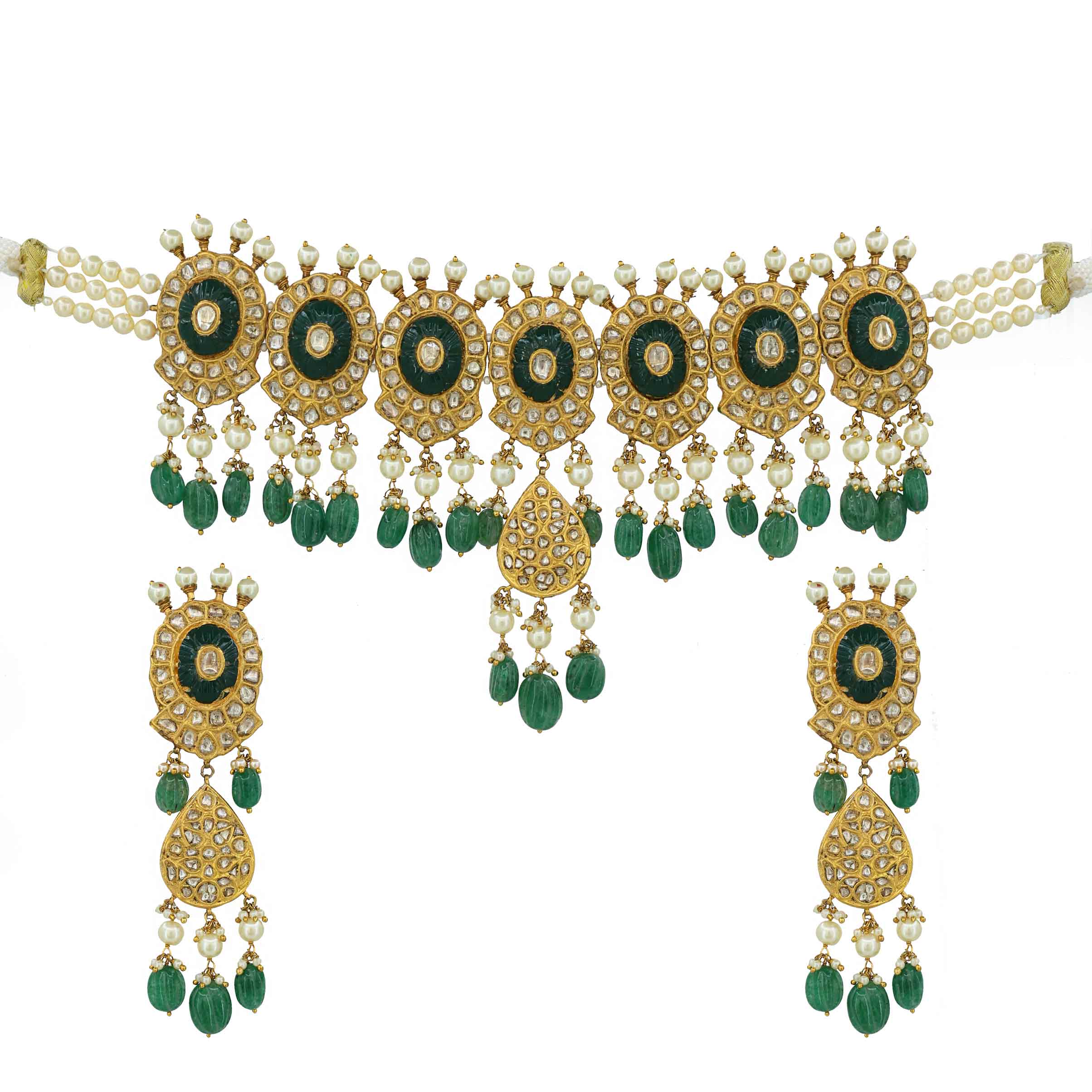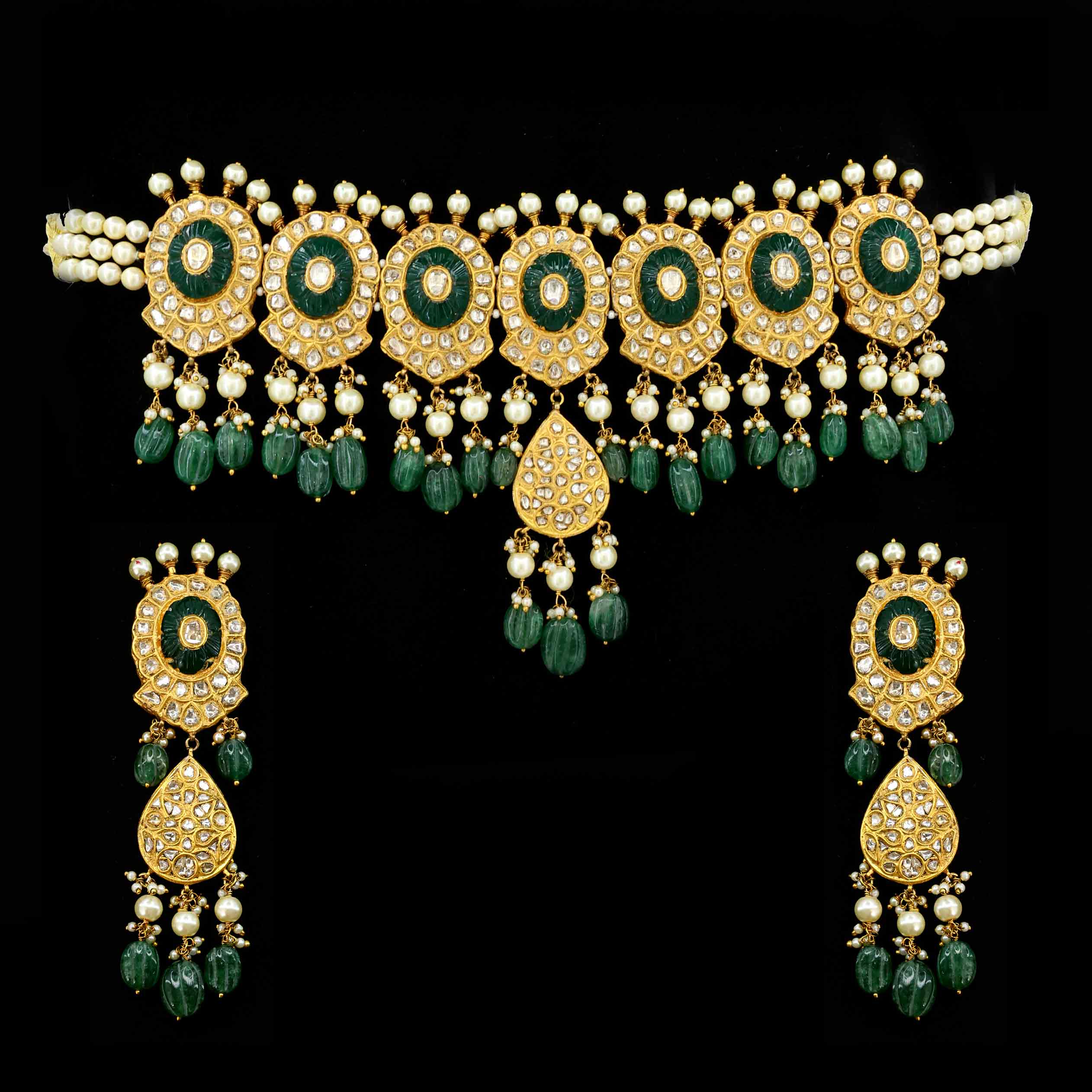This captivating gold choker necklace set boasts intricate green stone and natural polki diamond settings. Each element is beautifully strung with freshwater pearls and vibrant green beads, creating a rich and opulent design. Matching earrings complete this regal ensemble, perfect for a grand occasion.