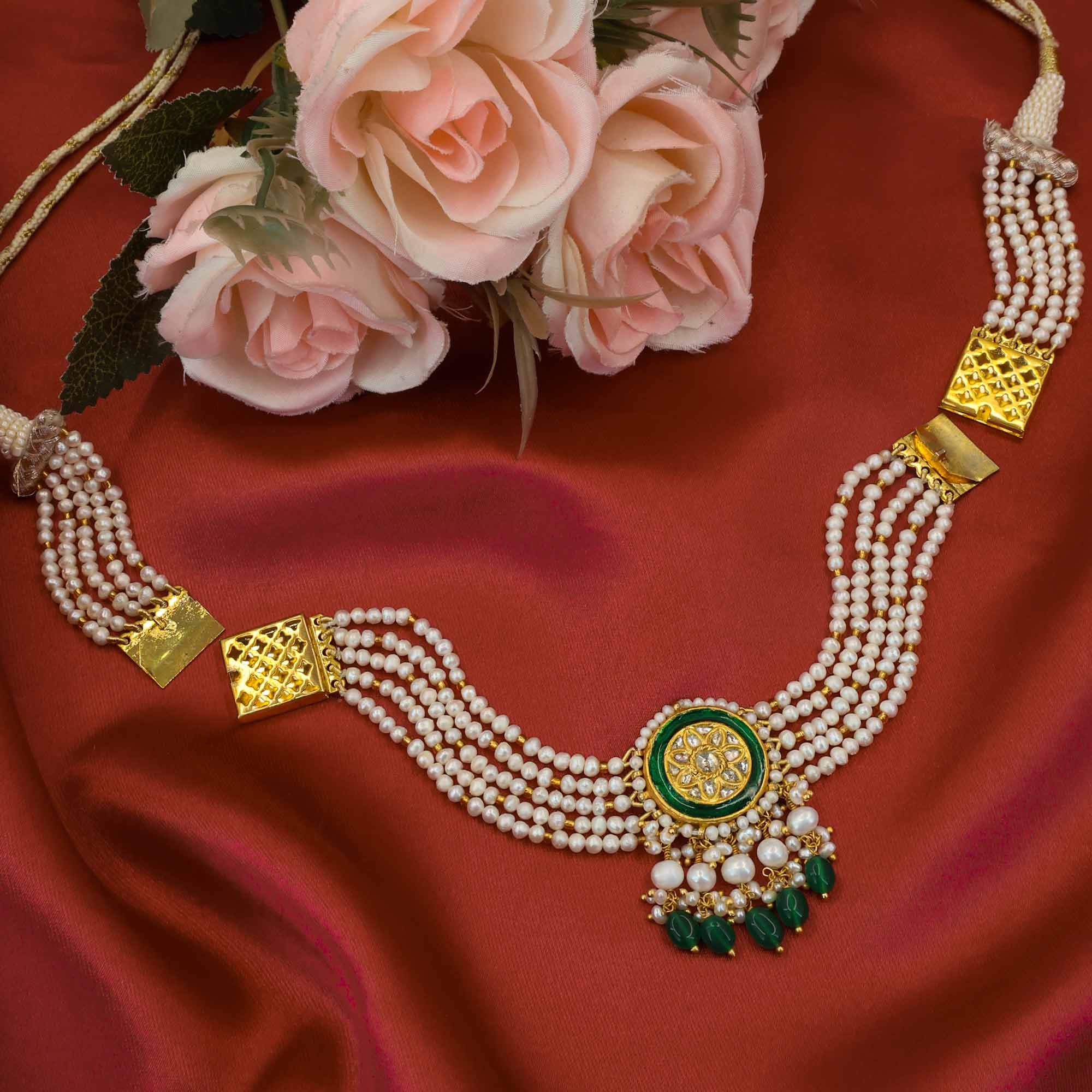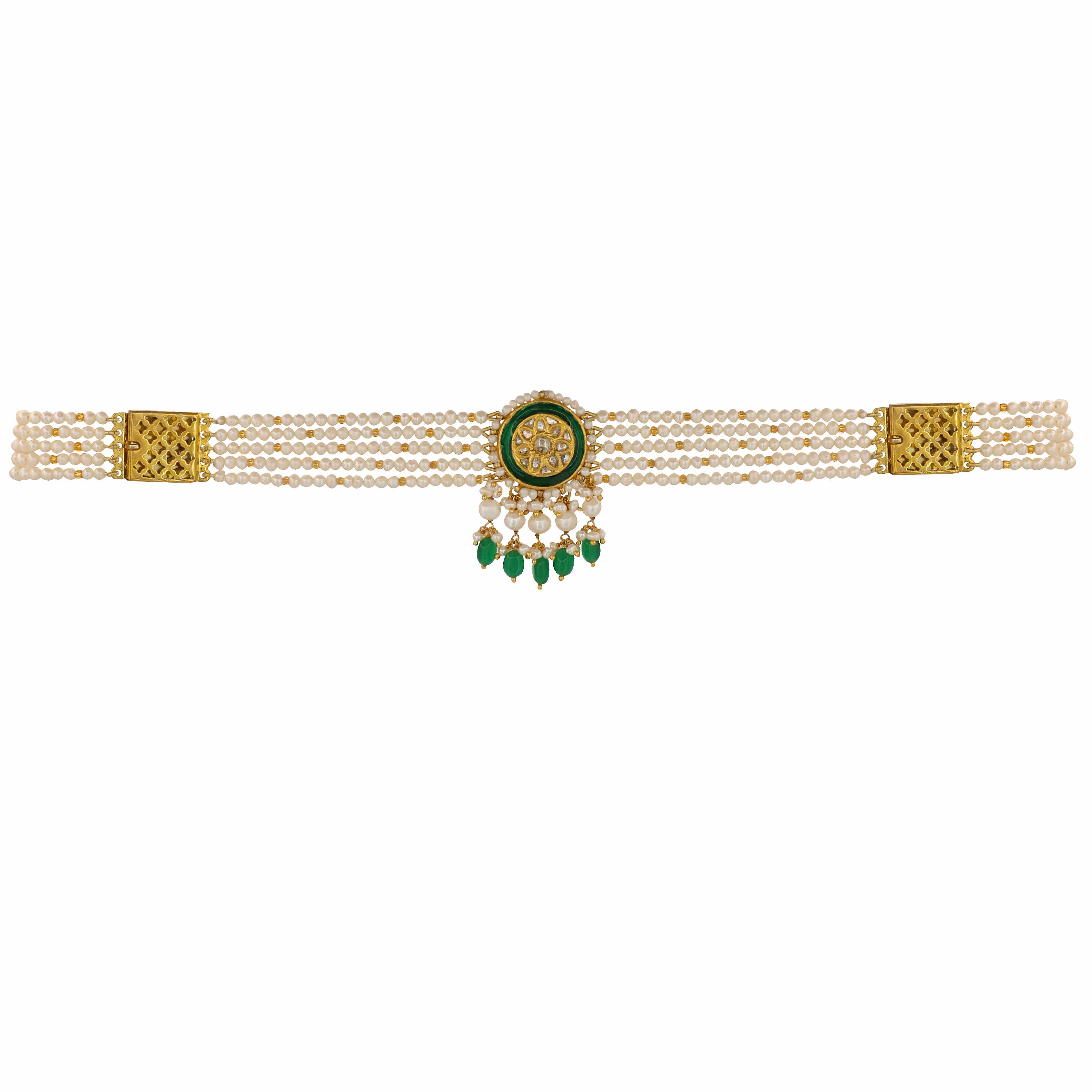 This elegant two-in-one choker and bracelet features a gold-plated centerpiece with Syndicate Polki diamonds and a deep green glass filling stone. The piece is delicately strung with multiple strands of pearls and is accented with green drops.