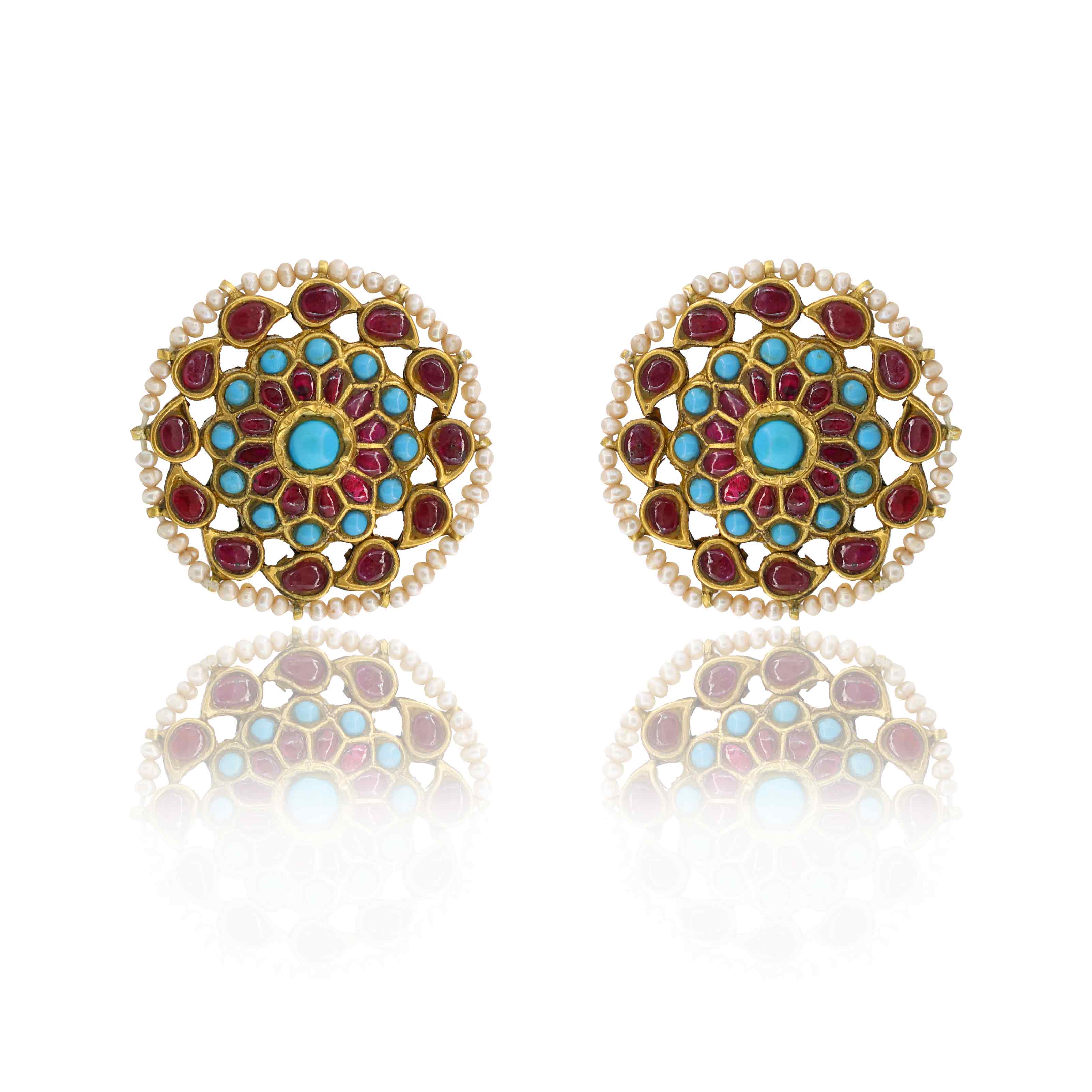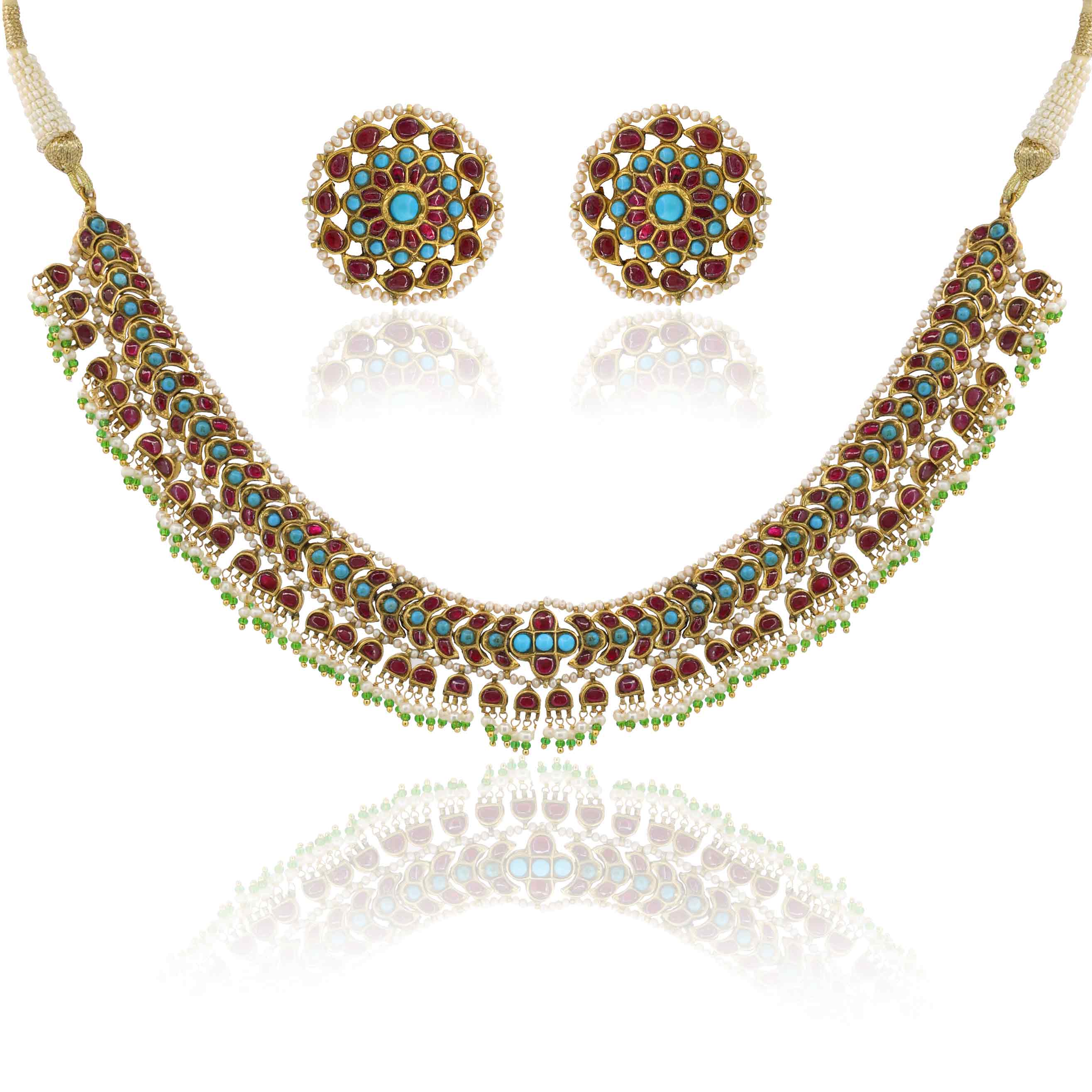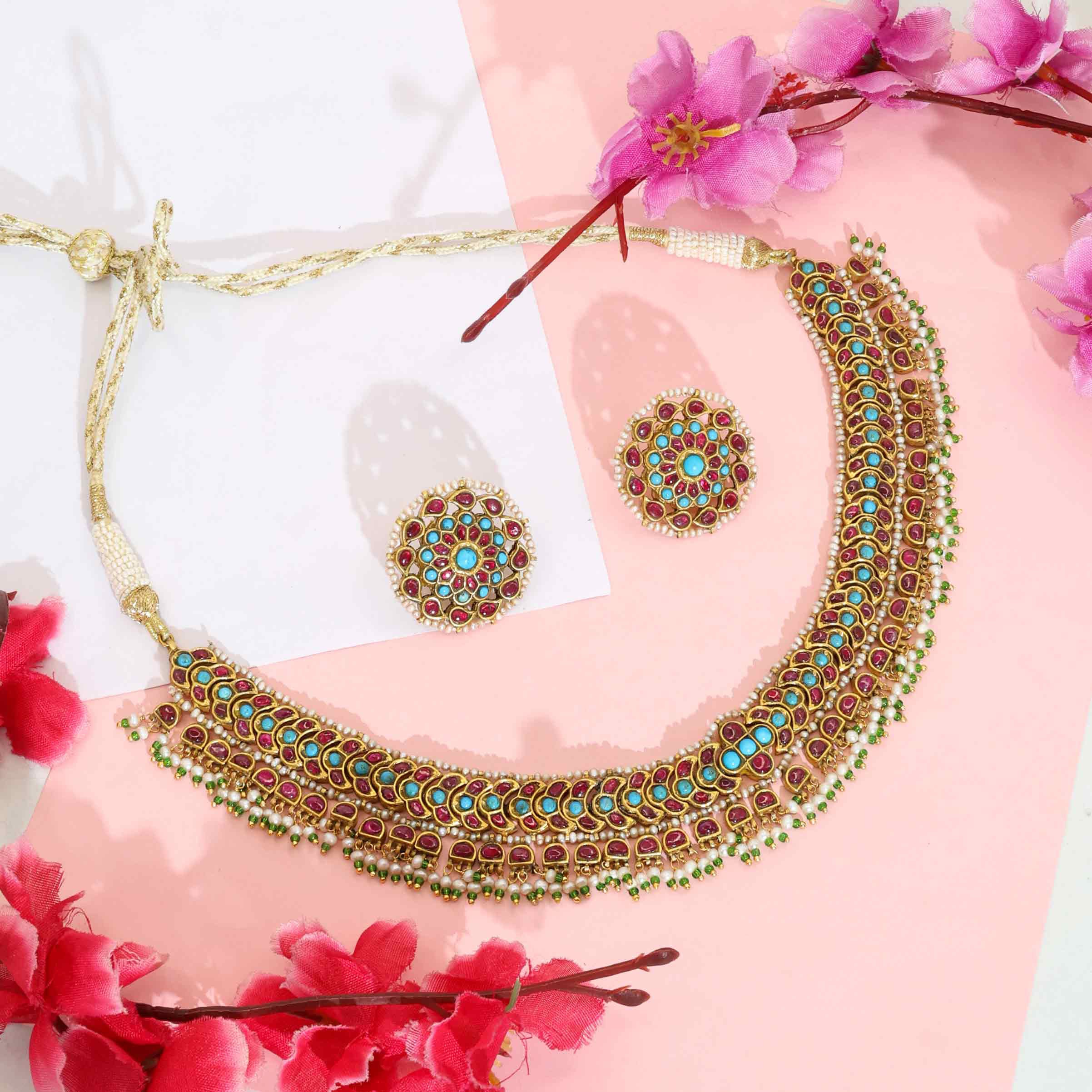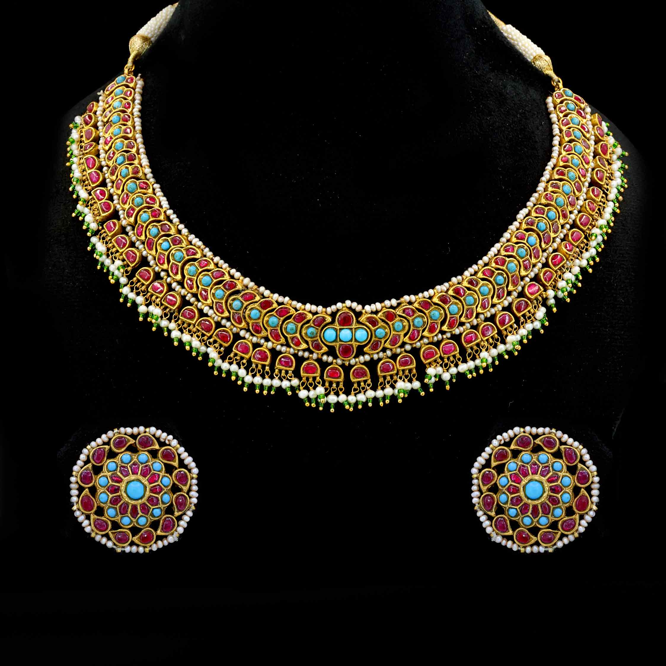 This elegant gold necklace set features a traditional design with intricate ruby and turquoise stone settings. The choker-style necklace is beautifully complemented by a pearl and gold-beaded string, while the set is completed with matching floral-inspired stud earrings.