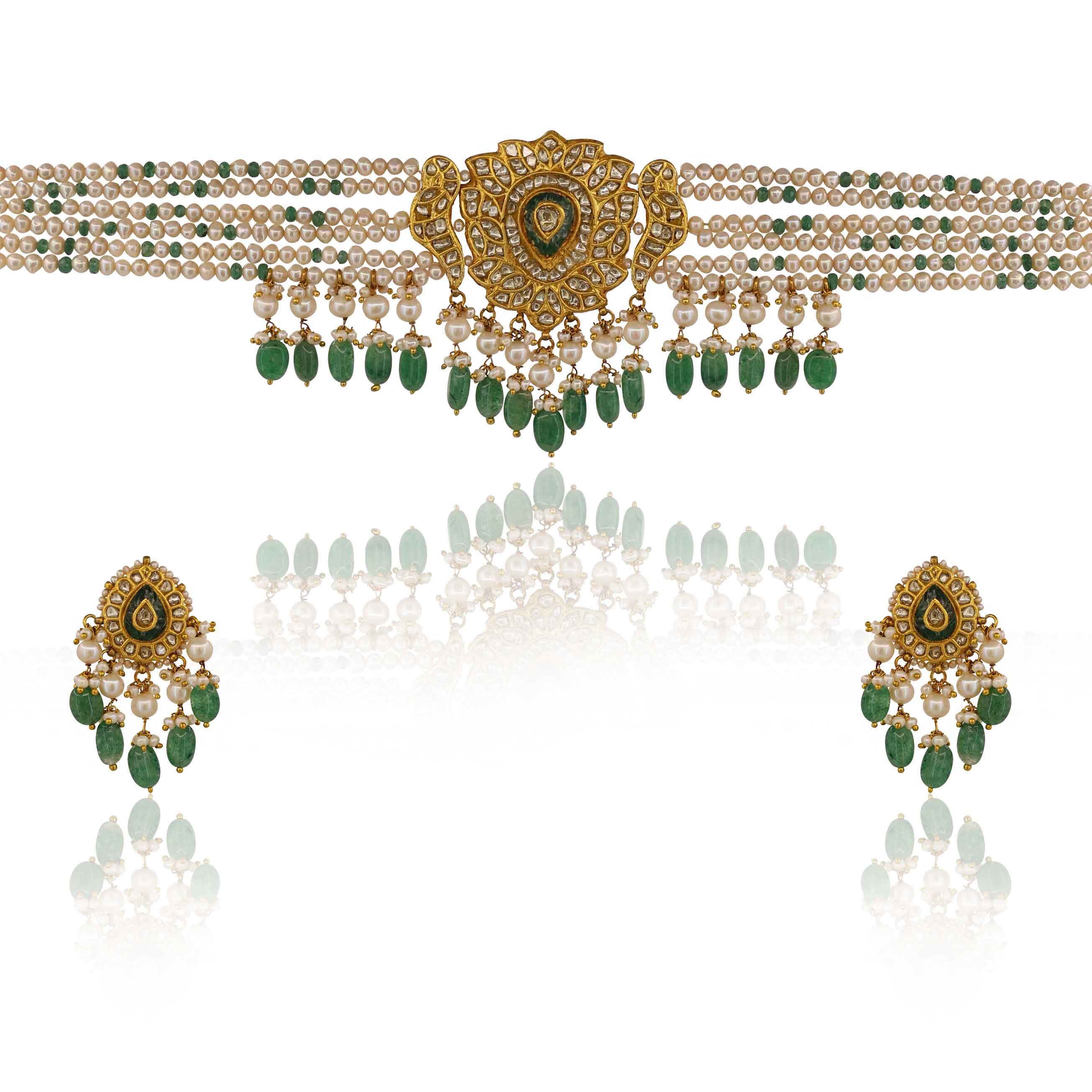 This elegant choker set features a gorgeous multi-strand pearl mala accented with emerald beads. The central Polki diamond pendant is framed by intricate green enamel work, completed by dangling glass-filled emerald and pearl drops, making it a truly regal statement set.