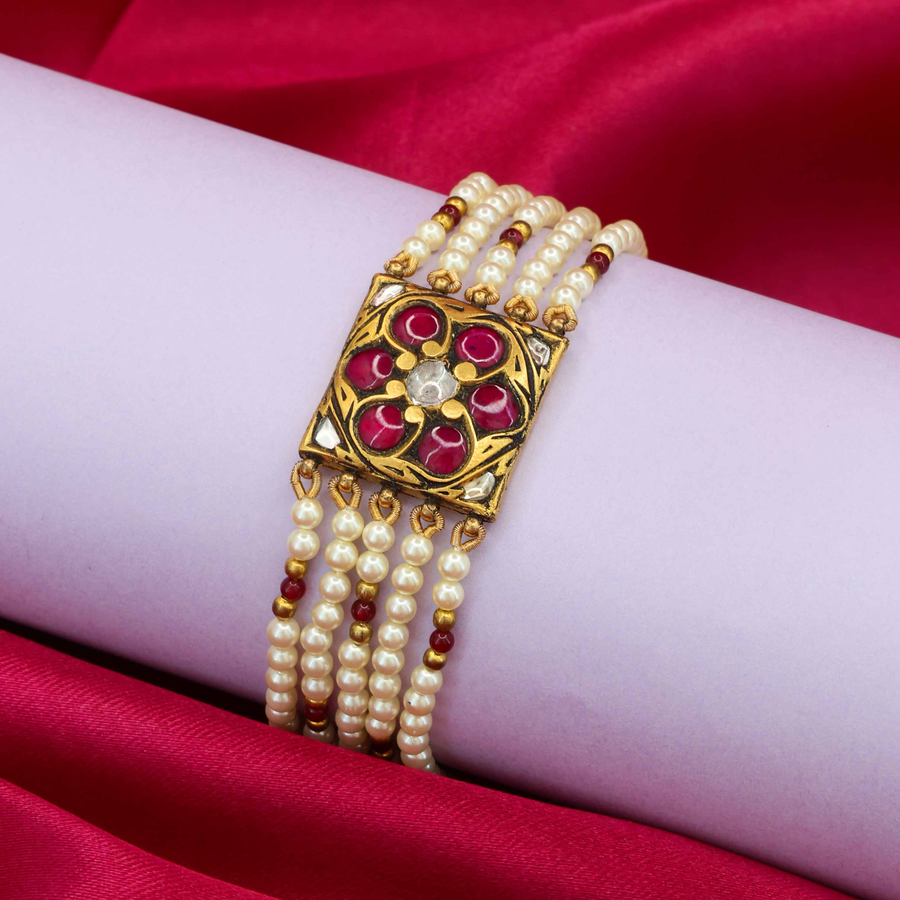 This beautiful bracelet features a central gold plaque with a detailed, vibrant red glass Beads work in a floral motif, centered around a dazzling Syndicate Polki diamond. The gold centerpiece is framed by multiple strands of lustrous pearls, accented with small red beads that complement the enamel, creating a cohesive and elegant design.