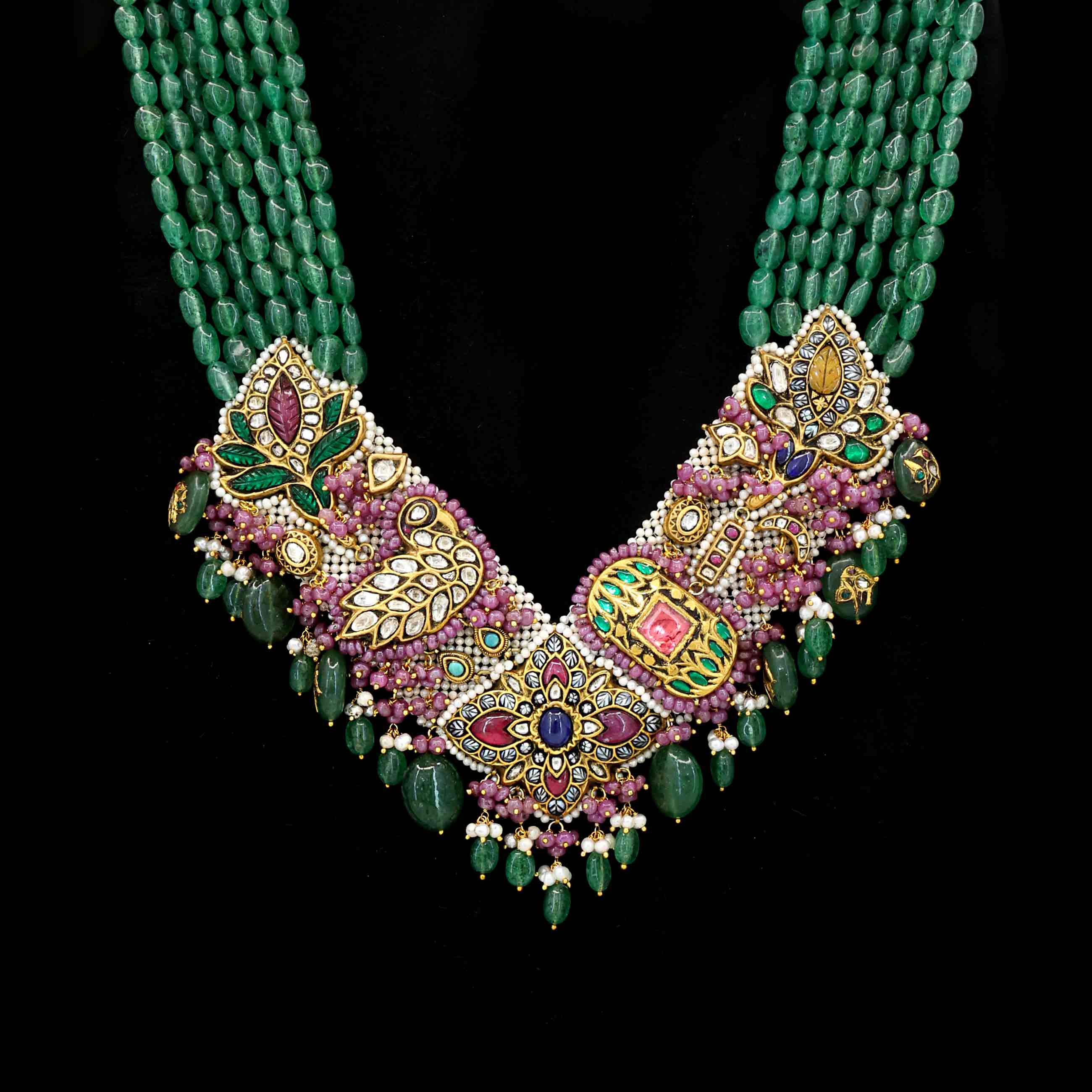 This majestic gold choker necklace features cascading strands of emerald beads leading to an elaborate central collar. The collar is lavishly set with natural Polki diamonds, multi-color gemstones (rubies, sapphires), and meenakari (enamel) work, finished with dangling emerald and ruby drops for a truly royal look.