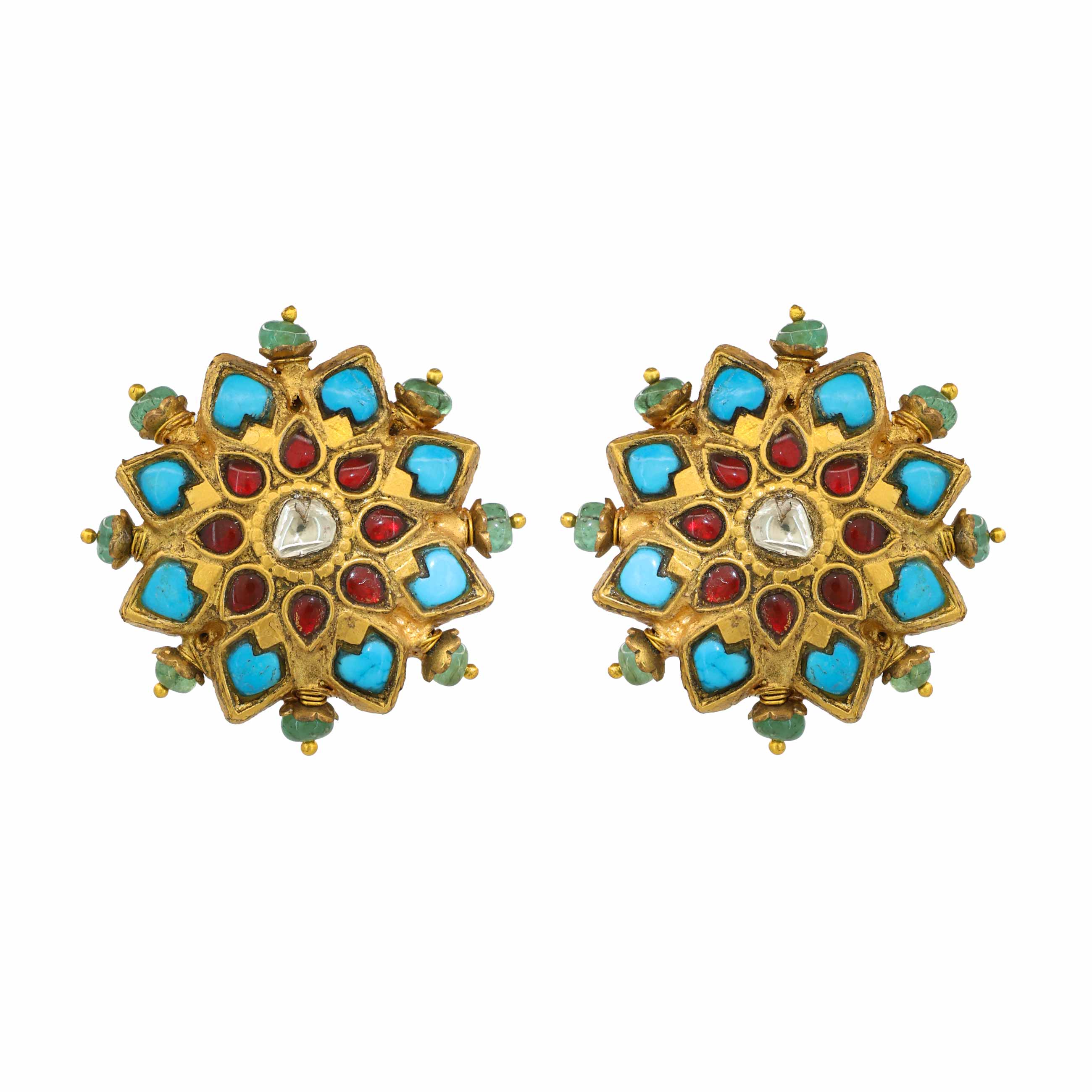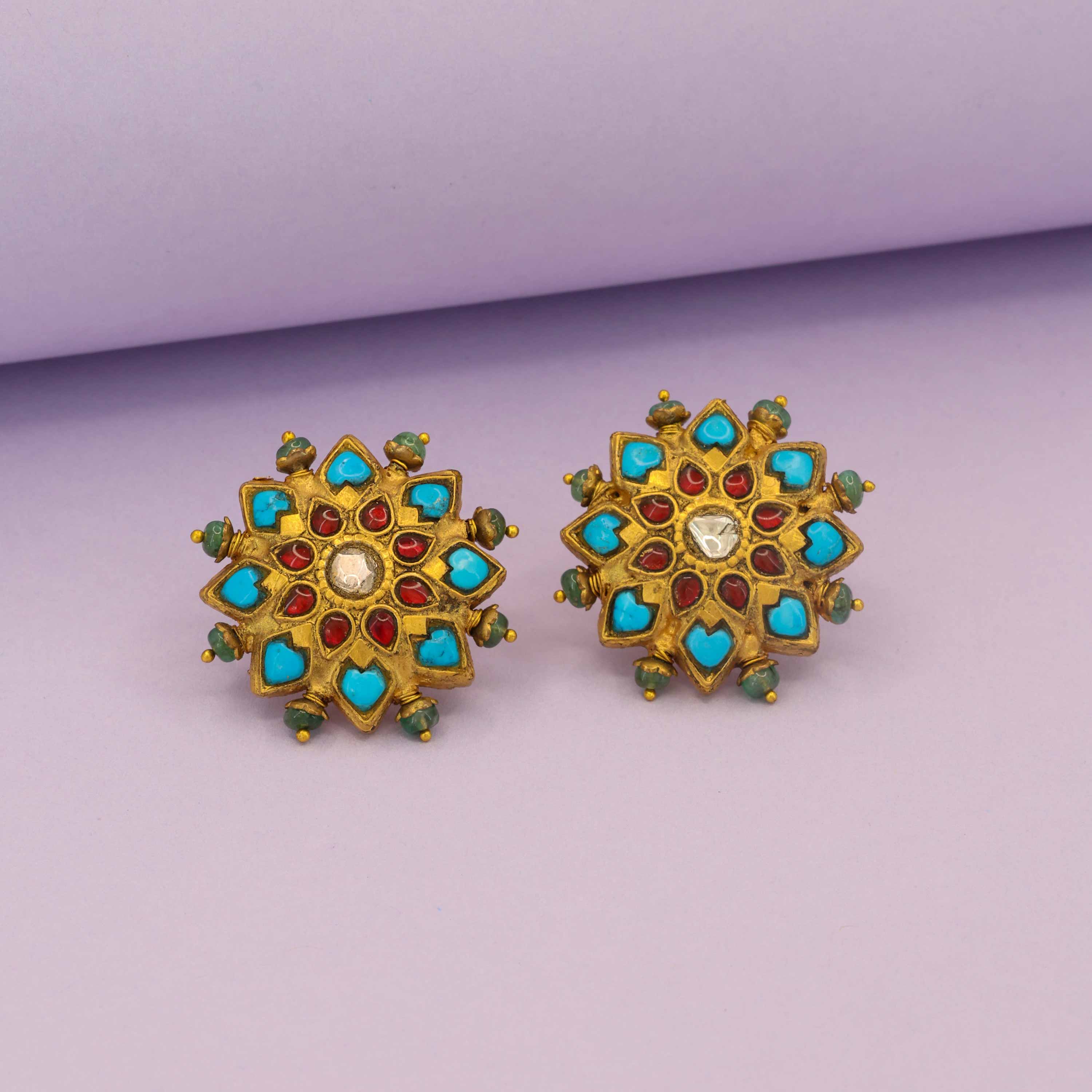 These gold stud earrings feature a stunning circular, floral-inspired design. The center is set with a Polki diamond, surrounded by alternating vibrant turquoise and deep red gemstones. The intricate gold setting is further embellished with small Green Stone beads around the outer edge, creating a rich and colorful, traditional look.