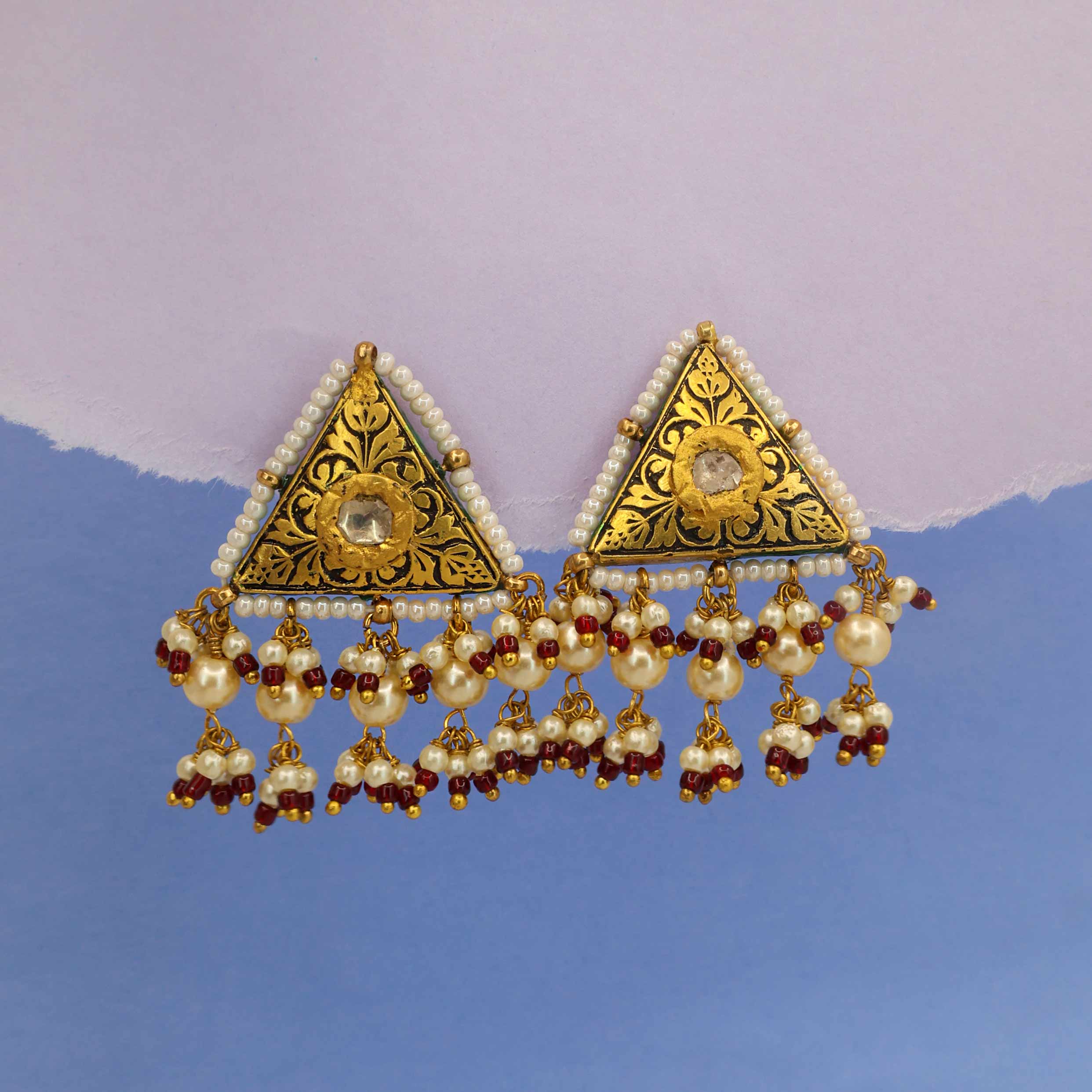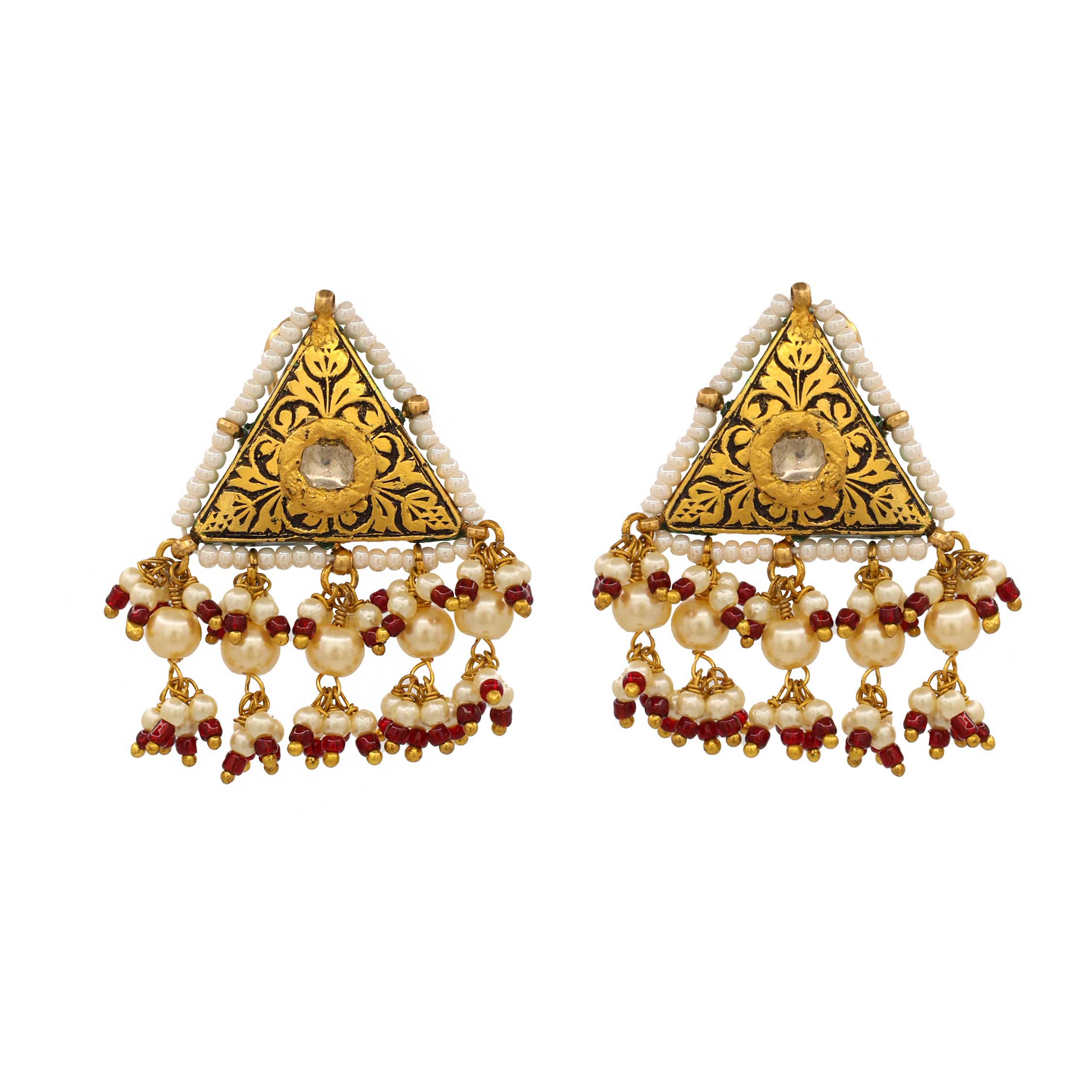 These striking triangular earrings feature intricate Chitai (hand-chased) gold work with a central Polki diamond. The gold design is outlined with black Oxidized and a border of delicate pearls. Dangling from the base is a fringe of lustrous pearls and deep red ruby beads, creating a beautiful and traditional chandelier style.
