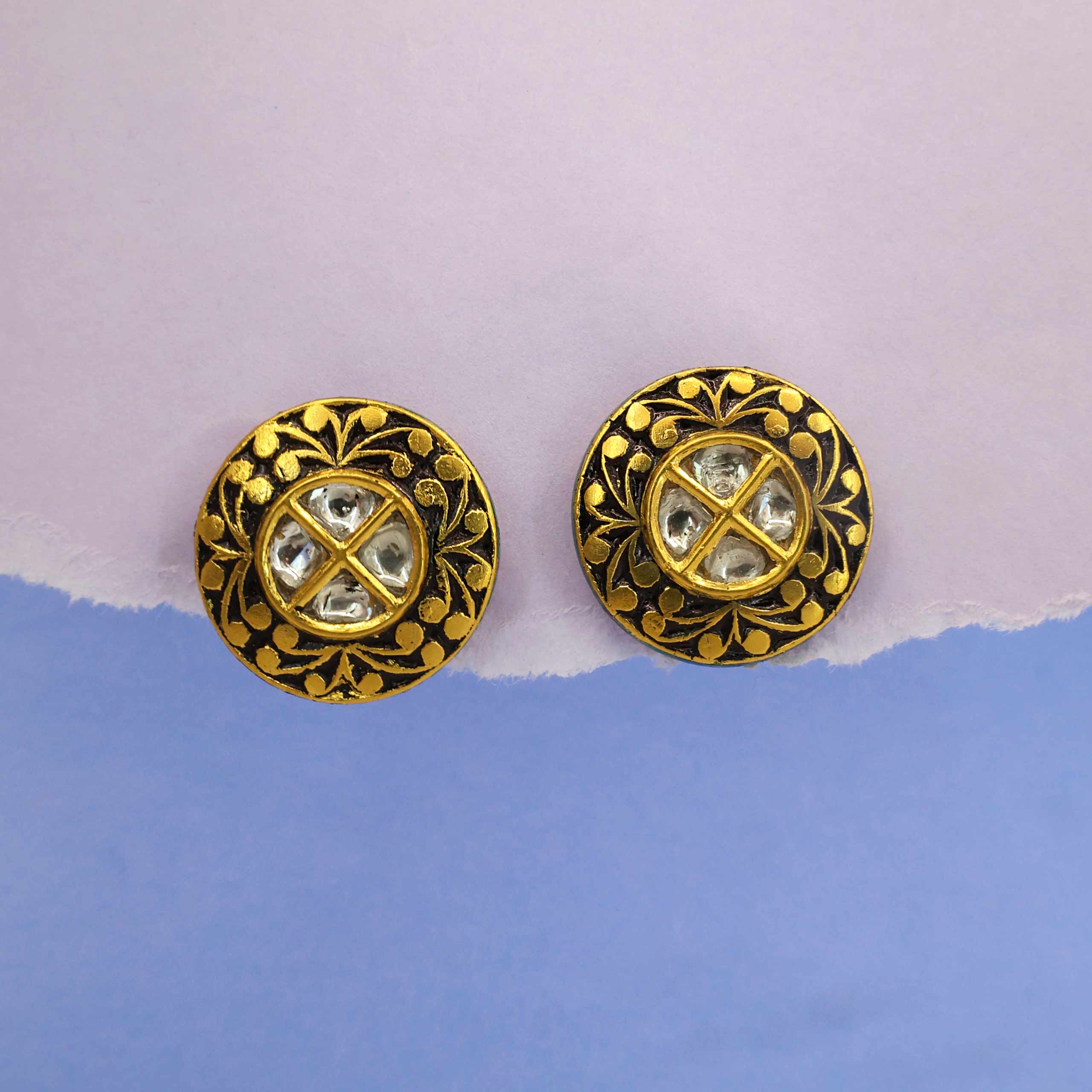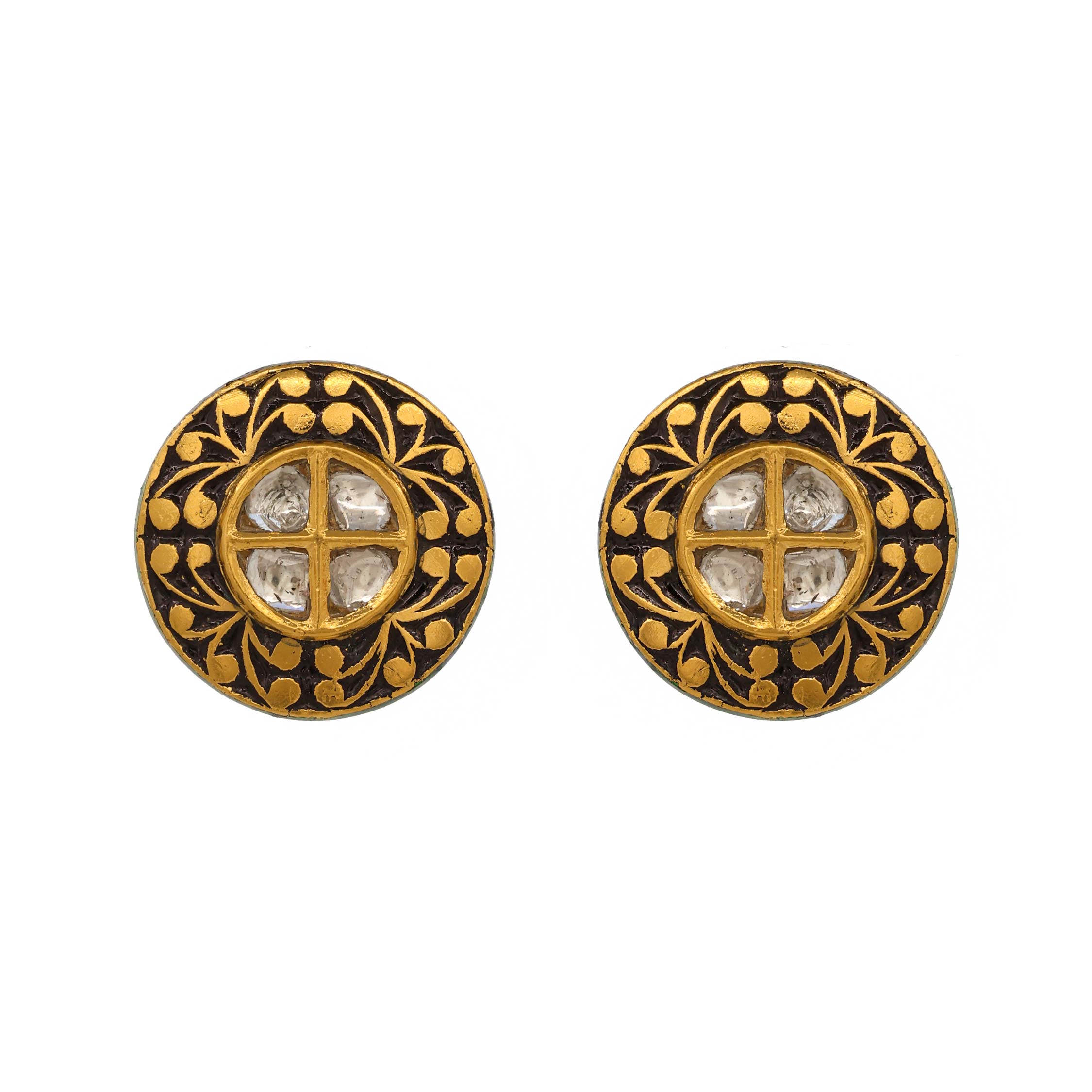 These striking earrings are crafted from gold and feature a central Polki diamond set in a four-petal motif. The surrounding gold is beautifully detailed with traditional black Partash work, which creates an elegant contrast against the bright gold and the raw diamond. The design is a perfect blend of classic elegance and intricate craftsmanship.